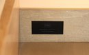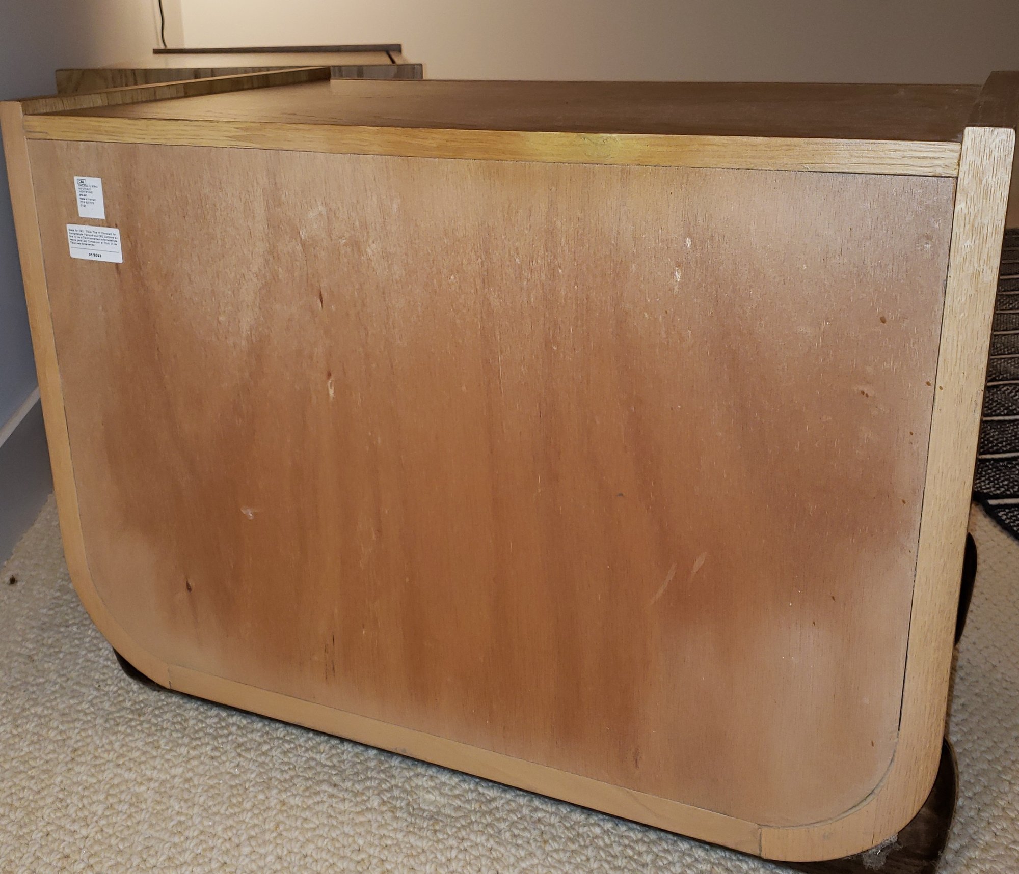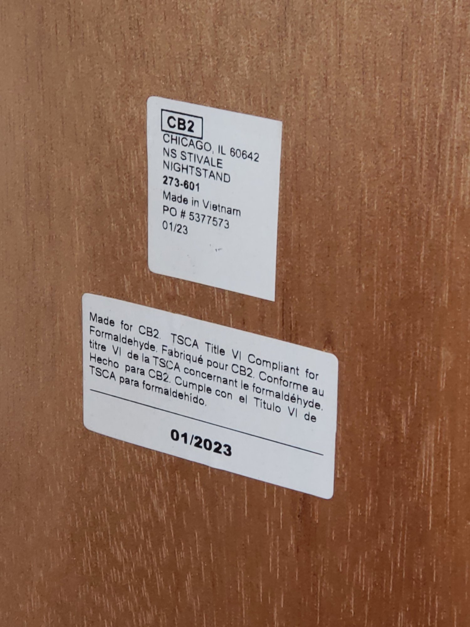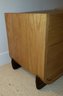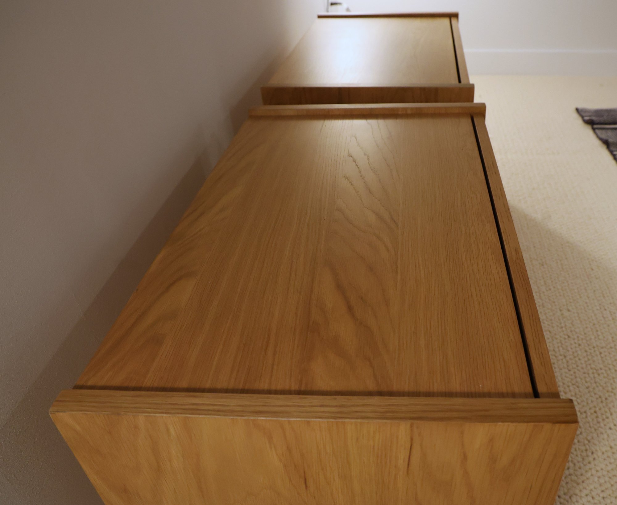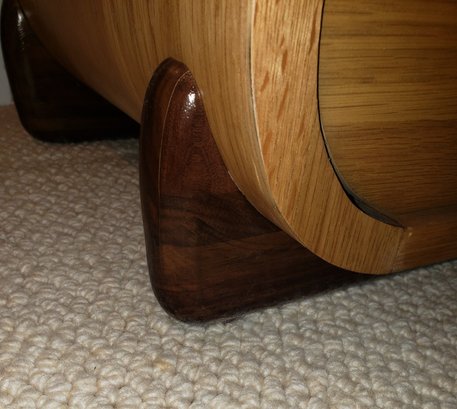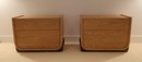 End/night stands designed by Jannie Ellenberg in two types of wood. Natural oak veneer frame is set off by high gloss walnut legs at it's curved base. Two spacious push to open drawers. Crate and barrel did a great job with these very sturdy stands.
