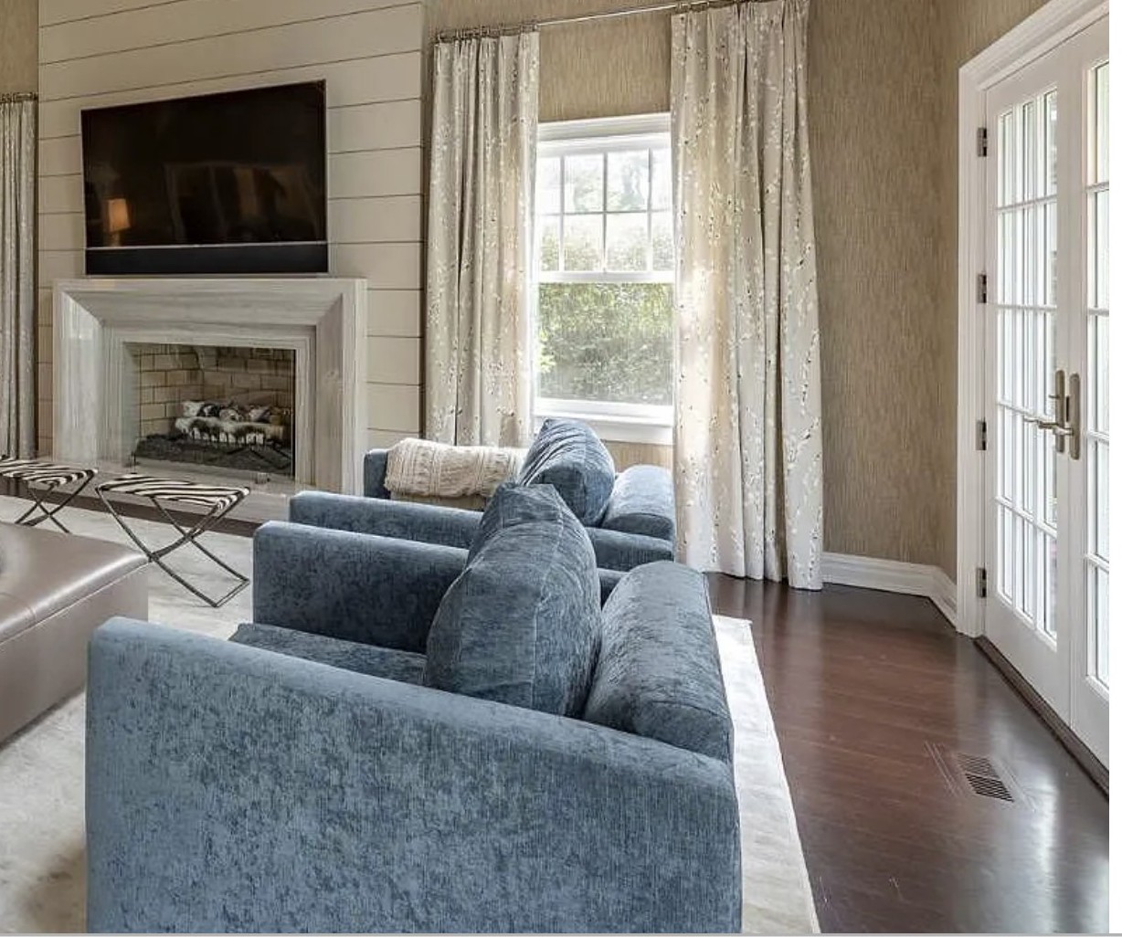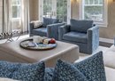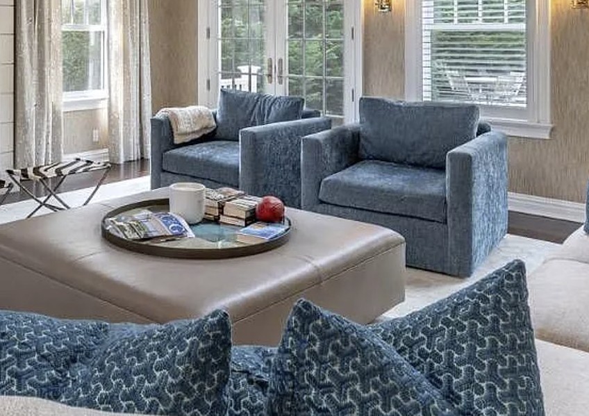 Pair of custom swivel chairs upholstered in plush denim blue/gray fabric, complemented by two feathered pillows with zippers. They feature a stylish modern shape and offer excellent comfort. In nice condition—please call for mover's information. Dimensions: 39.5" depth, 41" arm to arm, 18" floor to seat, and 30" back height.