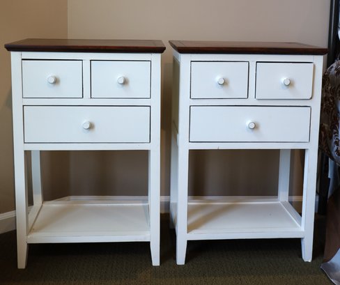 Pair of white with cherry style tops with 3 drawers.