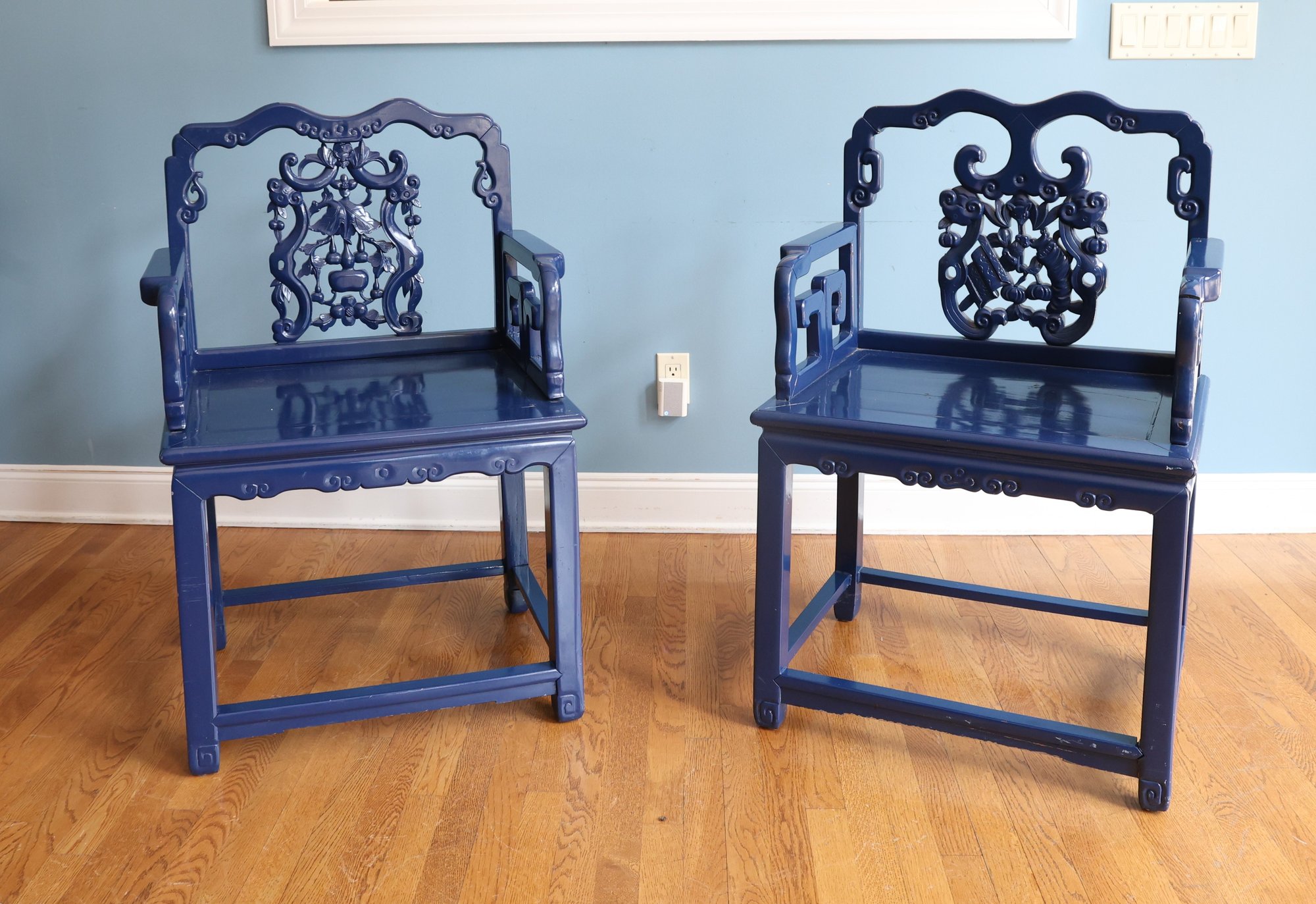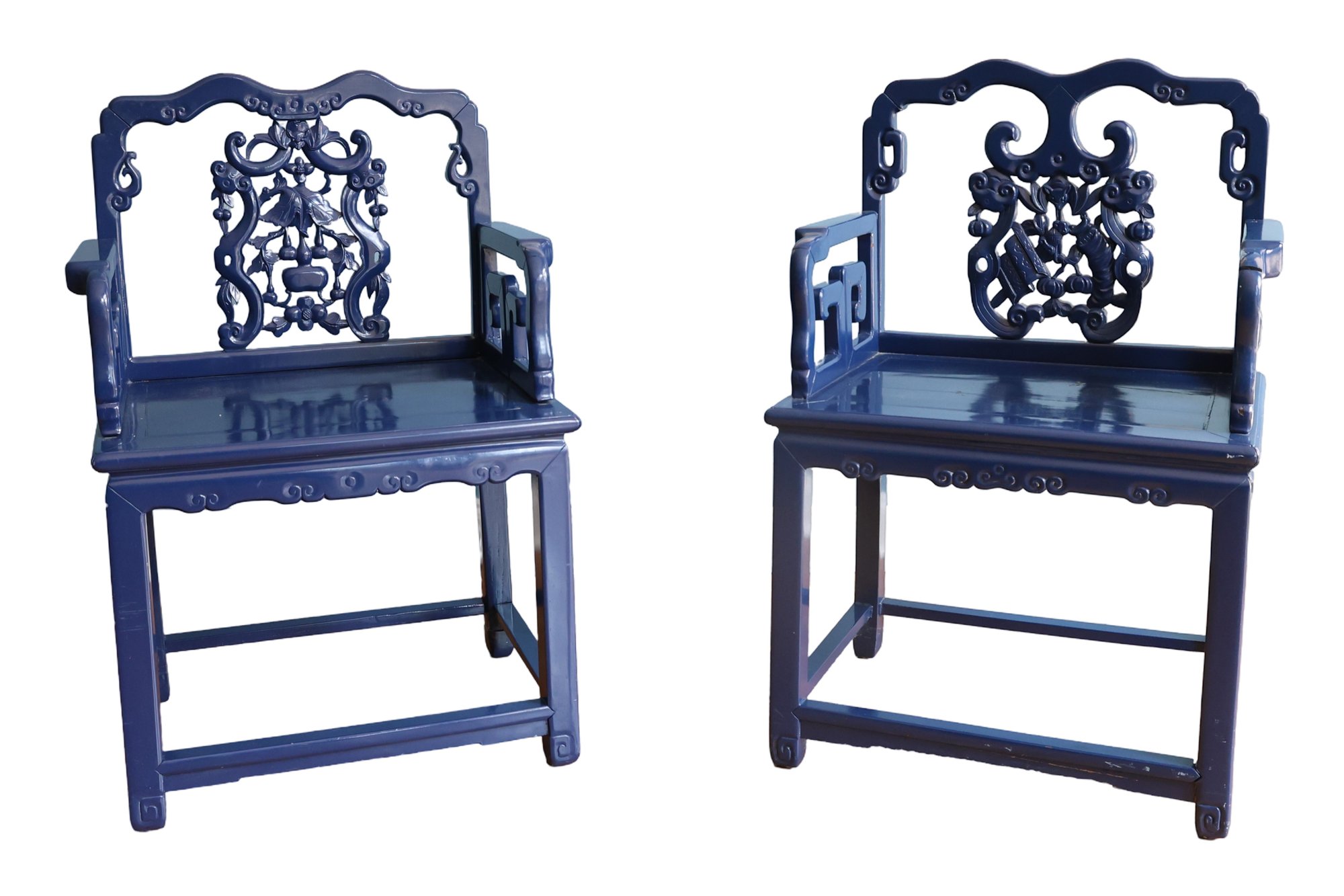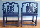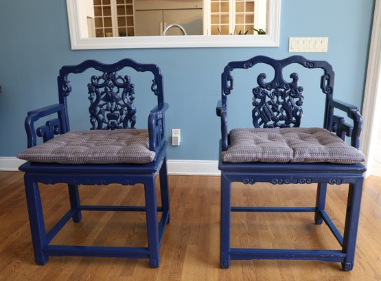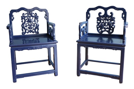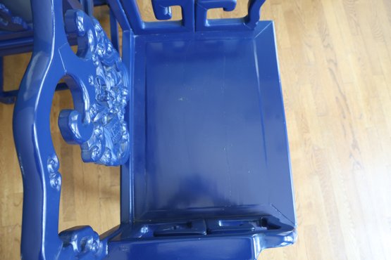 These beauties have been professionally done in cobalt blue laquer onto wooden chairs. Hand carved possible Hongmu wood. Wonderful bat motif (Lucky)