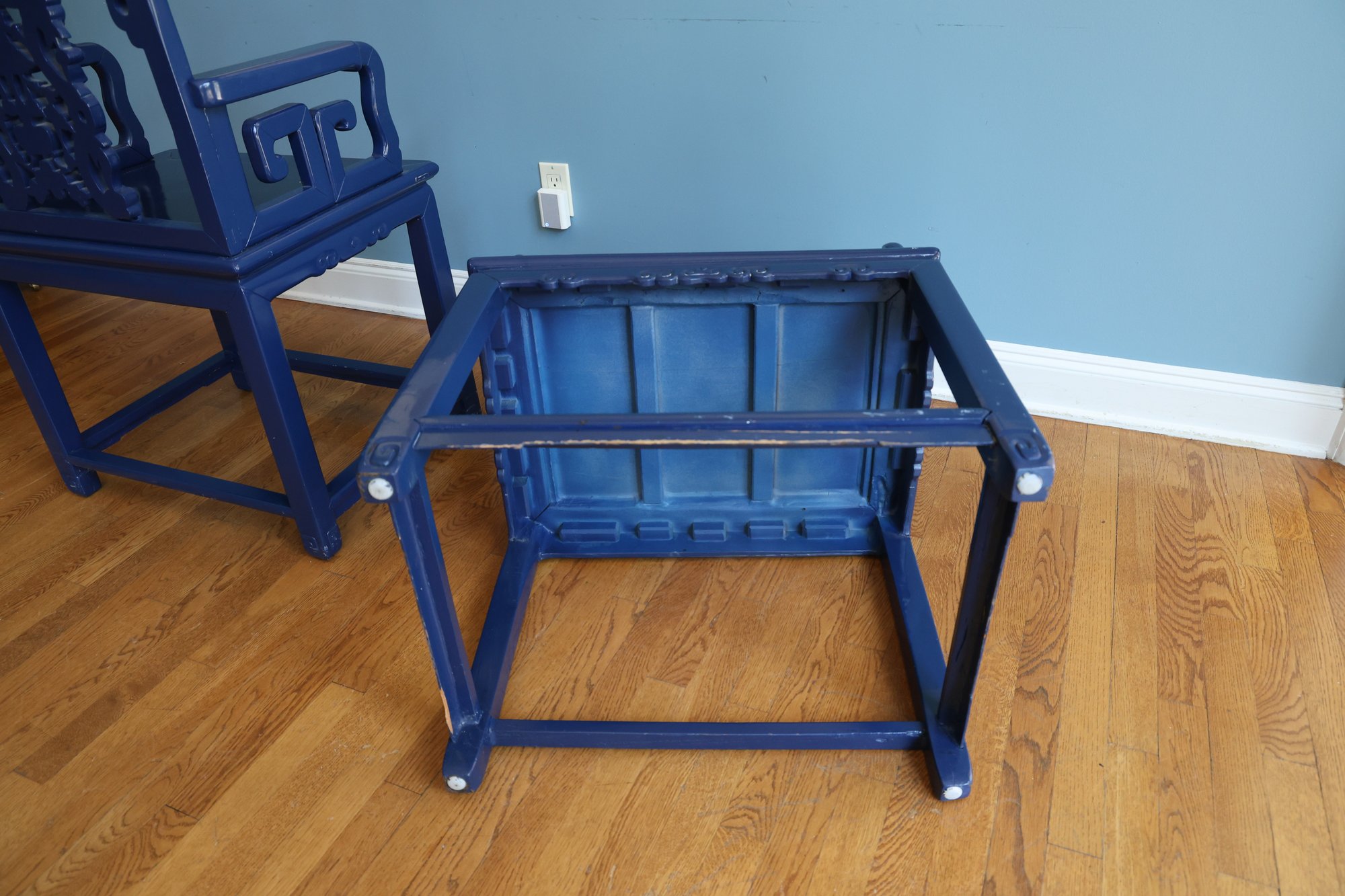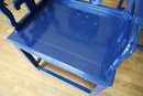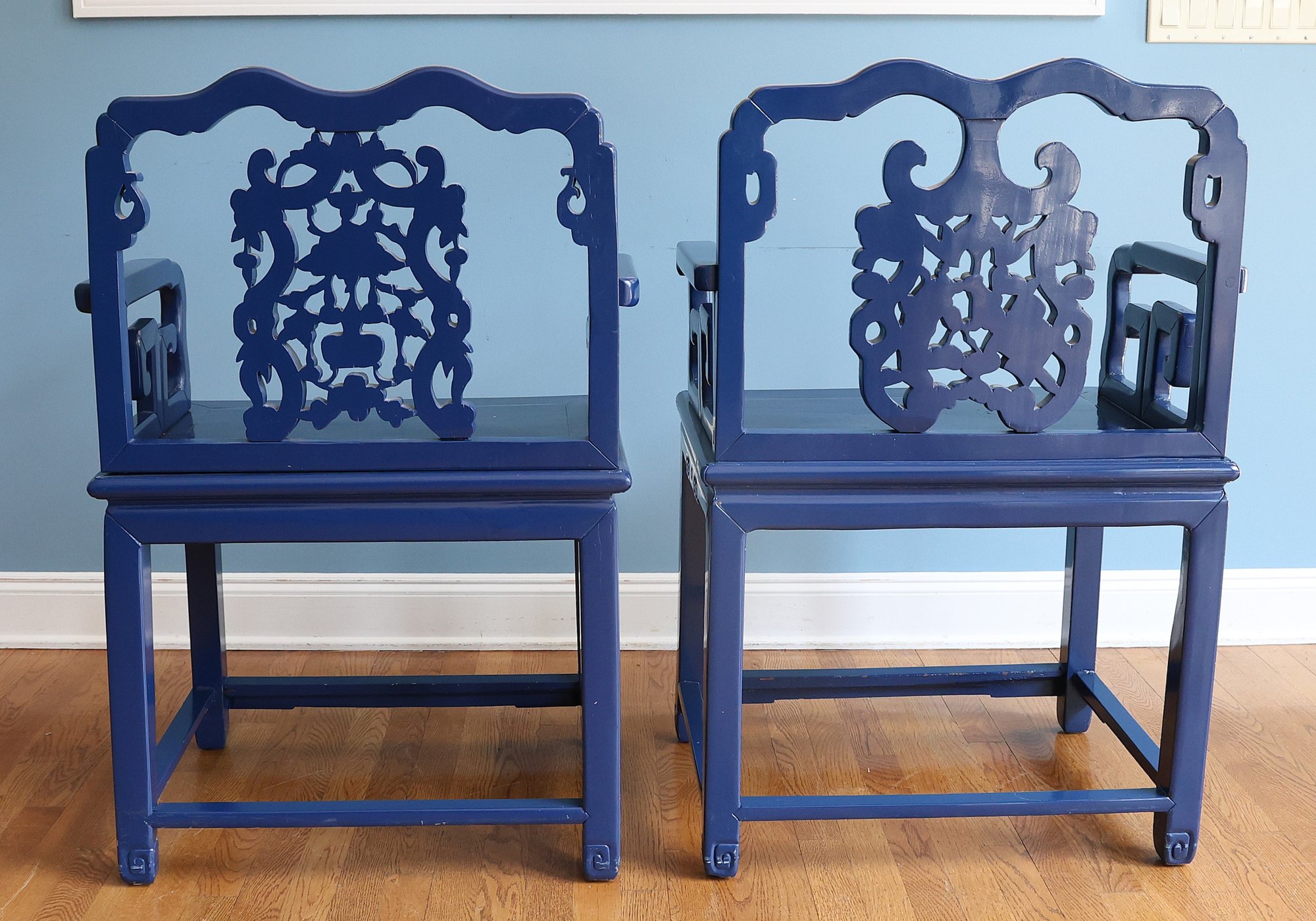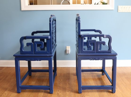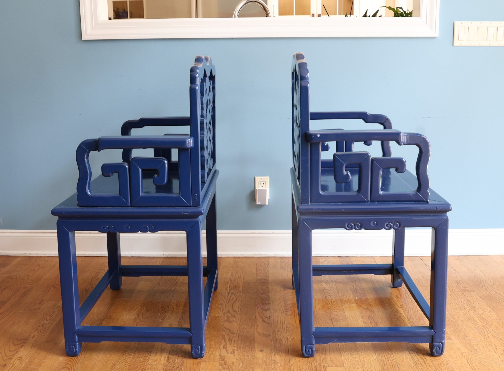 These beauties have been professionally done in cobalt blue laquer onto wooden chairs. Hand carved possible Hongmu wood. Wonderful bat motif (Lucky)