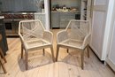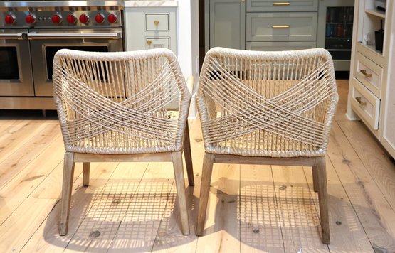 Pair of solid teak wood armchairs with handwoven weather resistant rope, offering durability and elegance. It's ergonomic design with armrests and soft seat is a true comfort from Australian company . Perfect for indoors or outdoors. Natural solid teak. Comes with two cushions