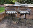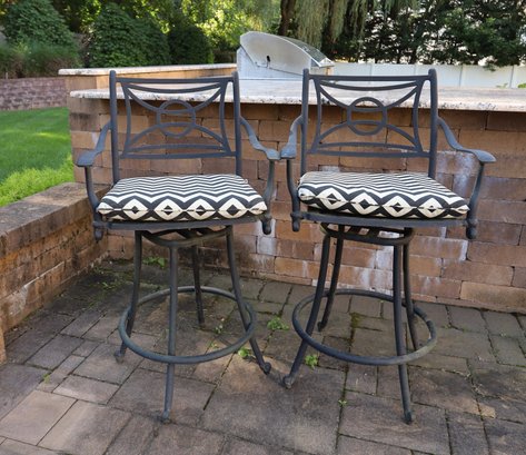 Pair of patio bar stools. Bronze cast aluminum stools with custom made cushions with zig zag fabric and black moss fringe.