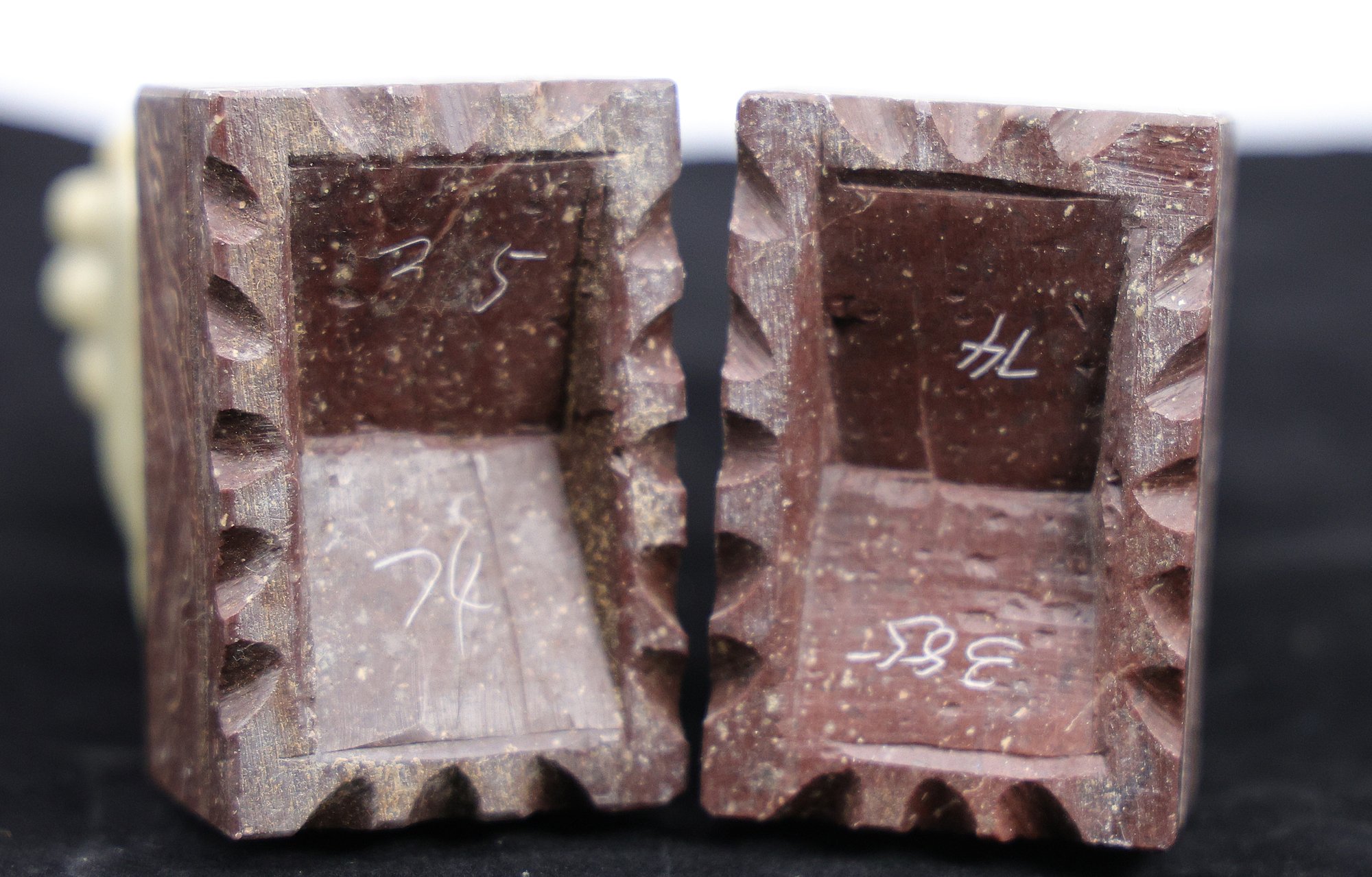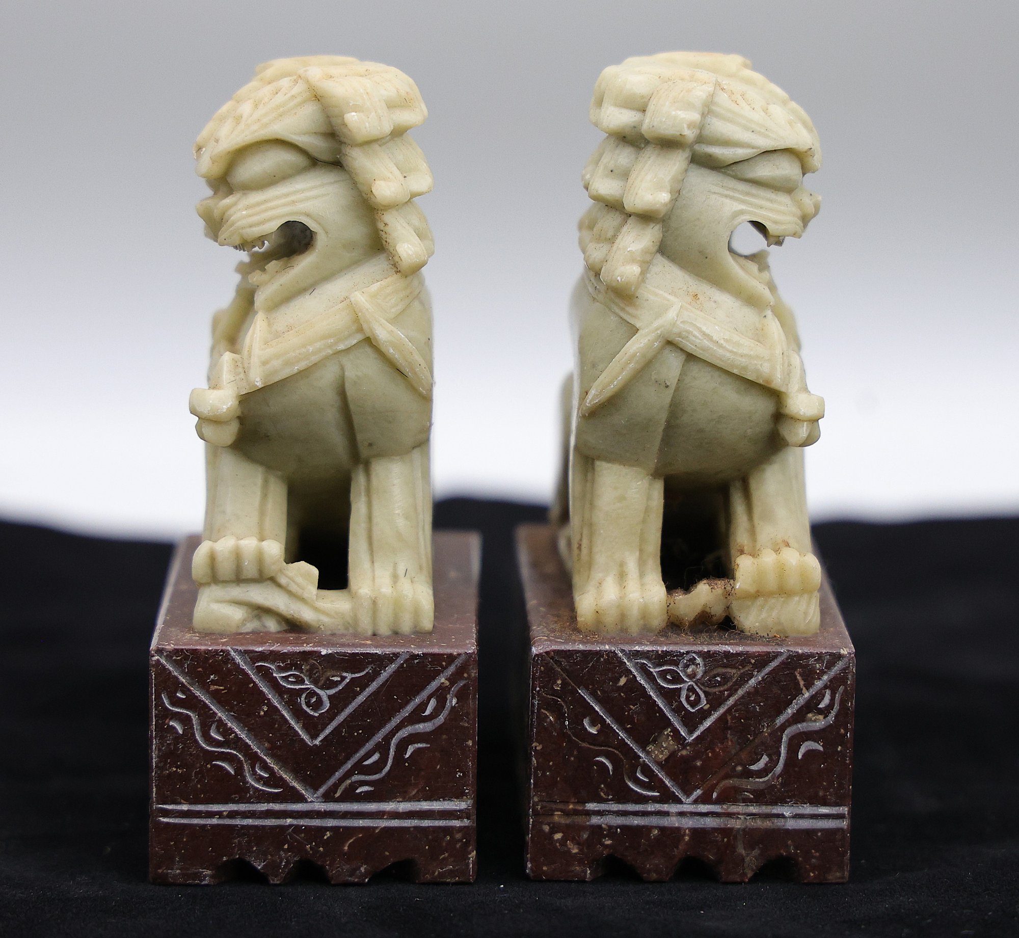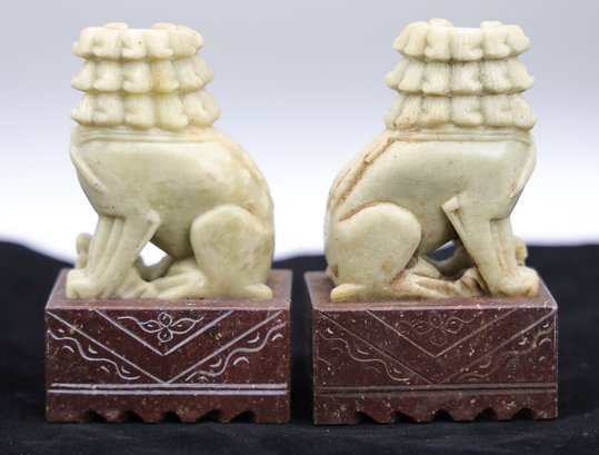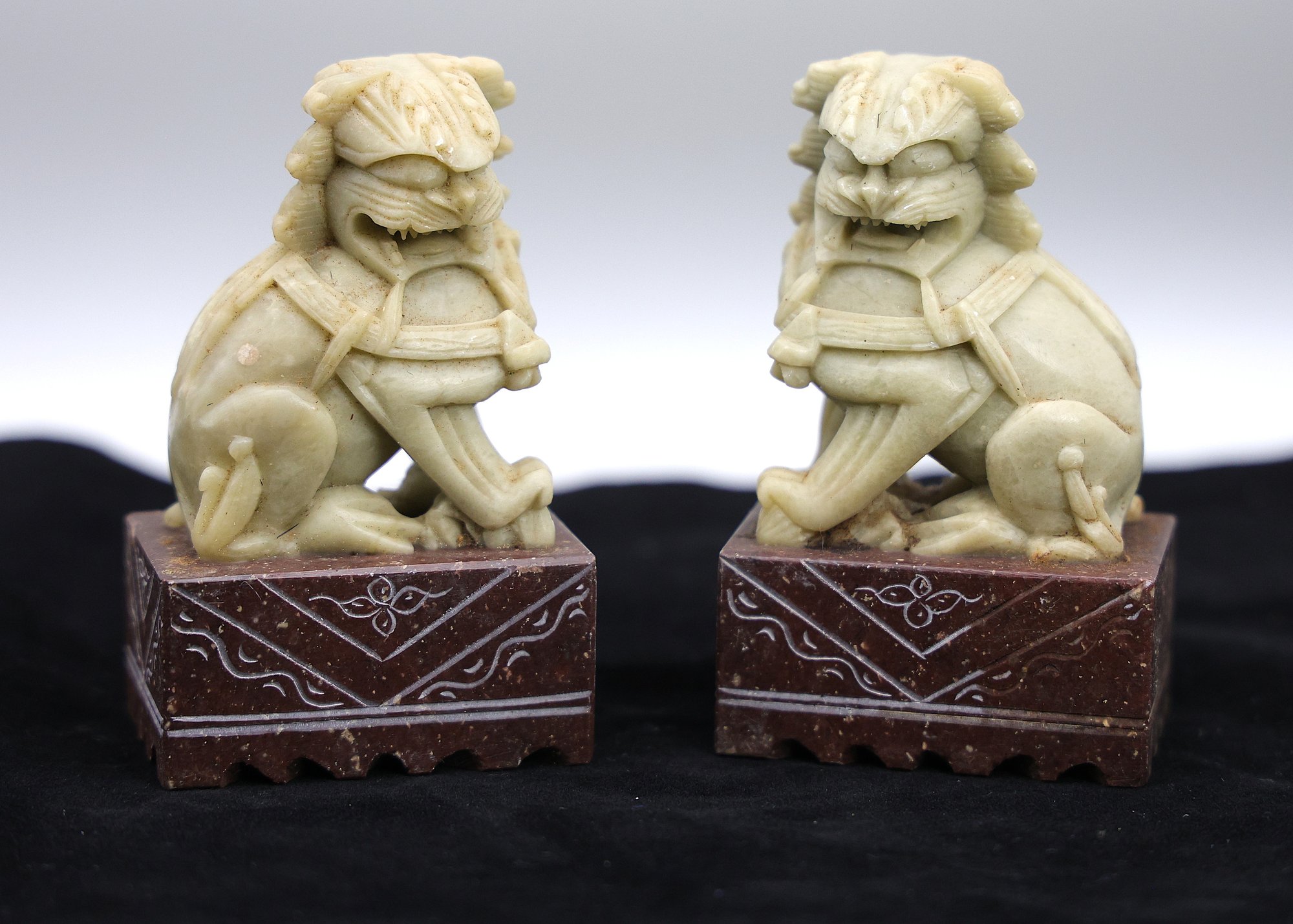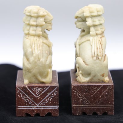 A pair of Foo dogs in nice condition, carved from soapstone and featuring stone bases. 3.5"H
