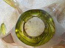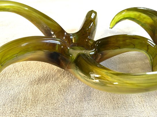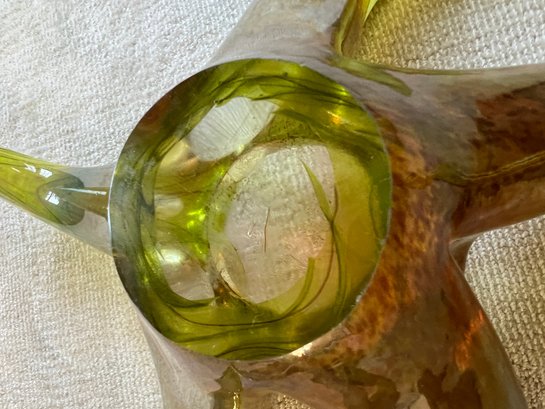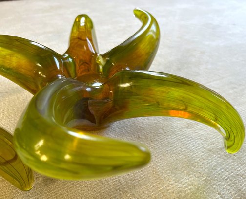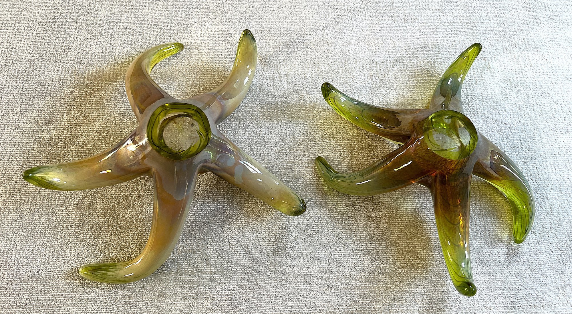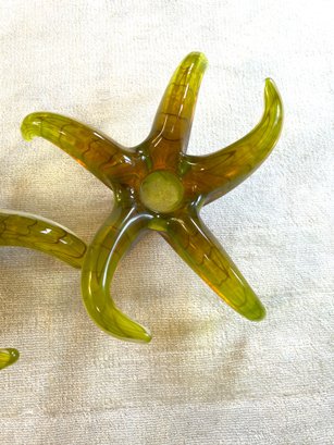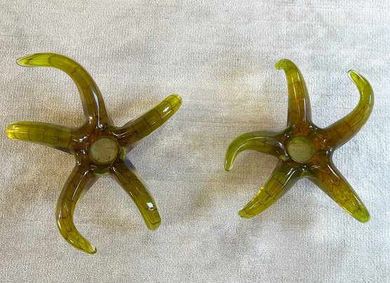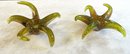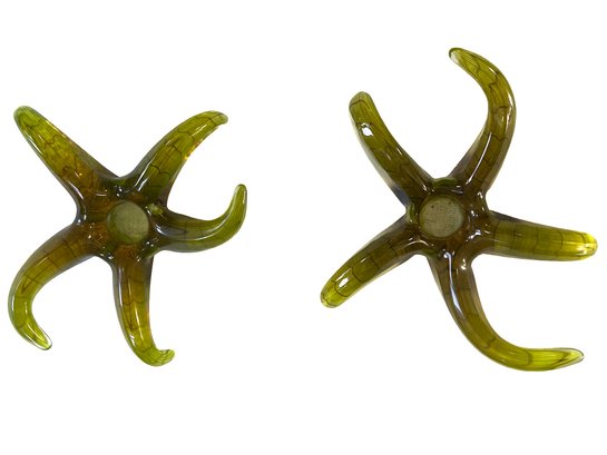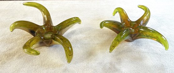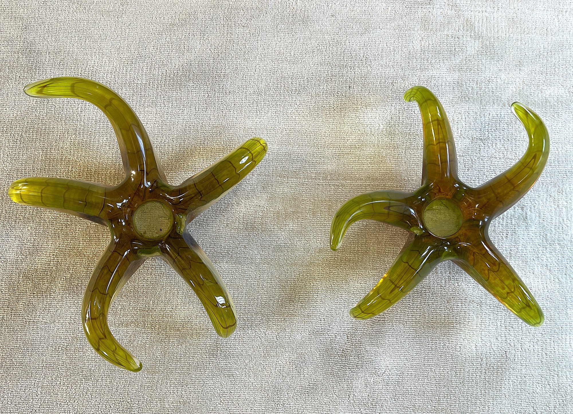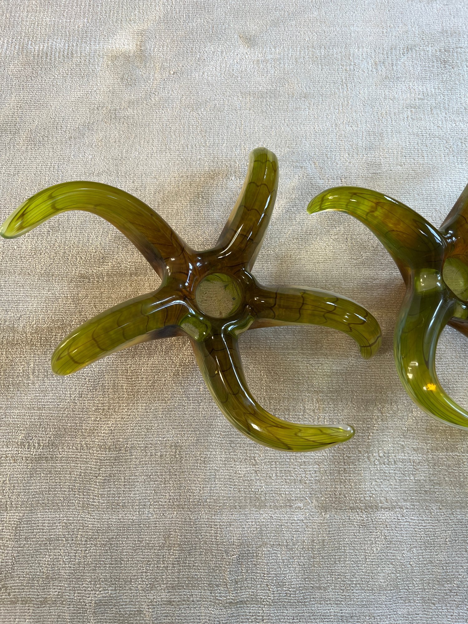 pair Waterford crystal starfish sculpture votives/candleholders in an olive-green swirl.