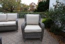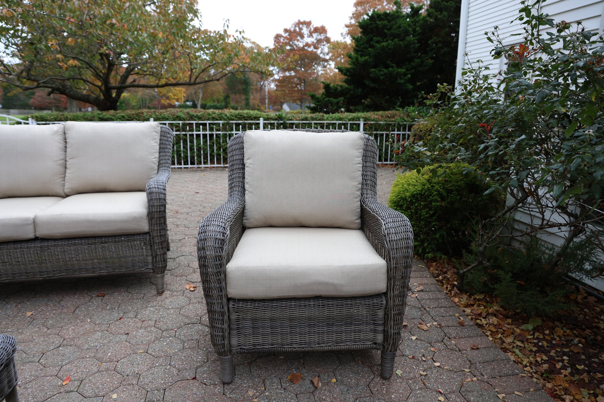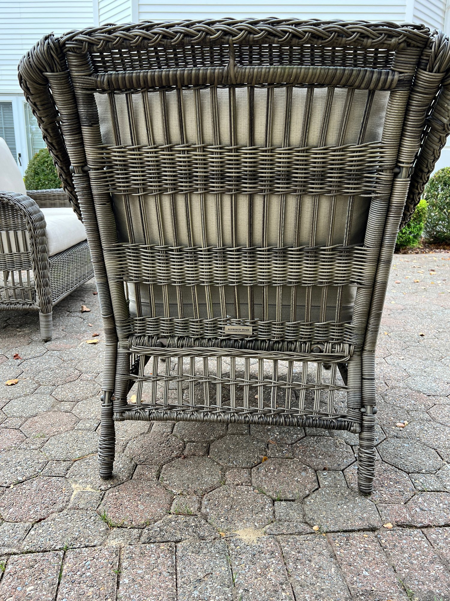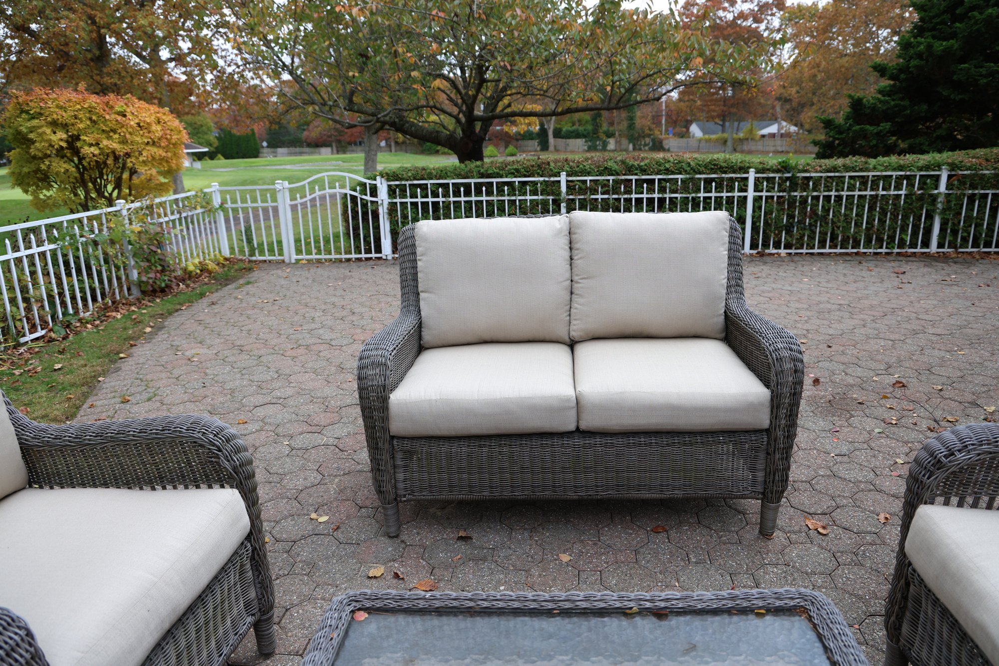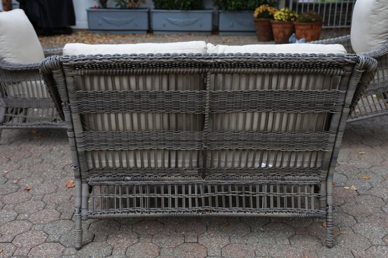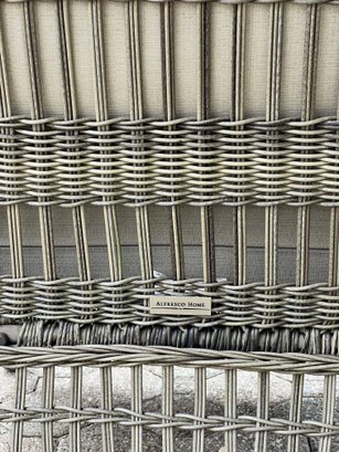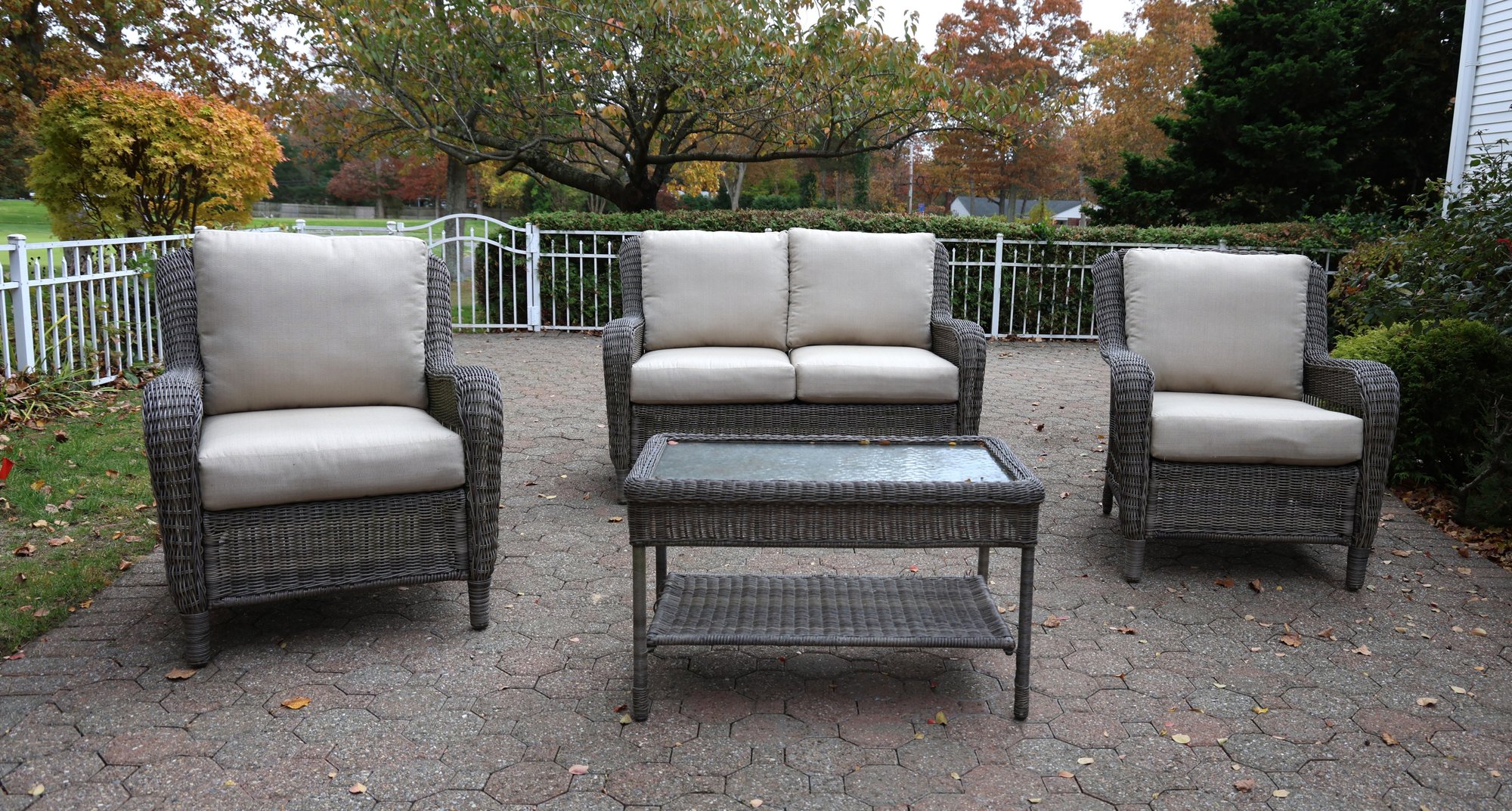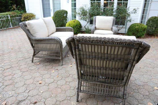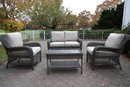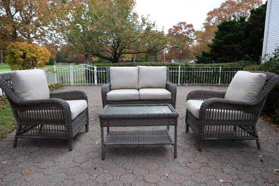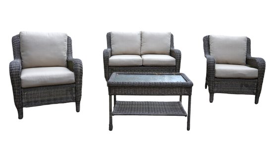 Alfresco home all weather 4-piece patio set with cushions. It comes with two chairs, a loveseat, and a wicker-woven table, both on powder-coated steel frames for maximum durability.