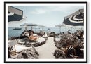 By Wheeler family, a father and son travel photography duo. The photograph captures a scenic view of the famous La Fontelina beach club in Capri, Italy, known for its iconic blue-and-white striped umbrellas and Mediterranean atmosphere. Great beach scene!