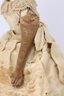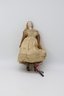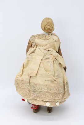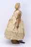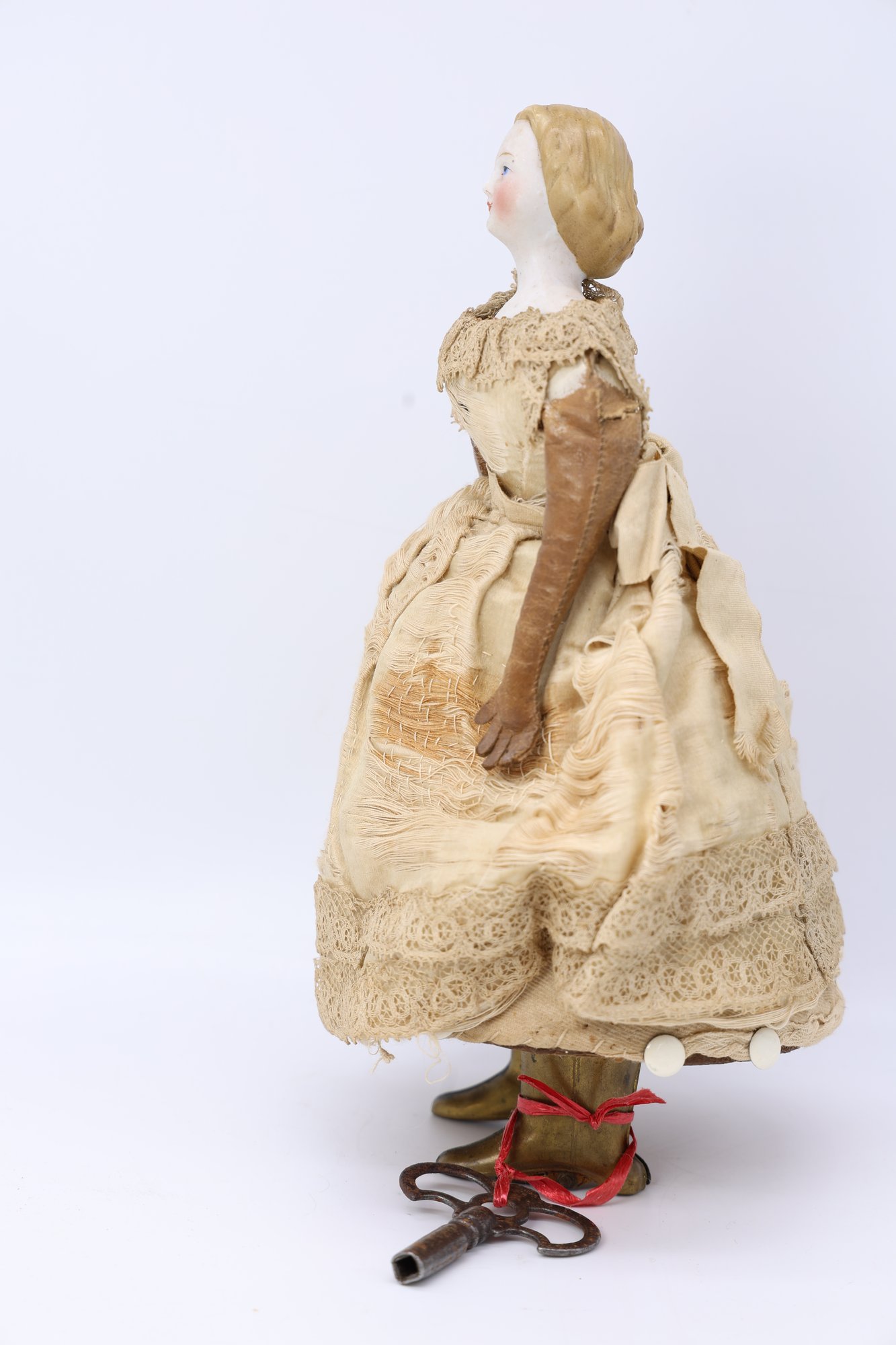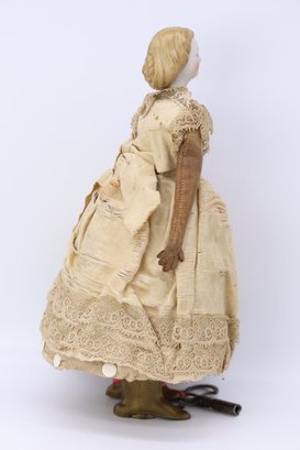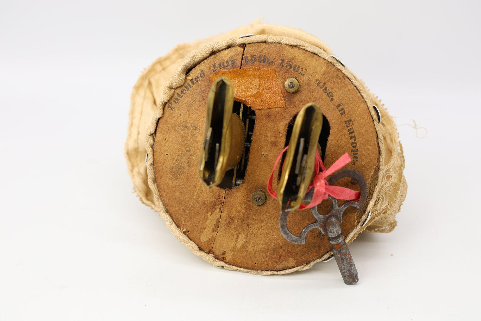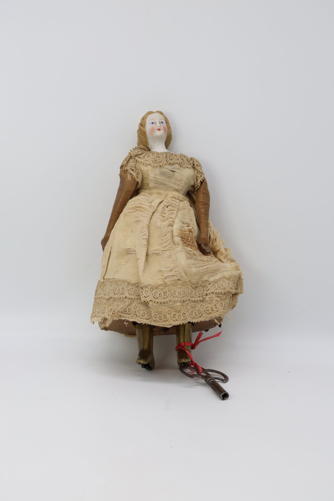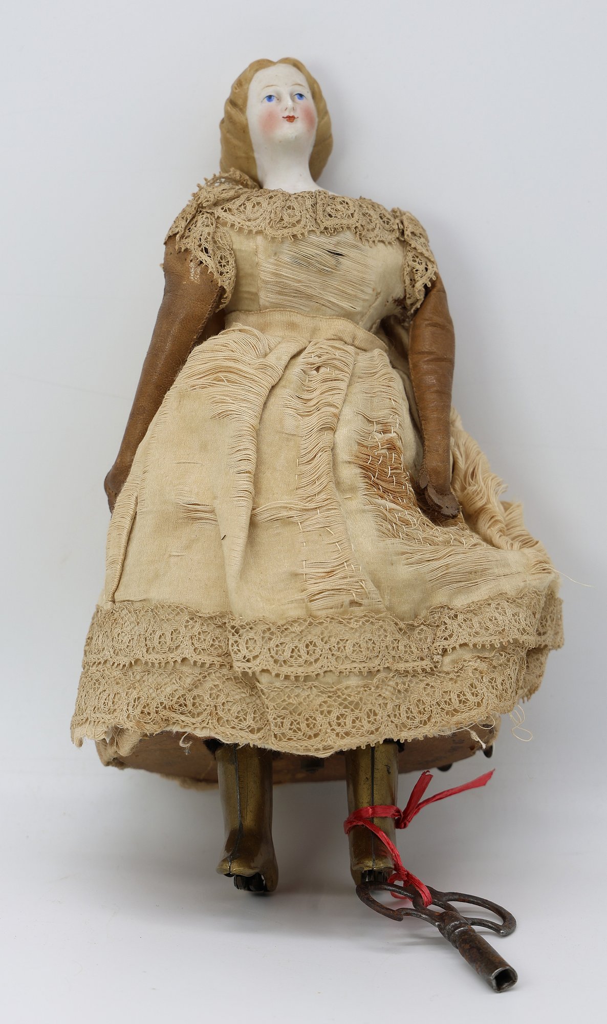 She has a porcelain face, leather arms, and brass boots that move back and forth. The key winds are working when tested. The bottom says patent 1862, and the cardboard surrounds the body. She is GREAT!
