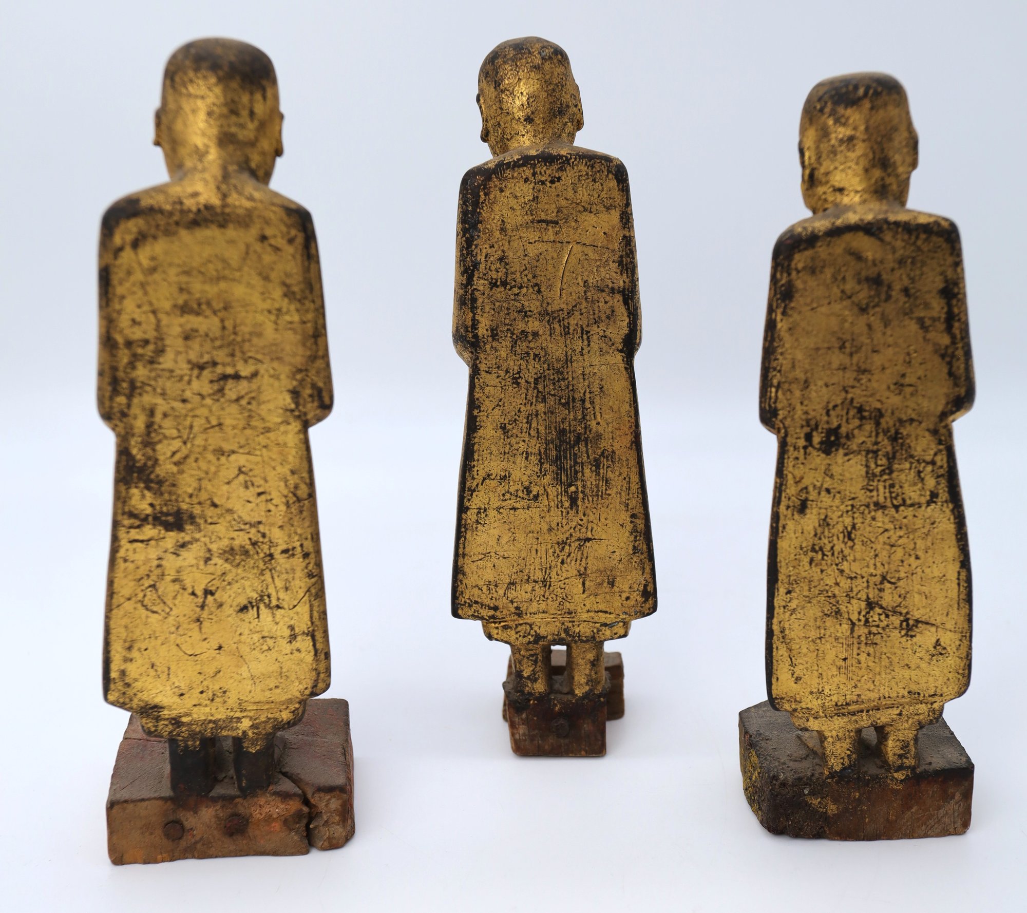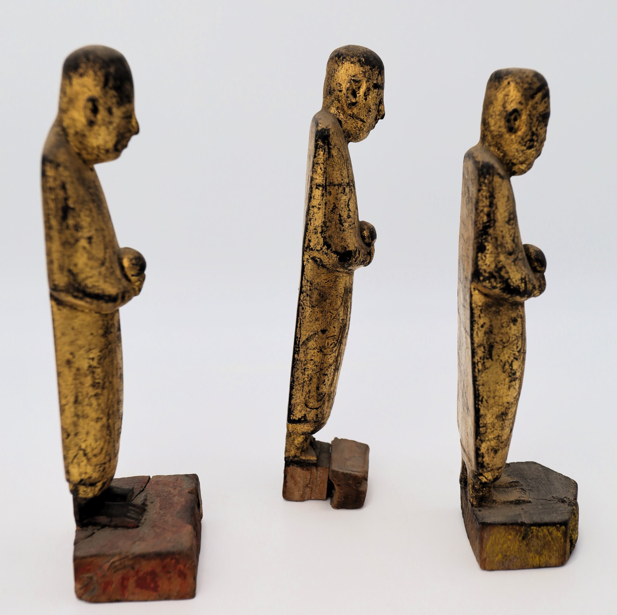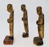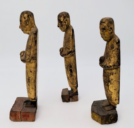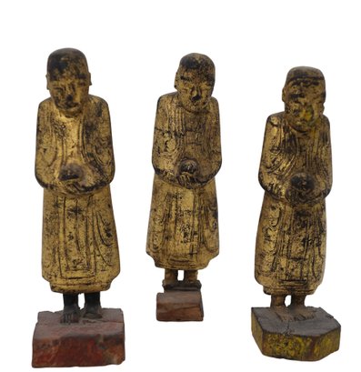 Ancient Set Of 3 Buddhist Monks carved wood and gilded. Some damage, 1 foot missing on one -another has no feet-one in great condition. Very old 7"H