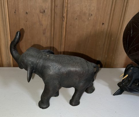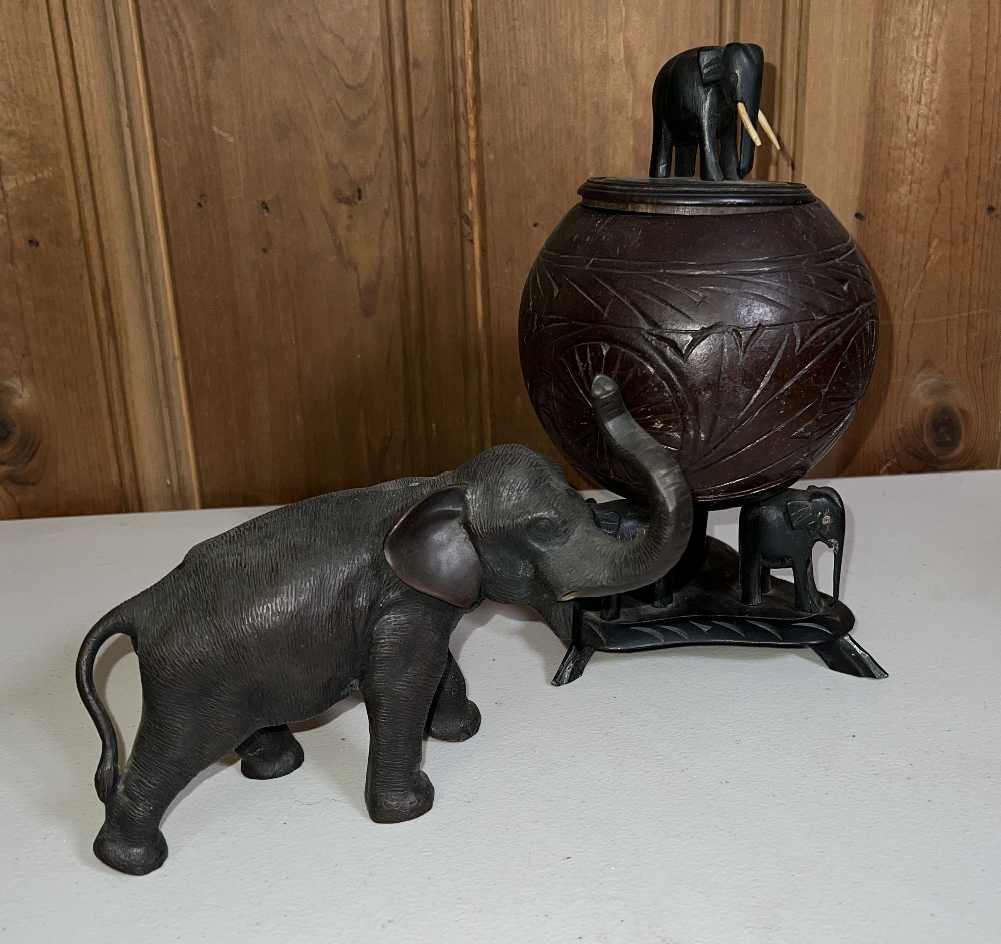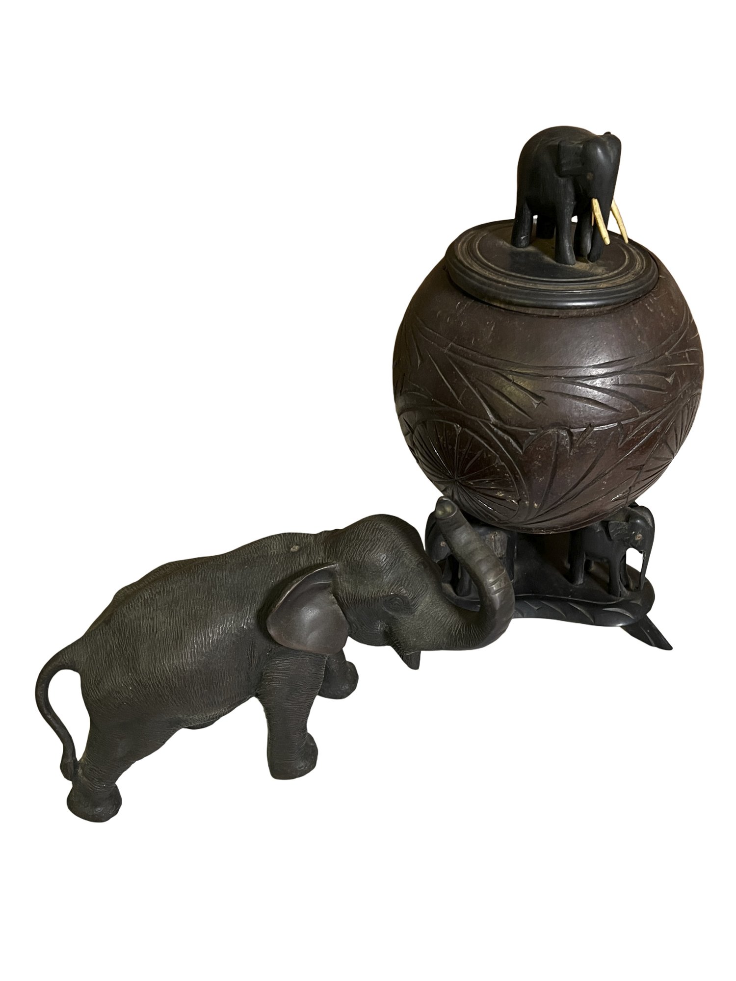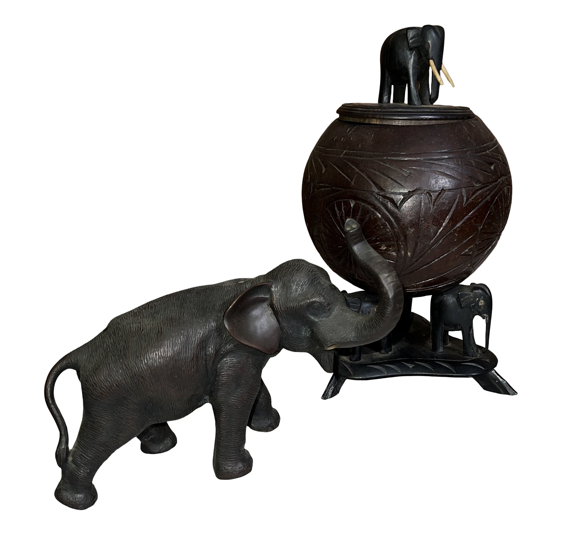 Anglo Raj carved ebony elephants with carved coconut shell and top, as is, some tusks missing -8.5"H