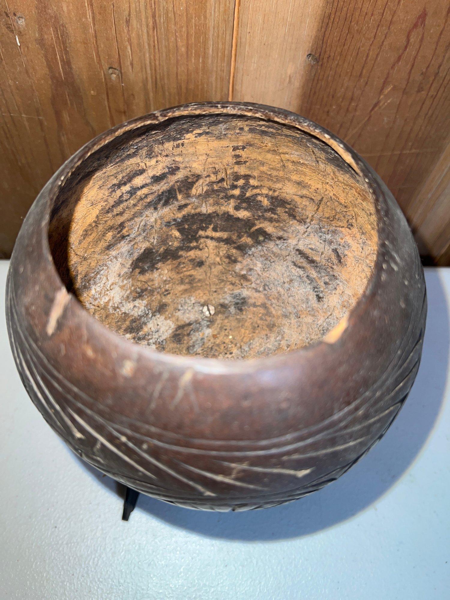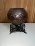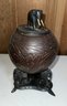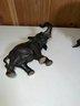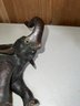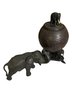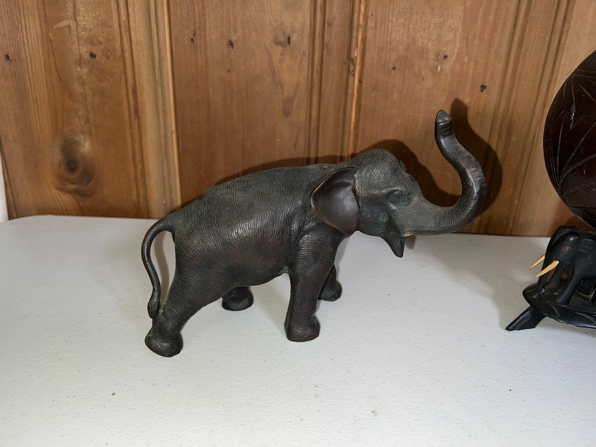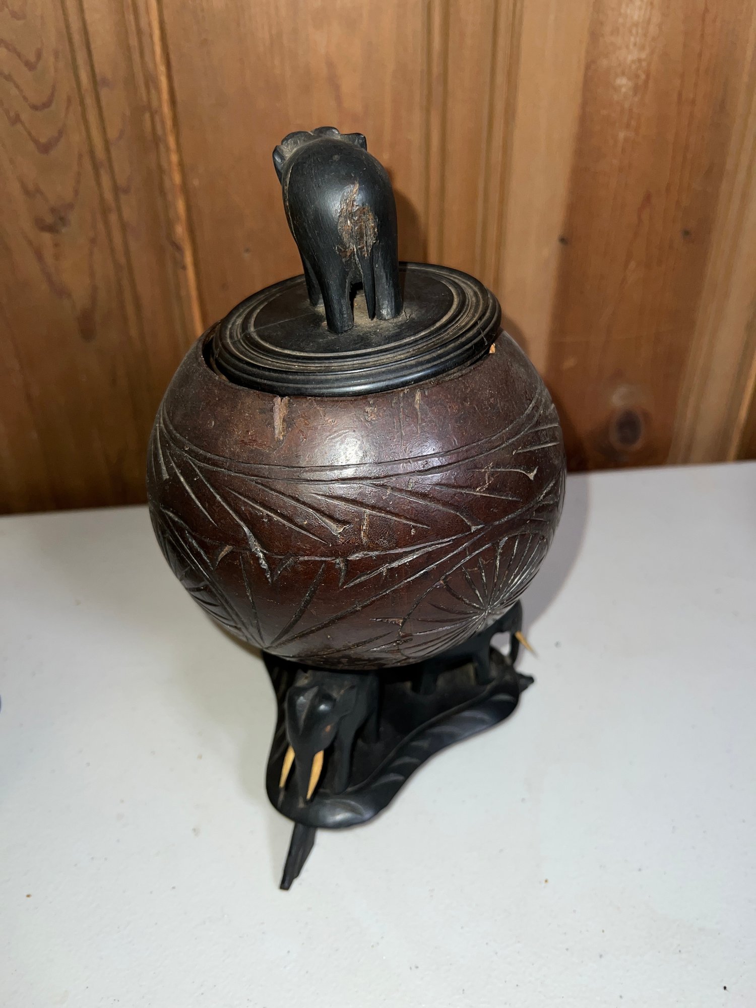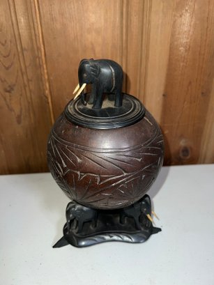 Anglo Raj carved ebony elephants with carved coconut shell and top, as is, some tusks missing -8.5"H