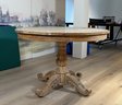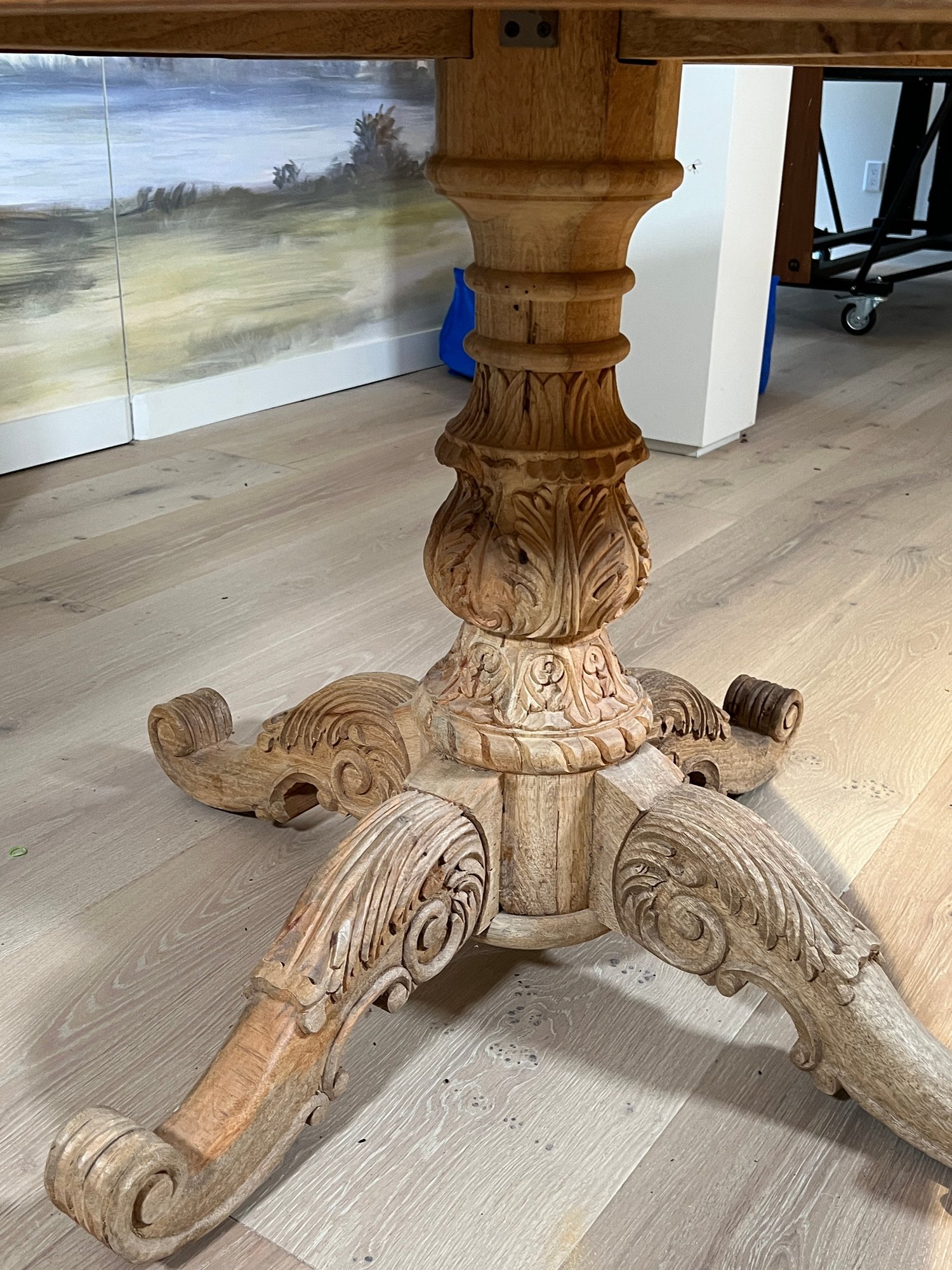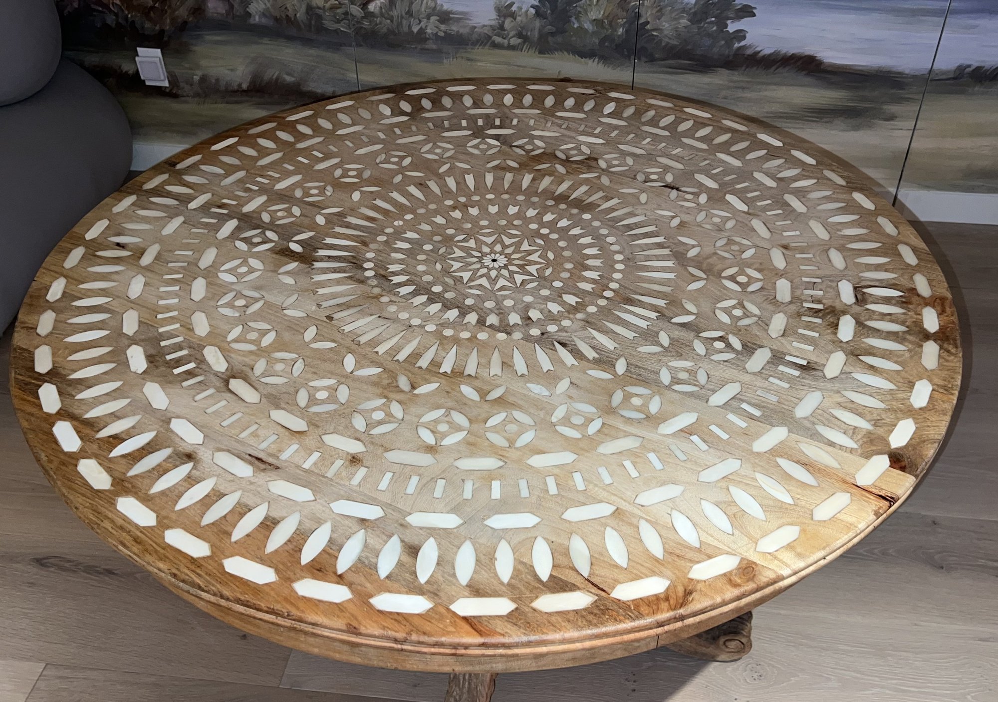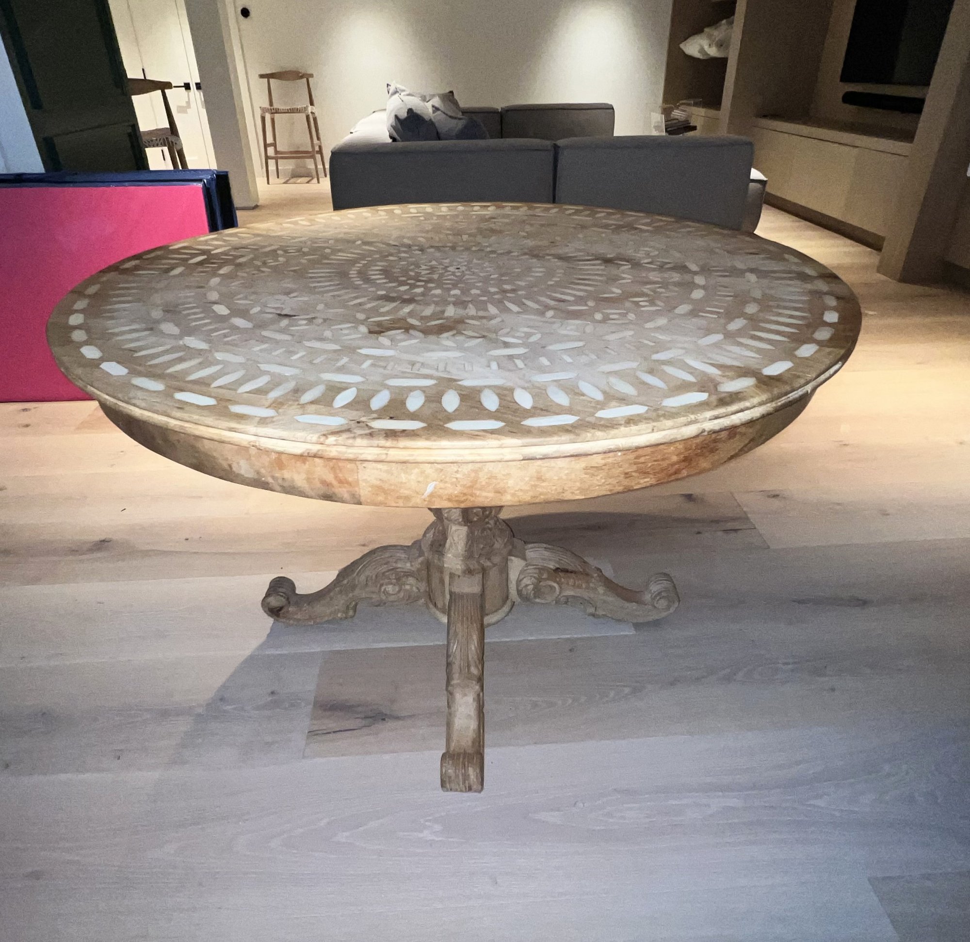 This table's inlaid bone surface pays homage to an ancient Indian artistry technique. Hand carved. Can seat four or a striking display in your entryway. Natural finish. Mortise and Tenon joinery.