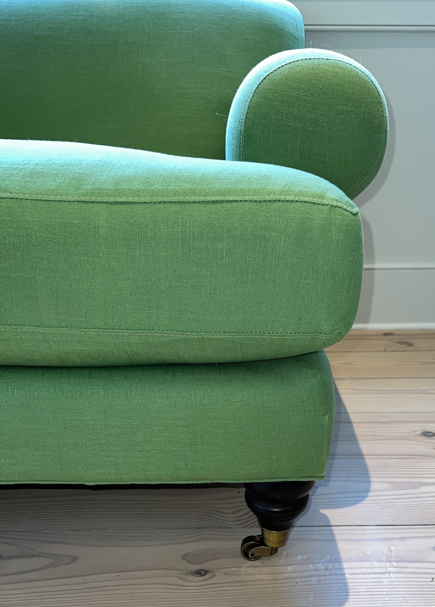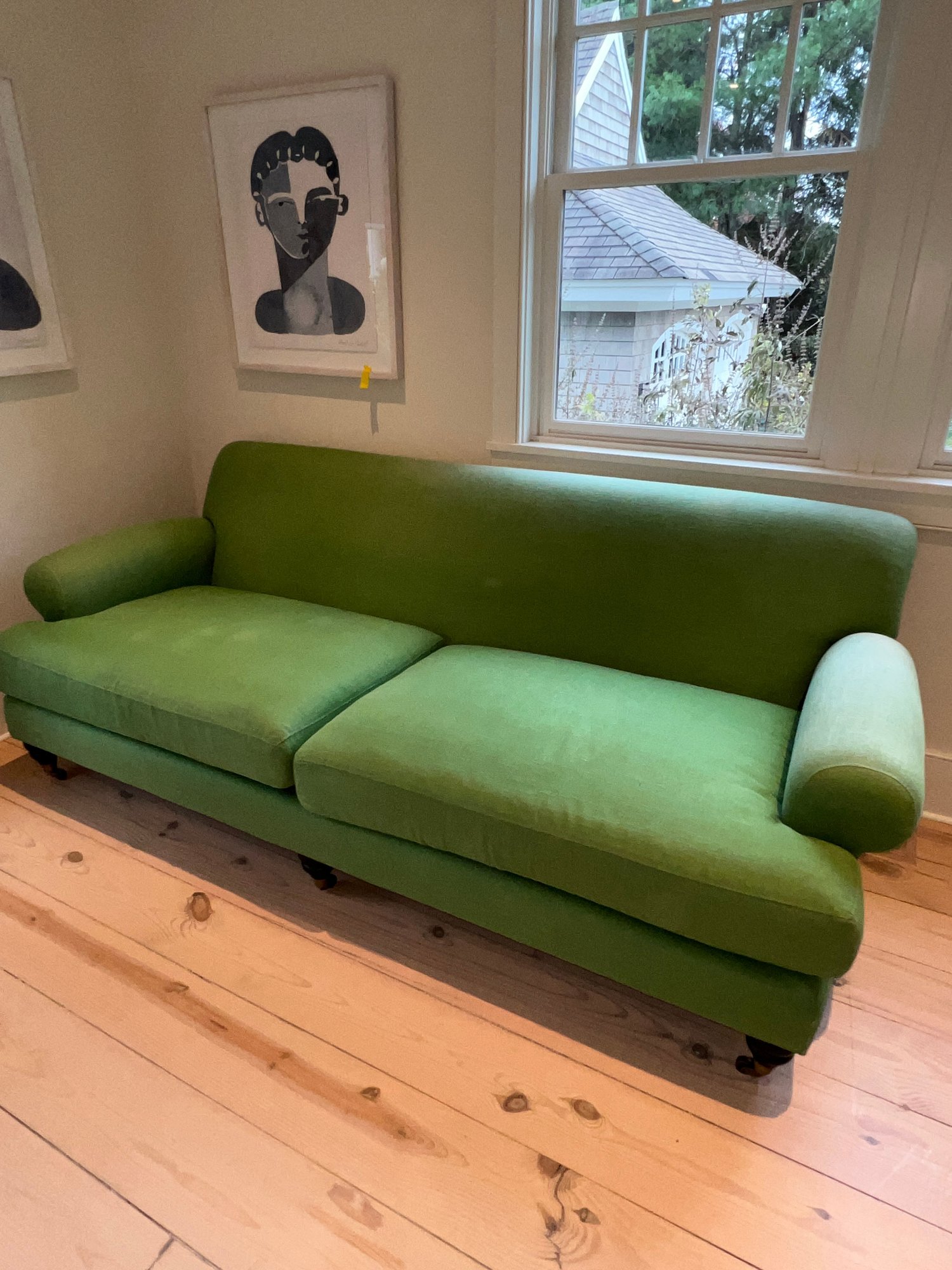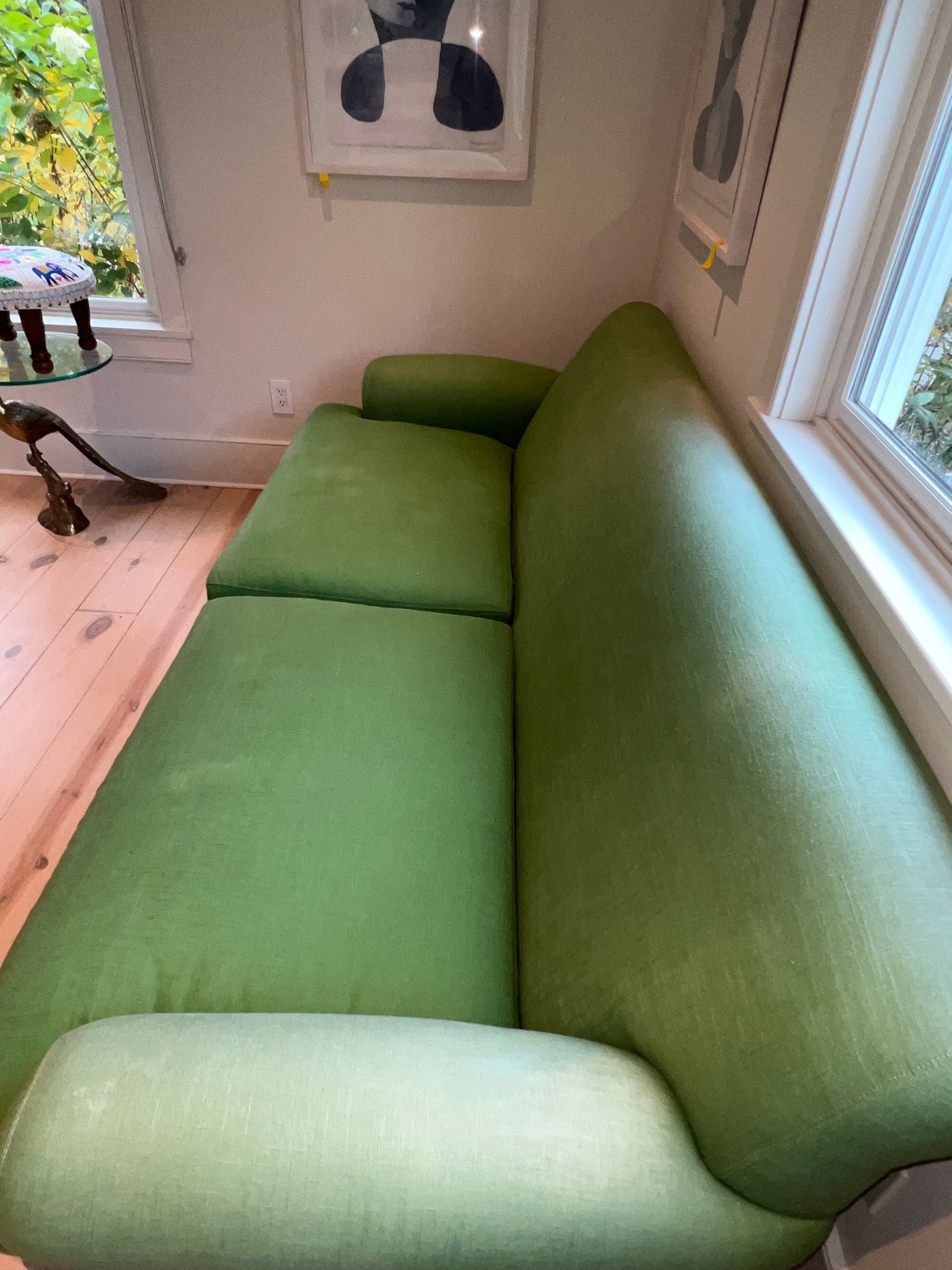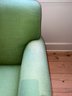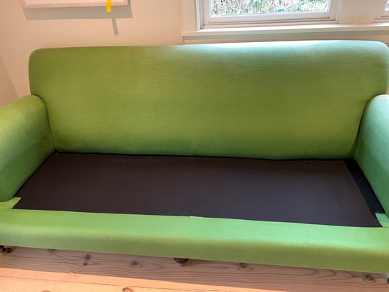 Anthropology Two cushion light olive green sofa with three casters in front and two wood legs in back. In the guest bedroom, it is not used much; however, it is placed against a large window, so some fading has occurred.