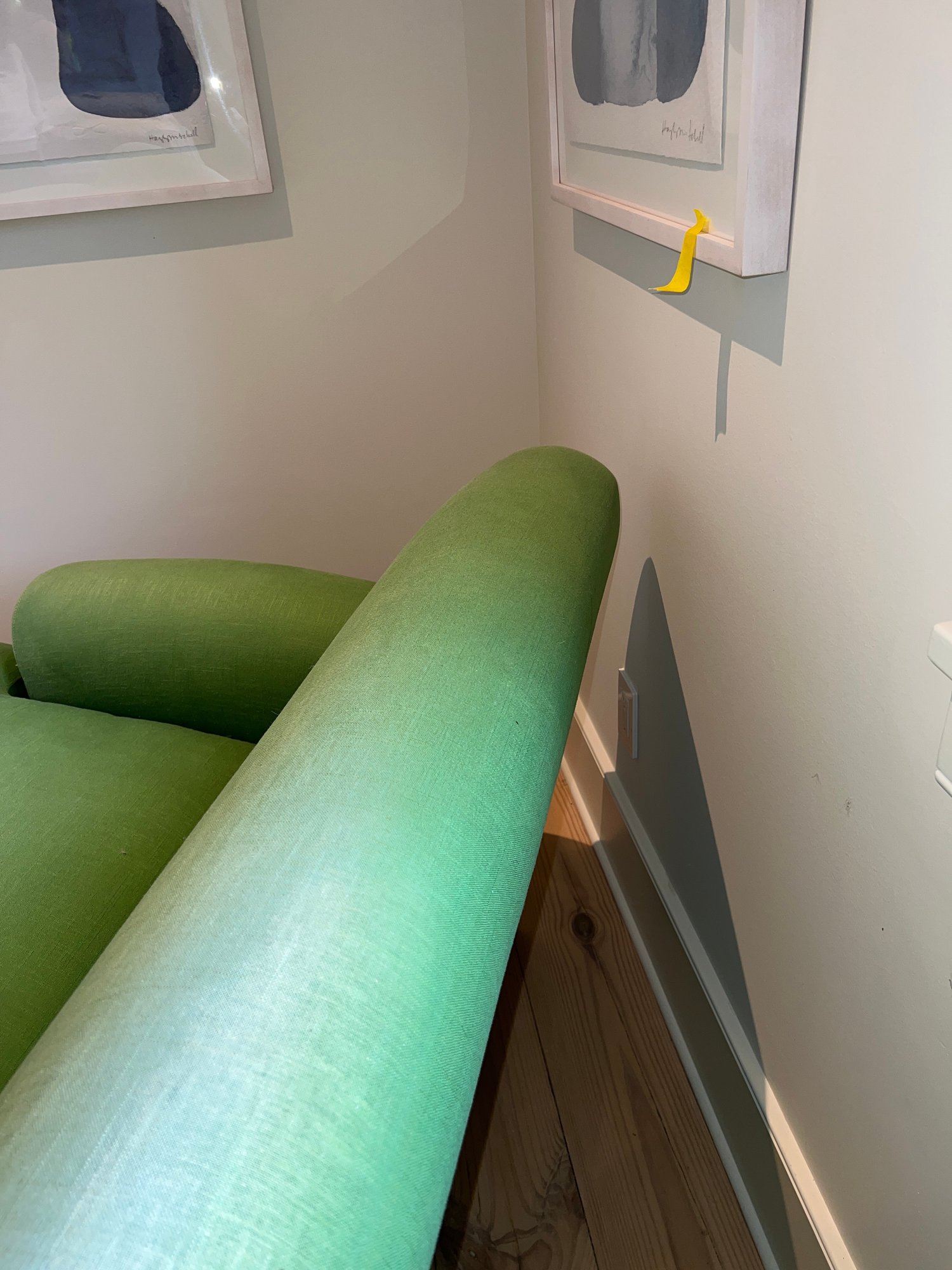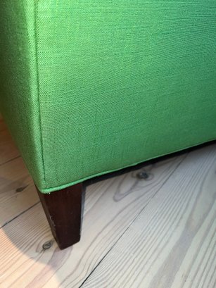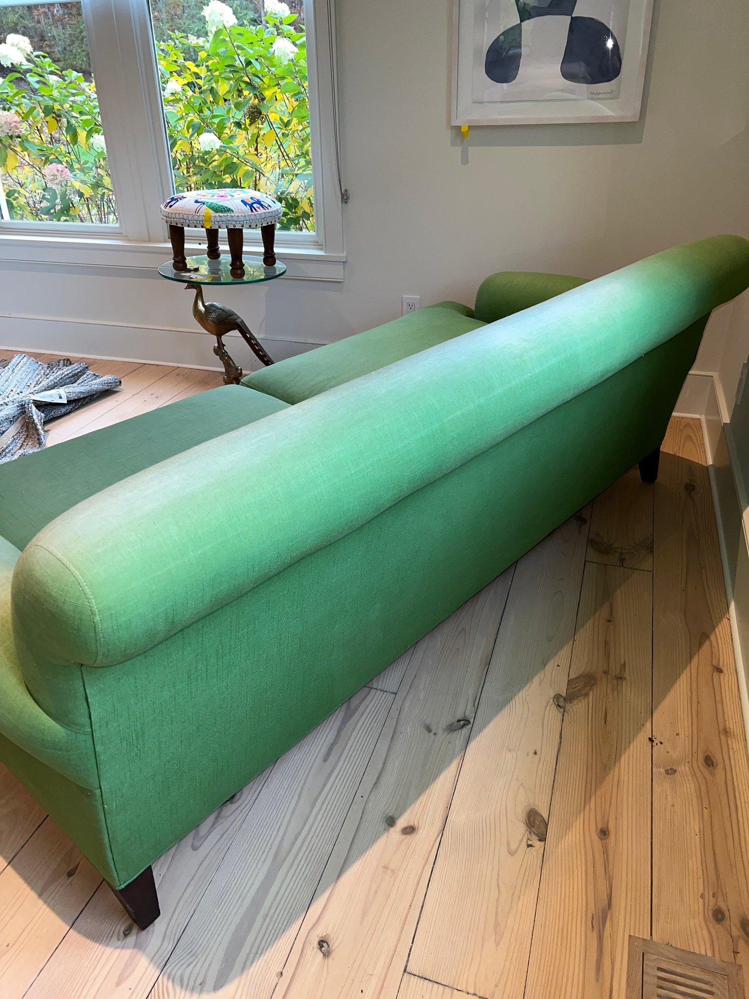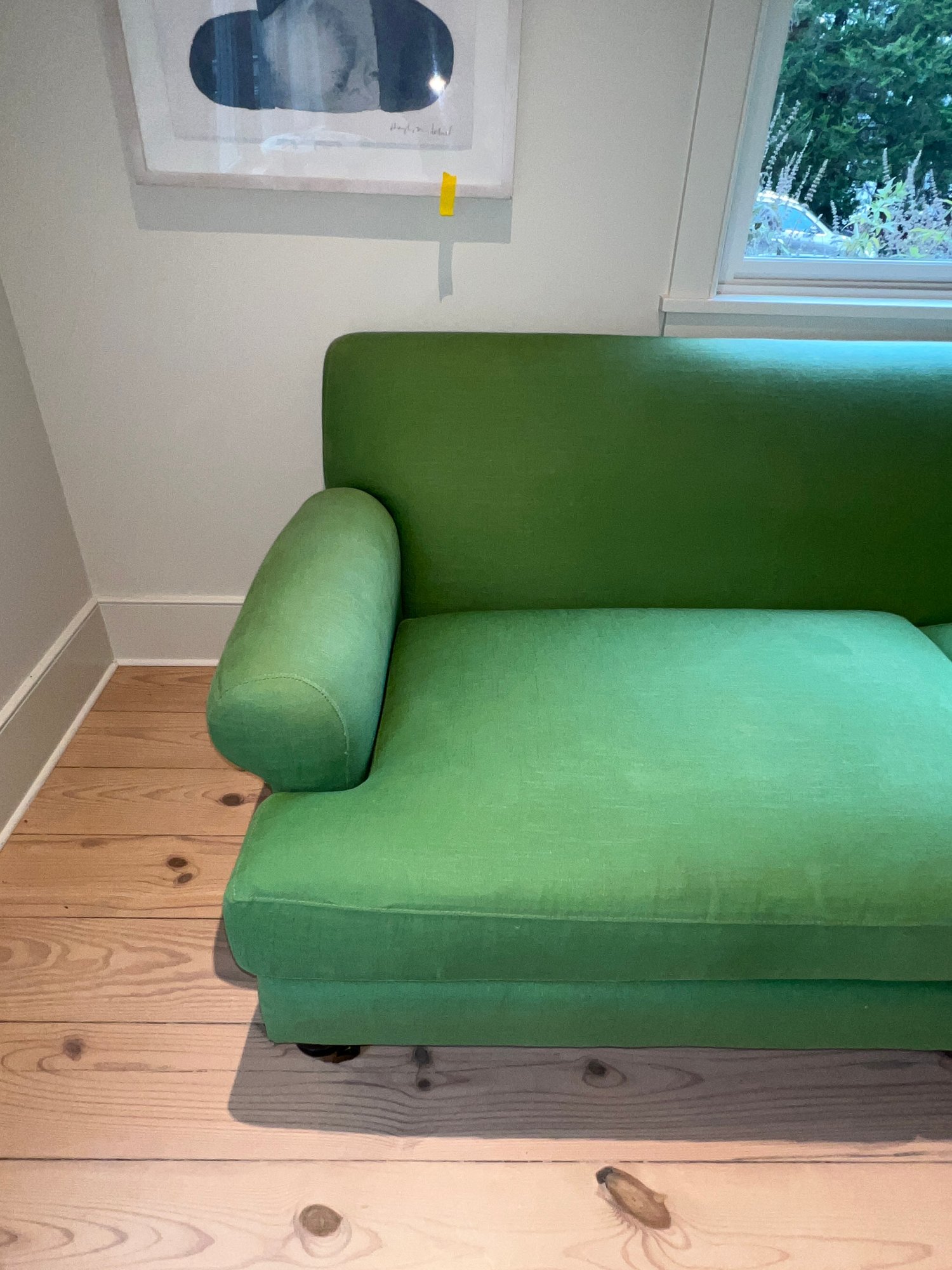 Anthropology Two cushion light olive green sofa with three casters in front and two wood legs in back. In the guest bedroom, it is not used much; however, it is placed against a large window, so some fading has occurred.