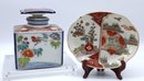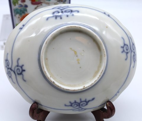 Antique platter with birds and flowers, back has blue decorations with circles around the rim. 5.5"W