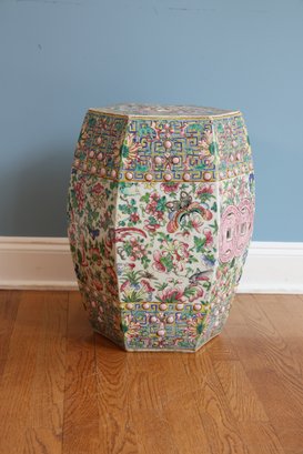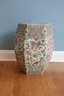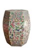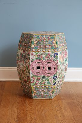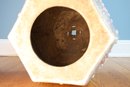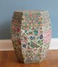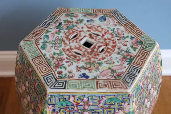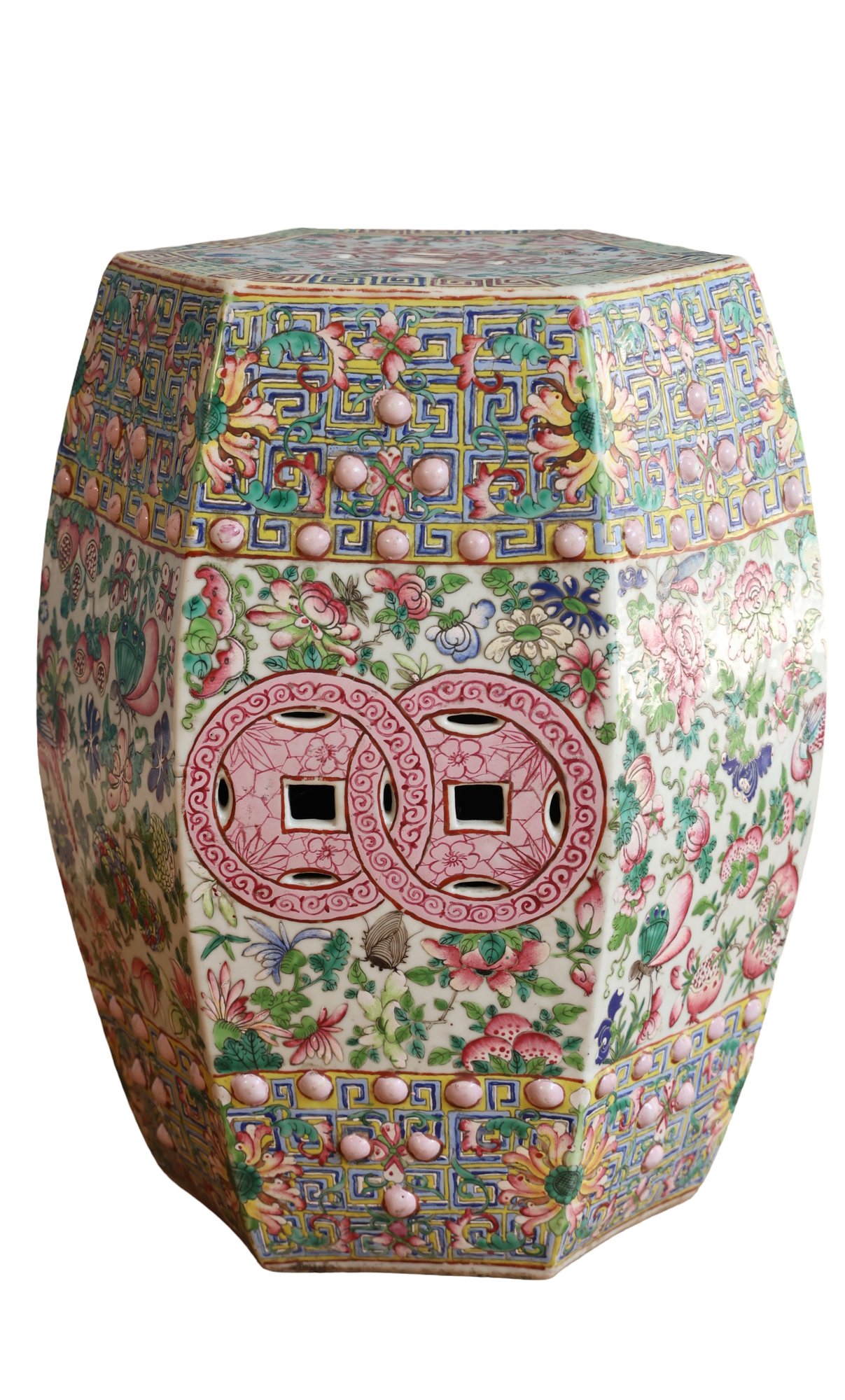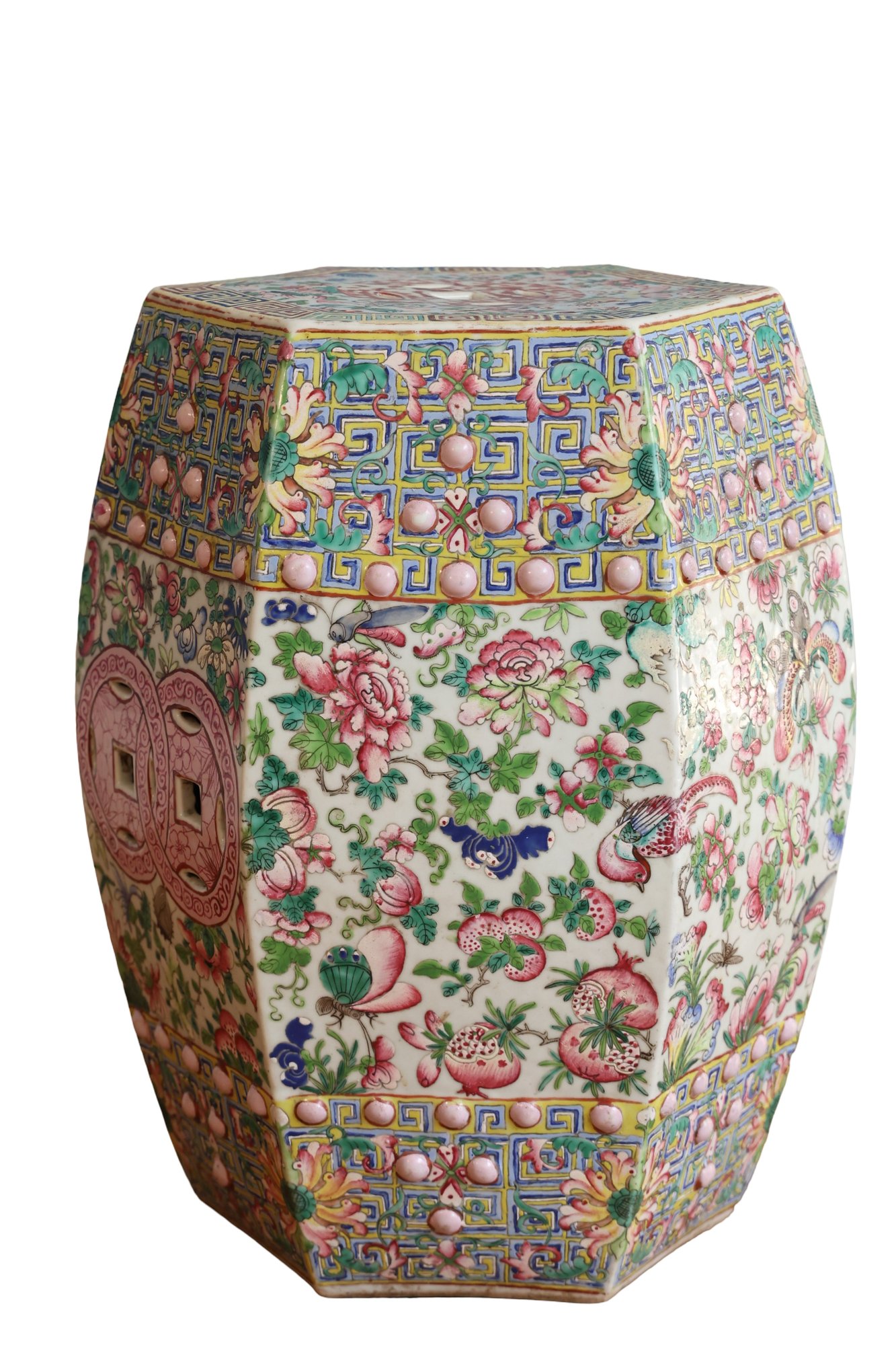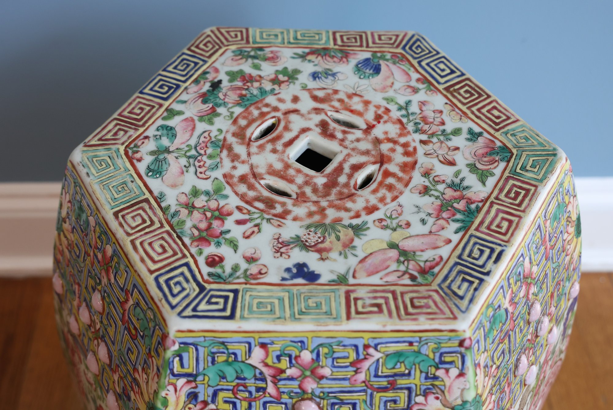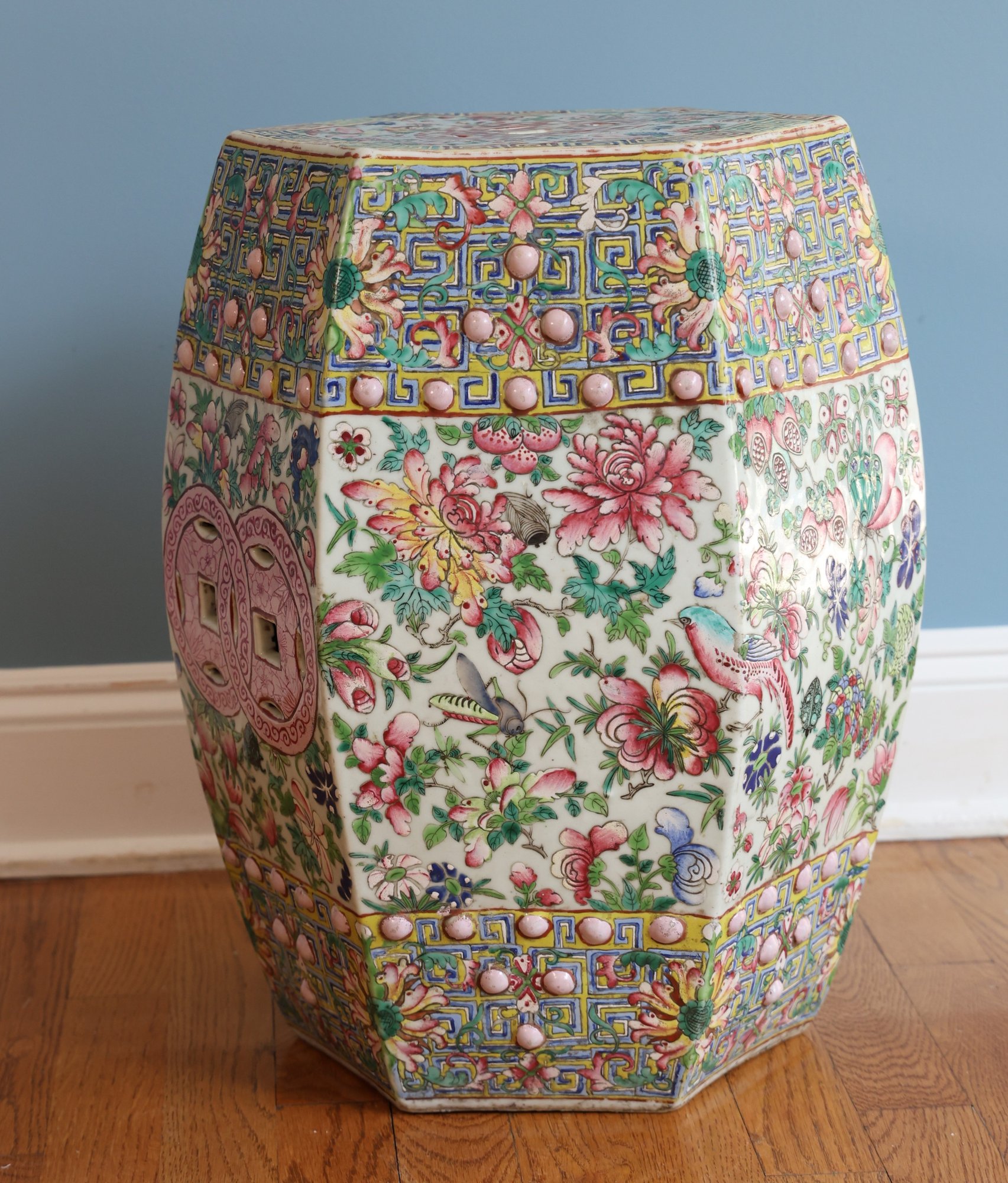 Hand painted with flowers and insects, molded studs and top has a hexagon shape with pierced cash symbol on top and sides.