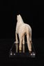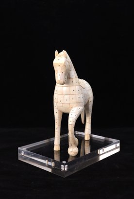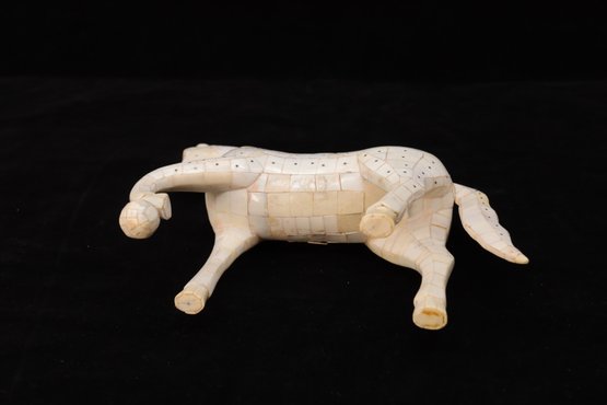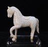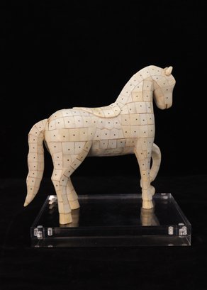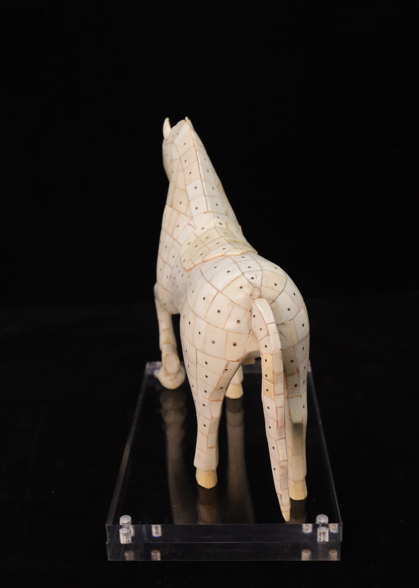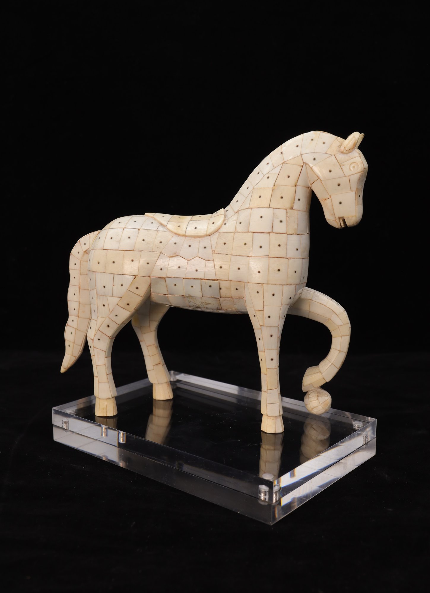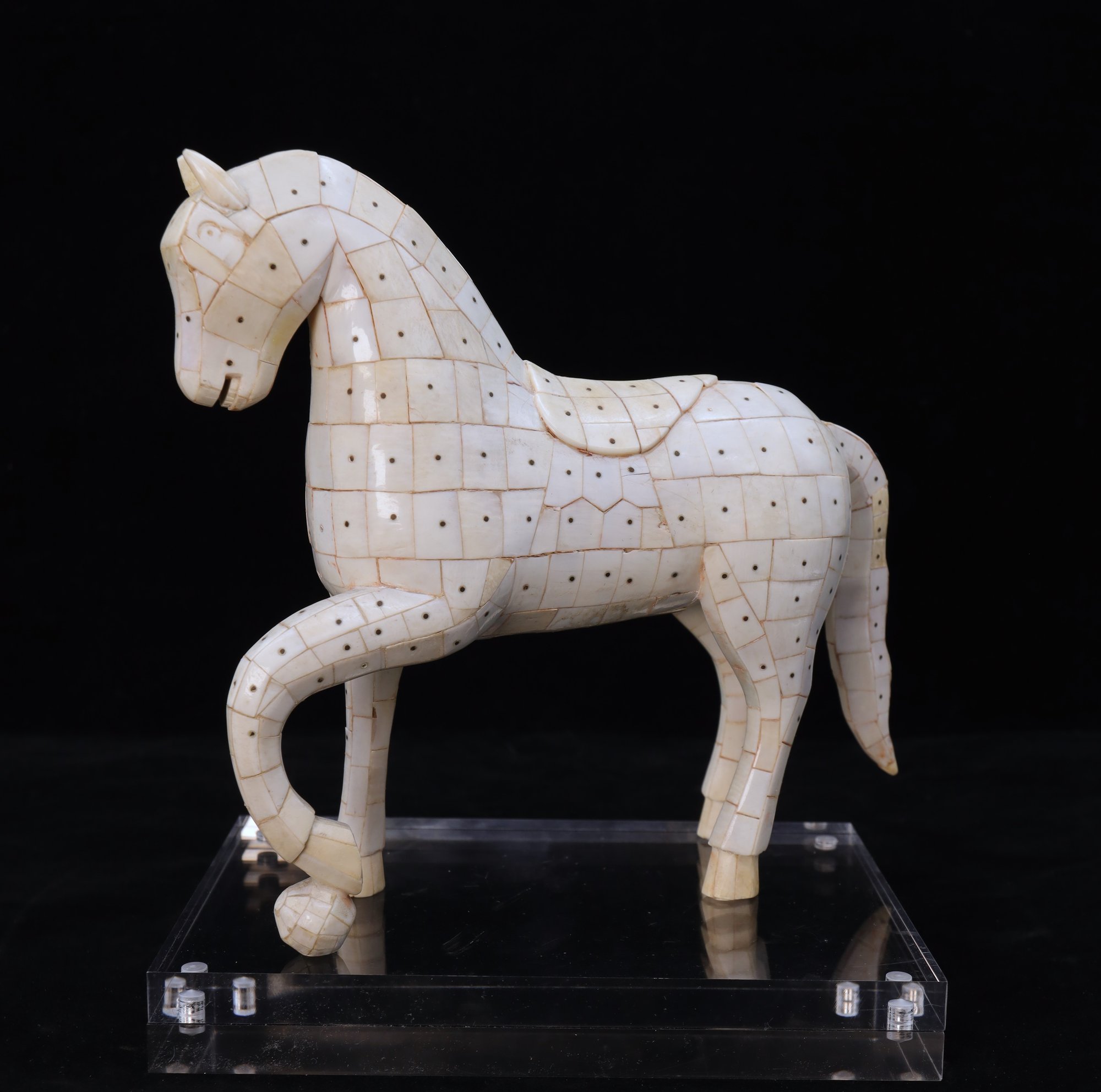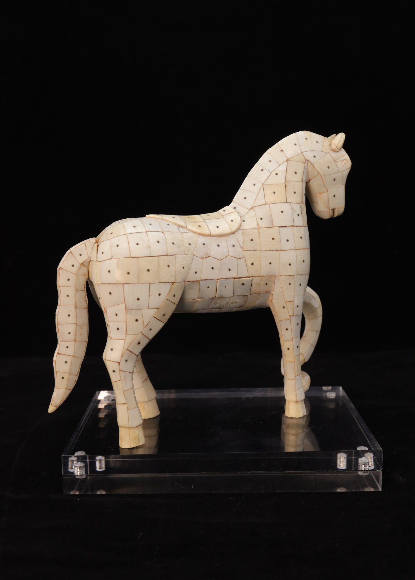 Private collection: Antique Chinese tessellated bone horse sculpture with a ball horse saddle, measuring 7"W x 6.25"H.