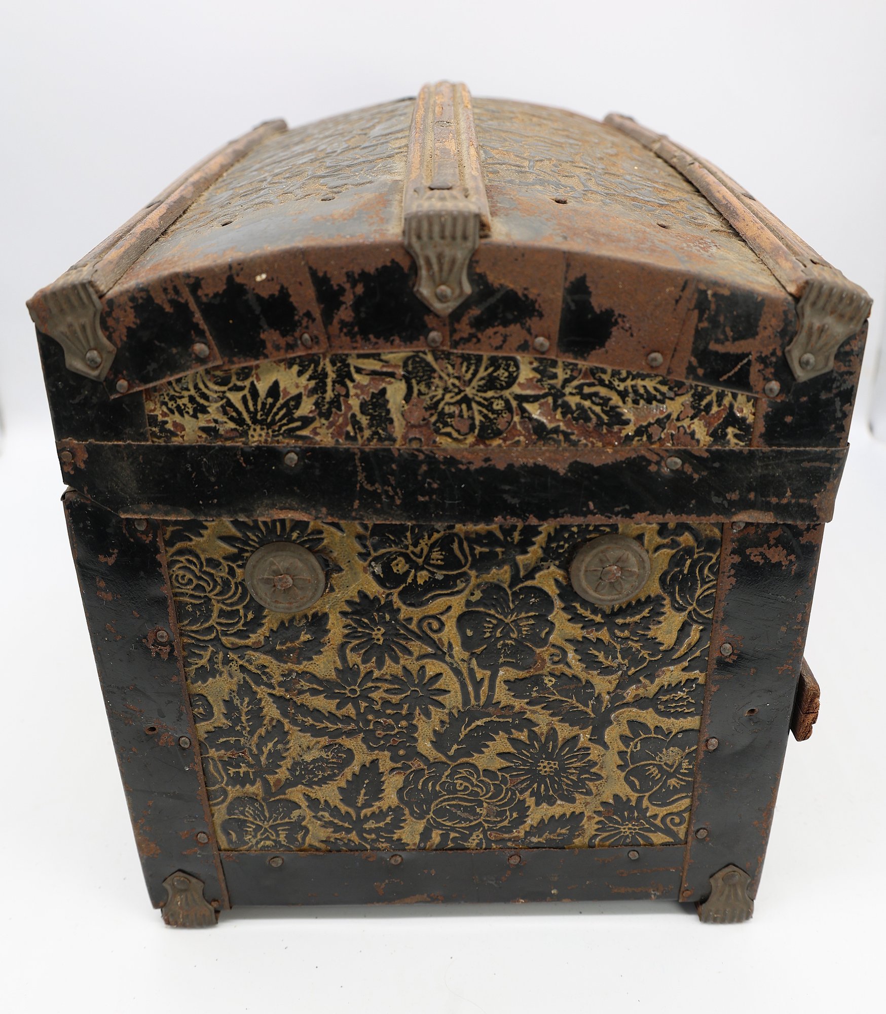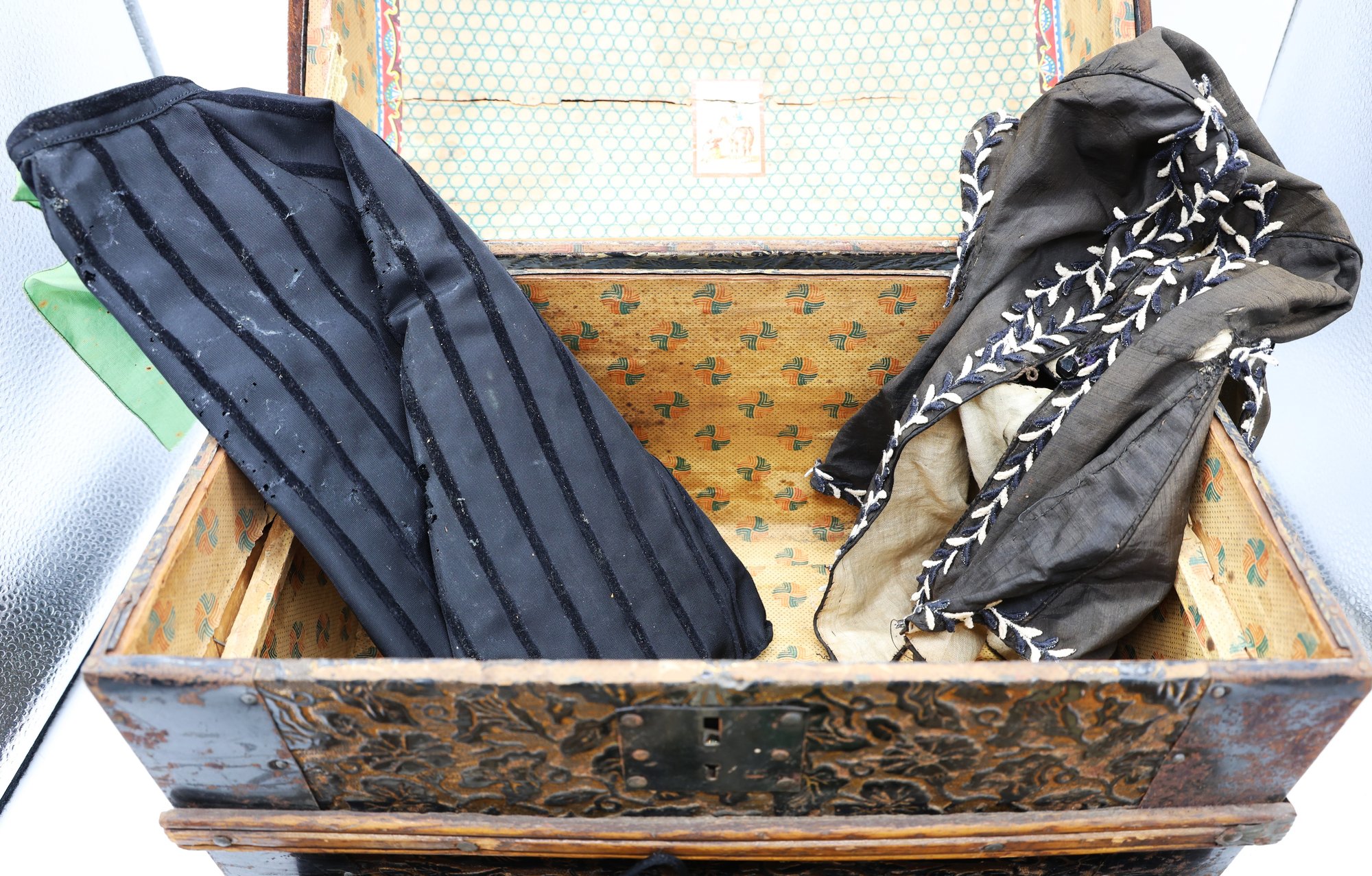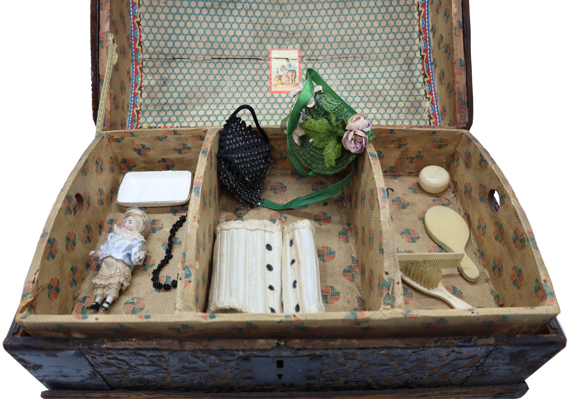 Beautiful metal decor all around and top divider inside that comes out. Some old doll clothing, doll celluloid brush,mirror,comb, hook and sponge container, 3.5" bisque vintage doll.