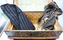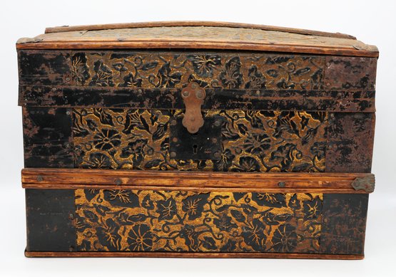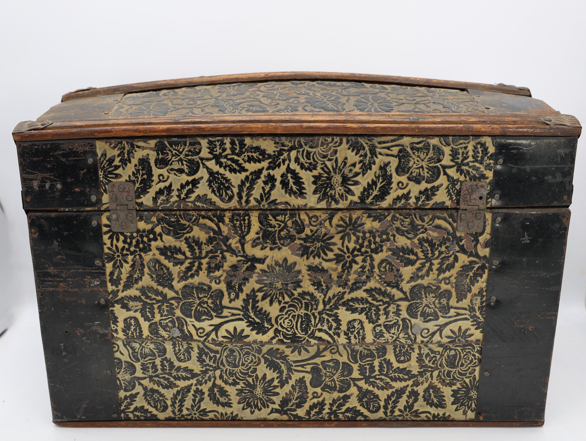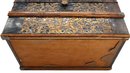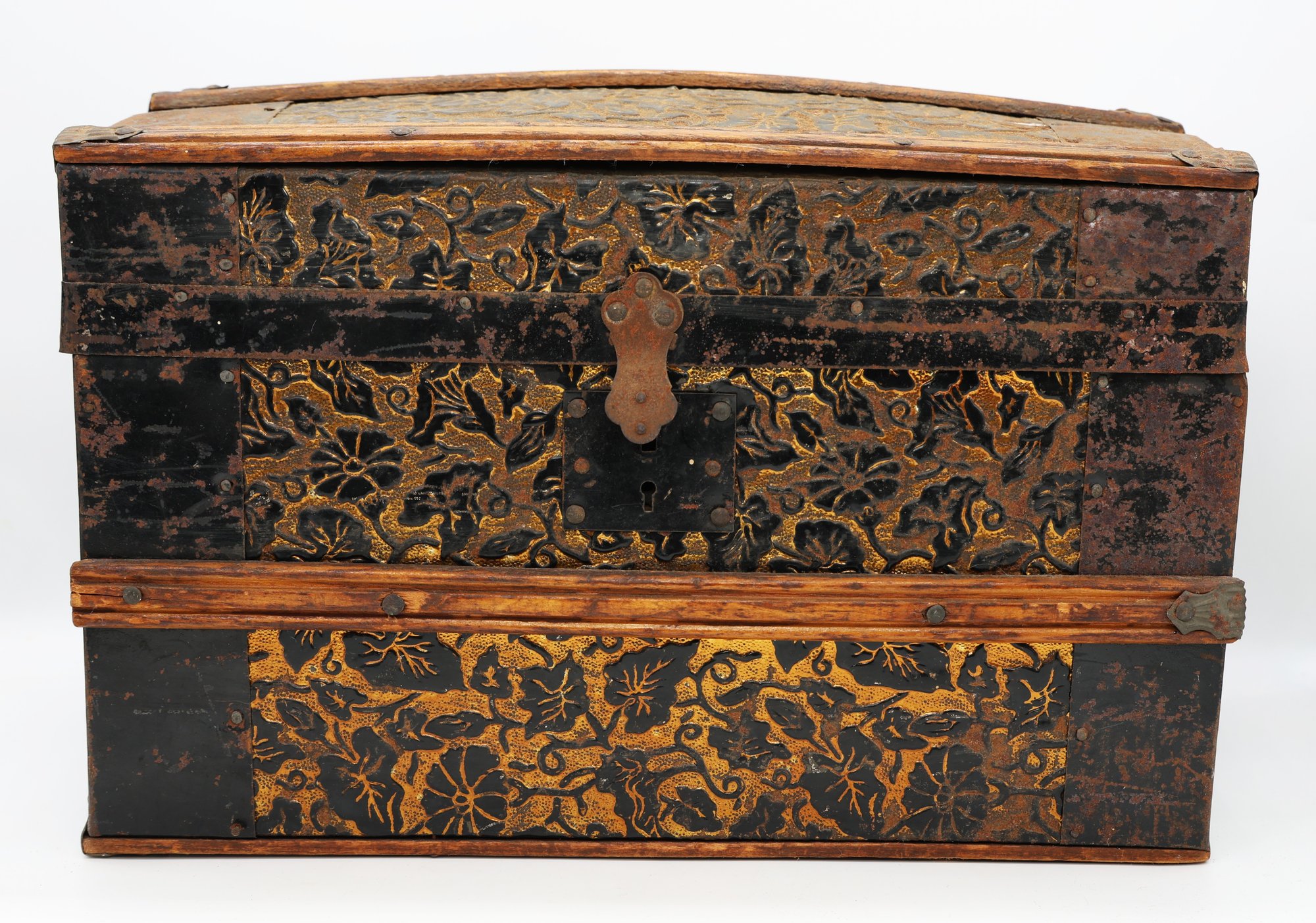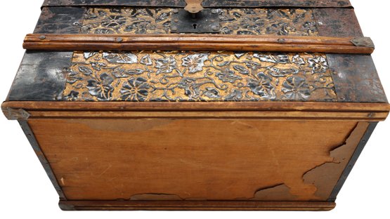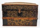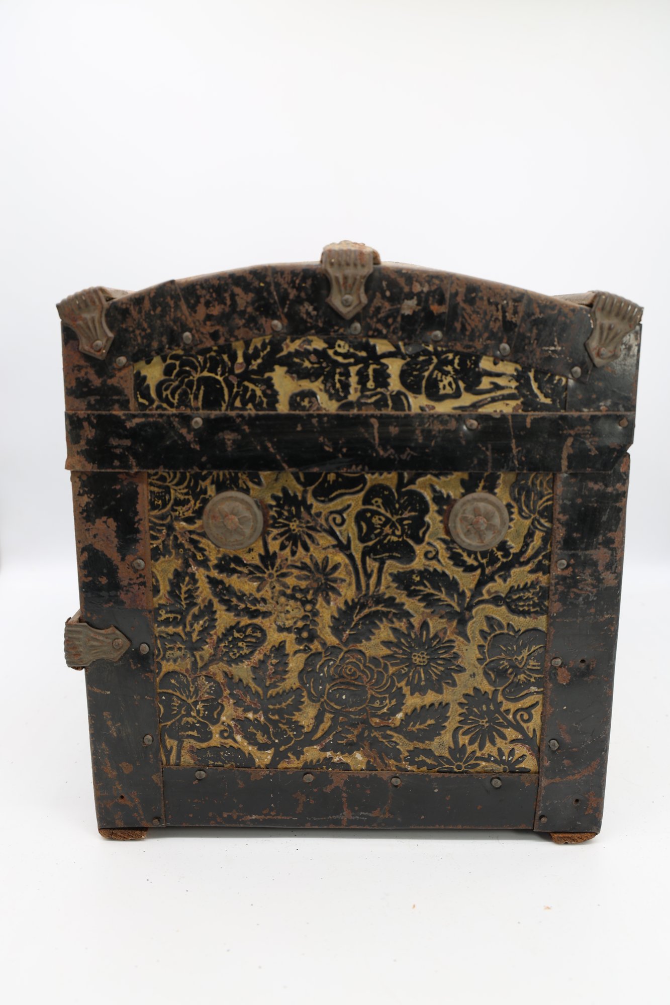 Beautiful metal decor all around and top divider inside that comes out. Some old doll clothing, doll celluloid brush,mirror,comb, hook and sponge container, 3.5" bisque vintage doll.