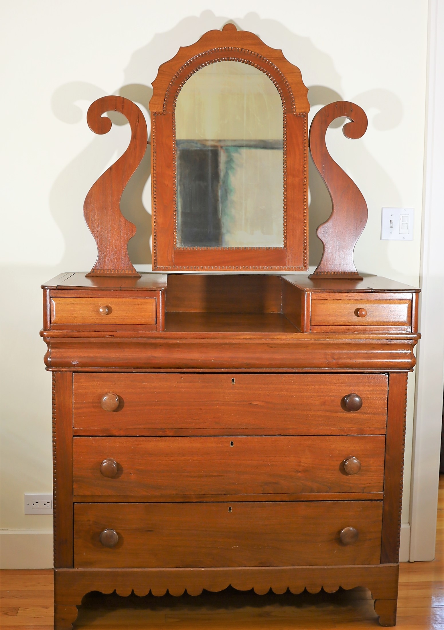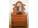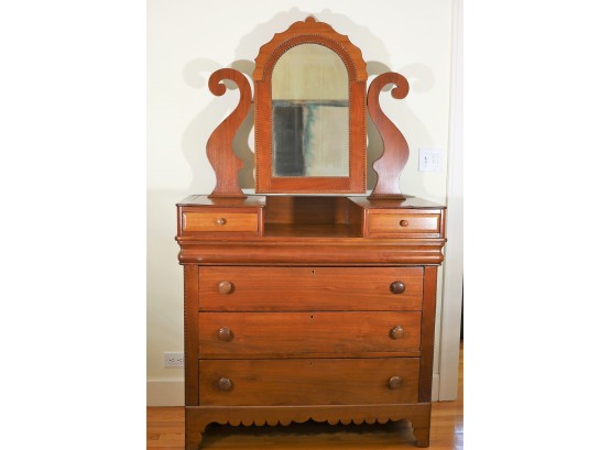 Beautiful antique dresser with 3 deep drawers and 2 side drawers. Swing mirror on top. In good shape with wood split on top. Original mirror & hardware.