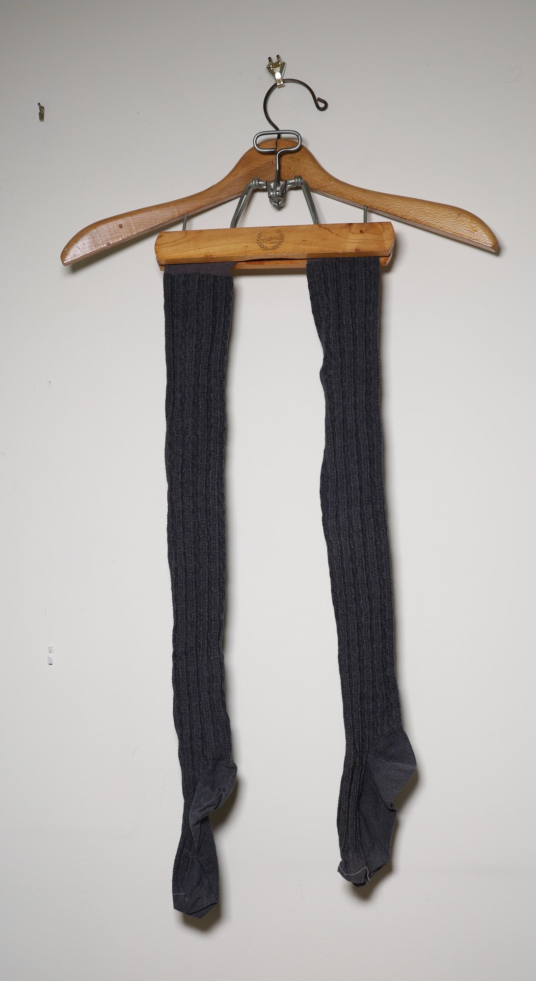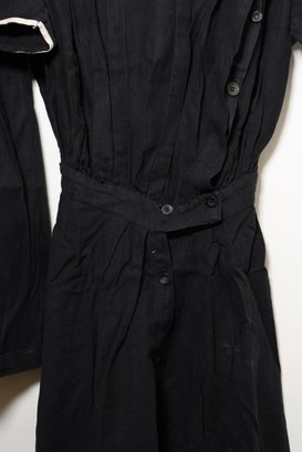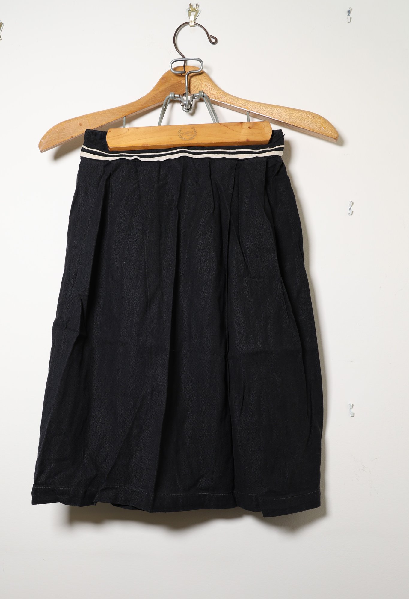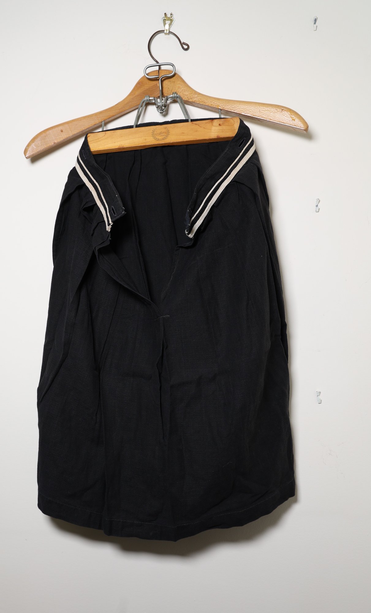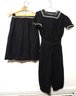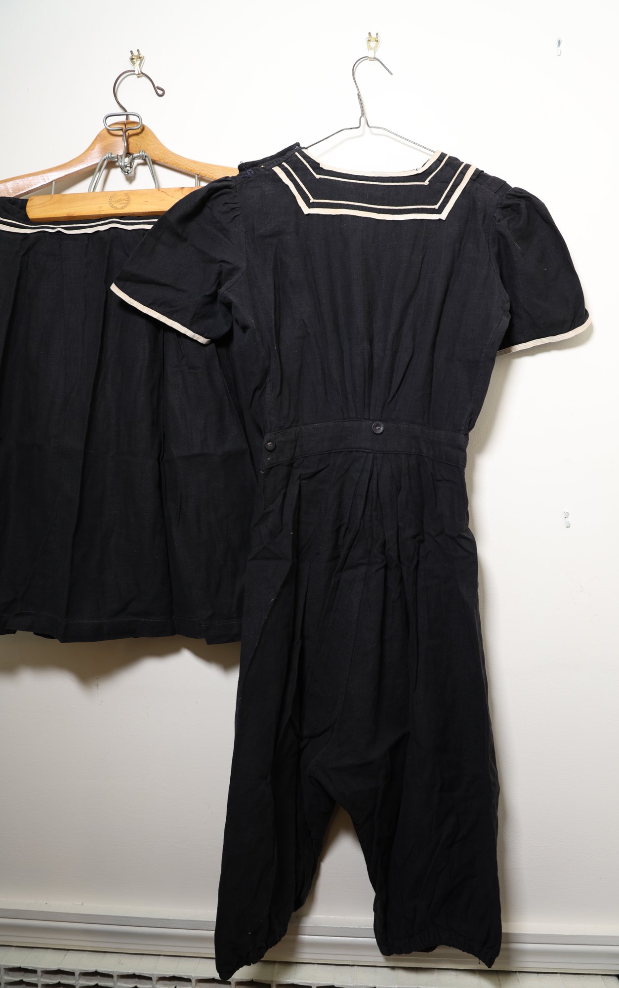Overall good condition swimsuit and playsuit from circa the 1900s. Button missing on the skirt. One-piece measures 43"L x 12"W. Skirt is 23"L x 12"W and pleated. Includes one pair of gray vintage knee highs.