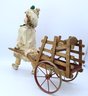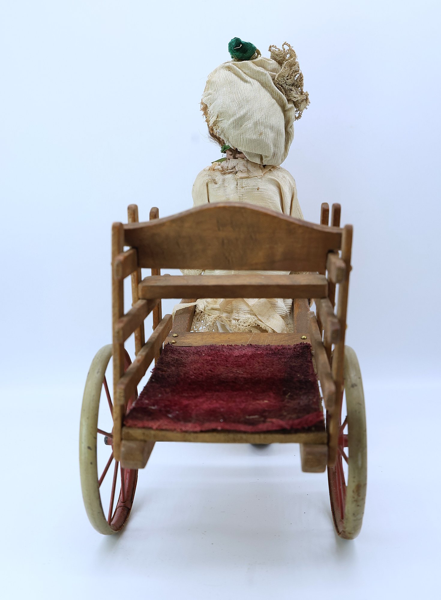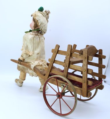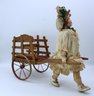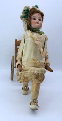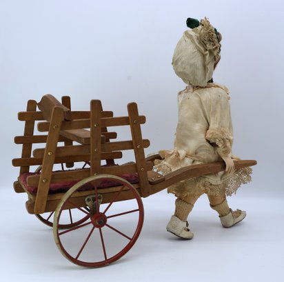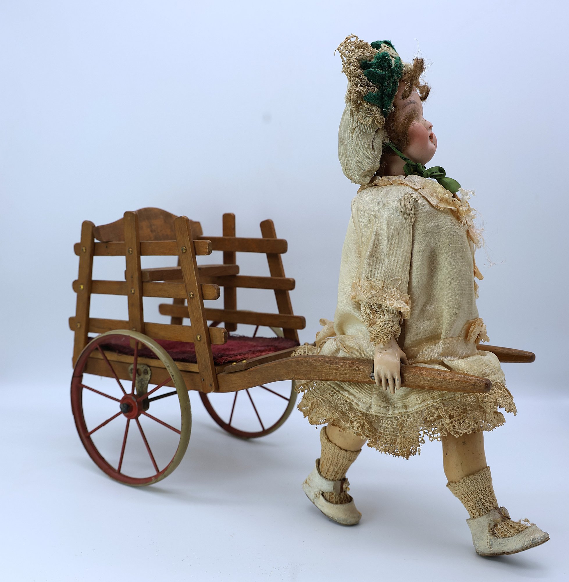Open mouth doll signed on base of neck Germany. She is attached by hands to the wagon with bright blue eyes. The wagon is wood with metal wheels.