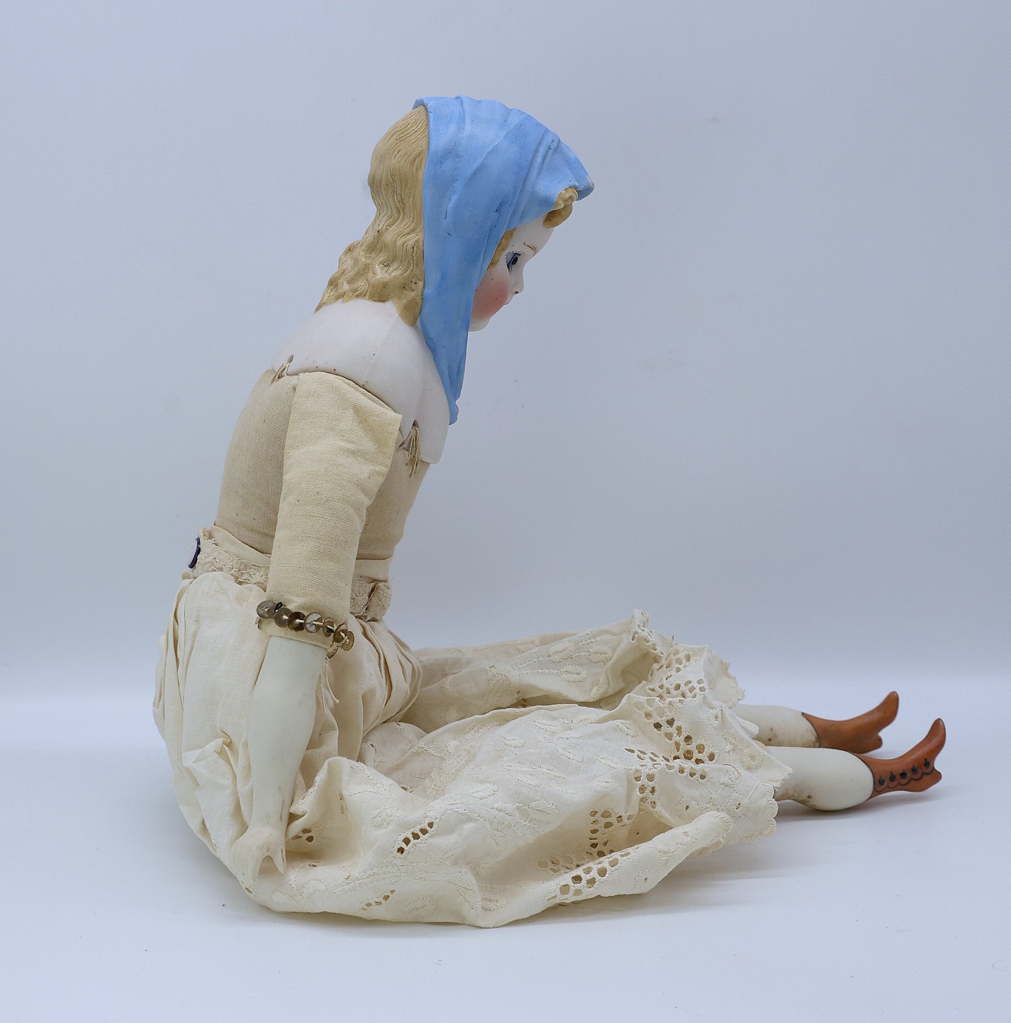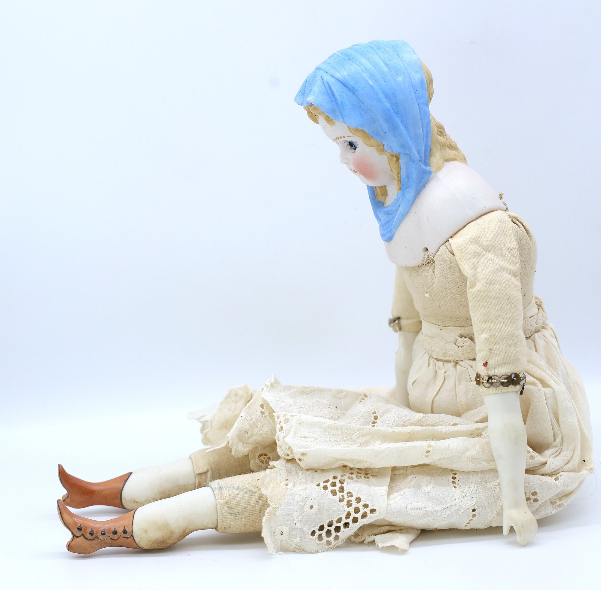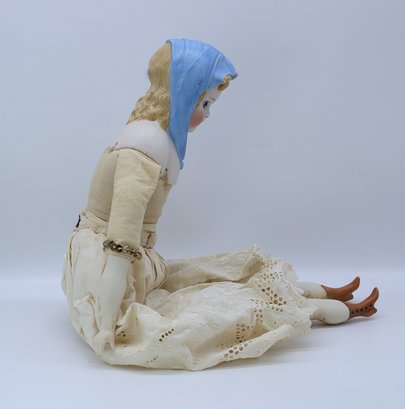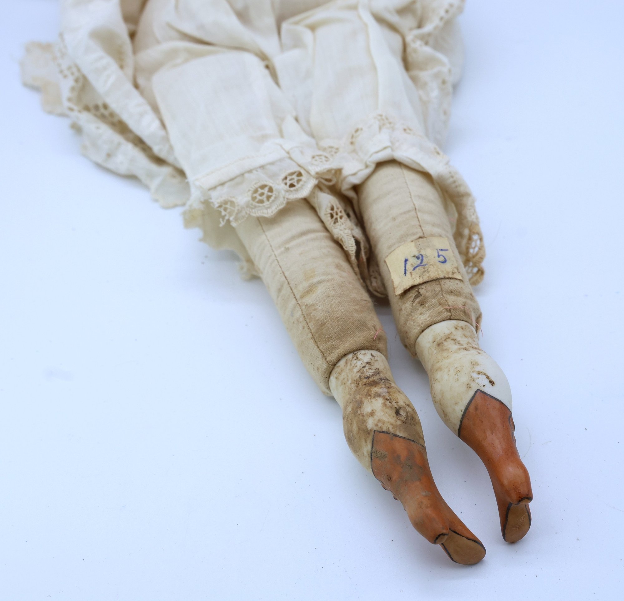 Porcelain head, arms and legs. Cloth body and hand painted