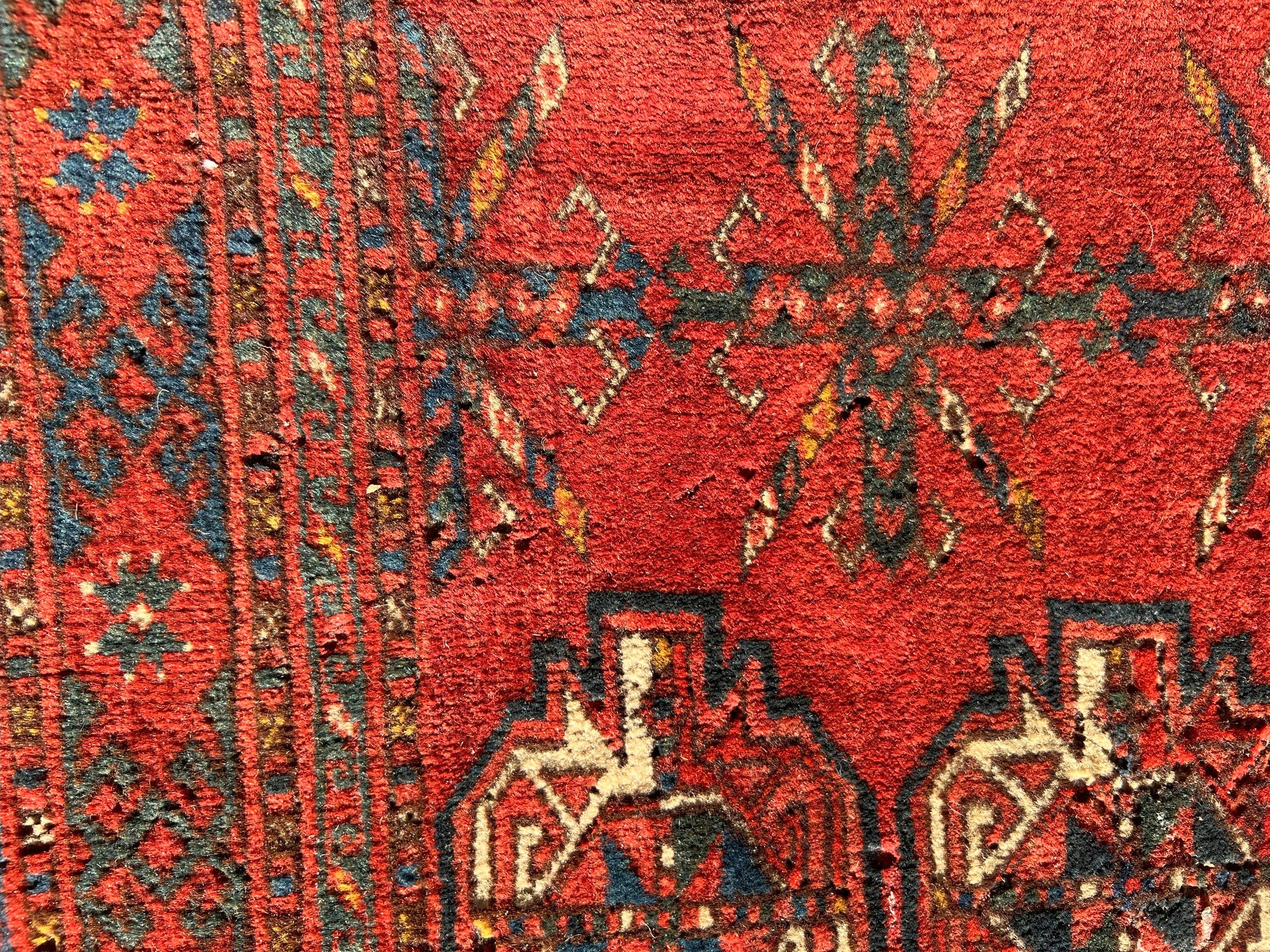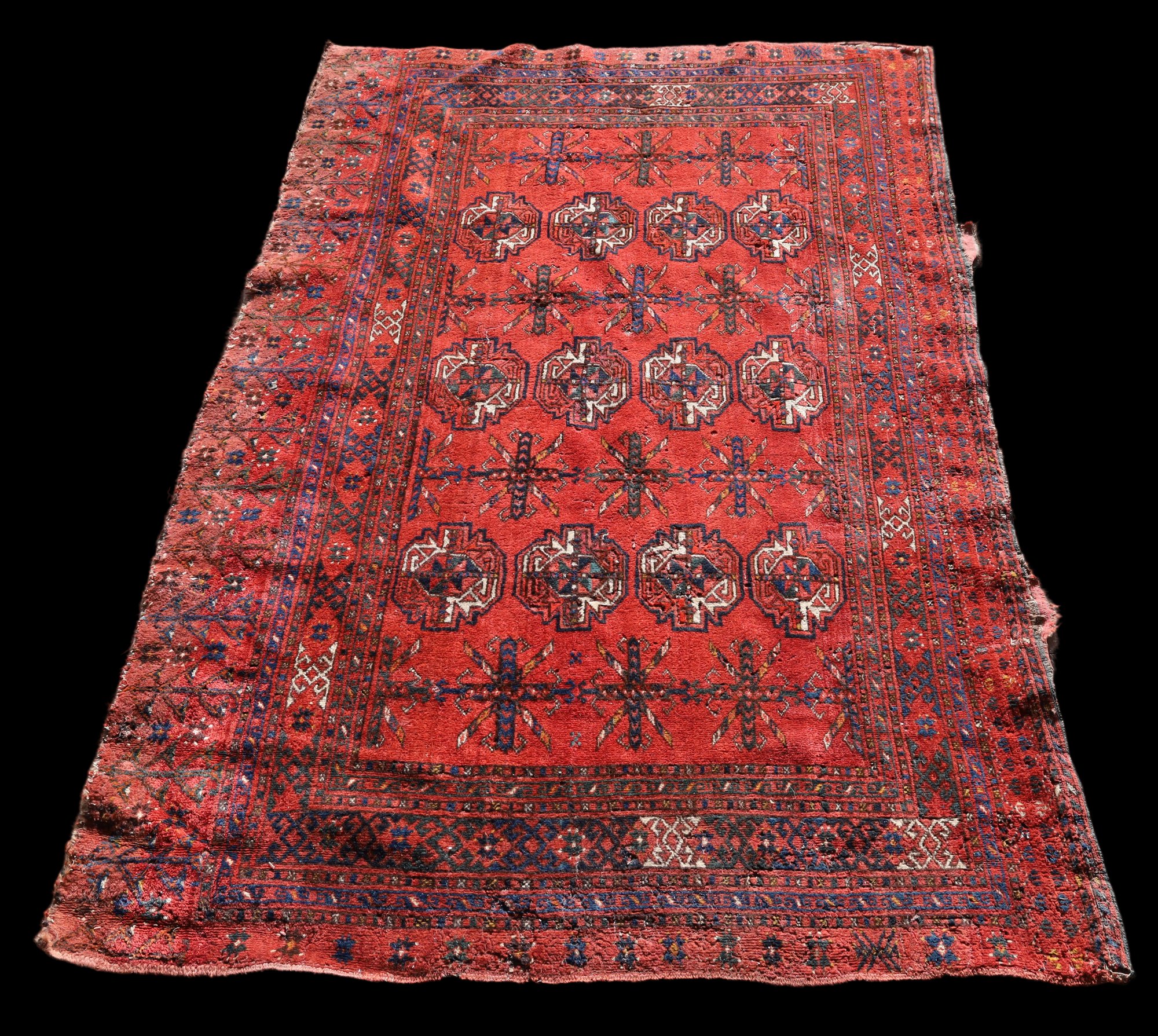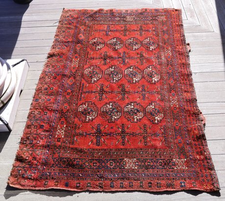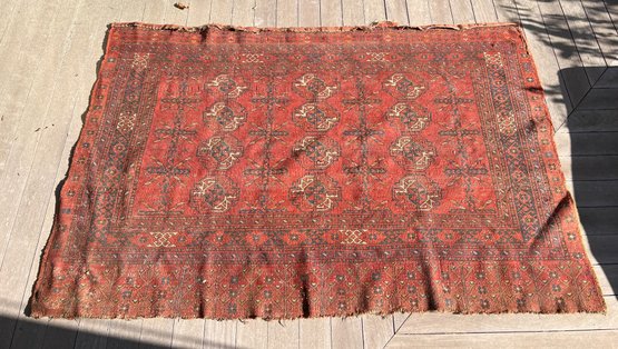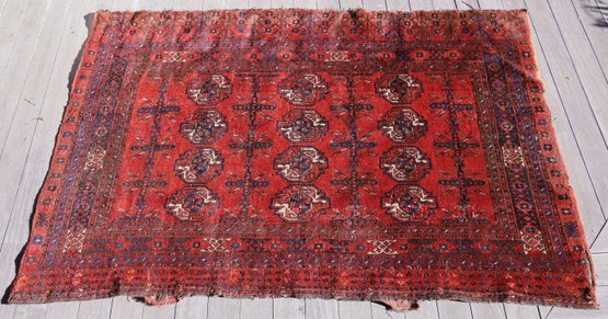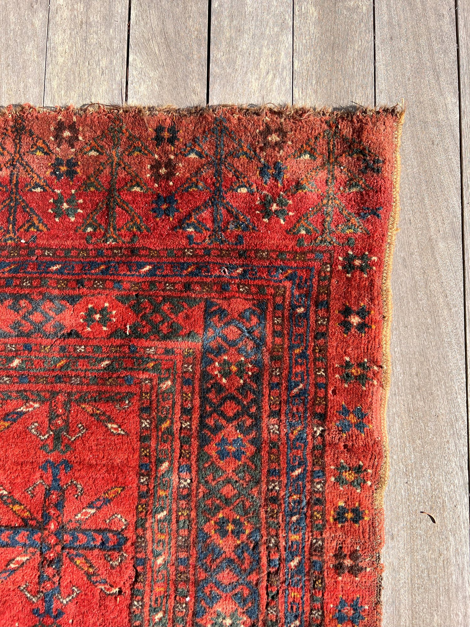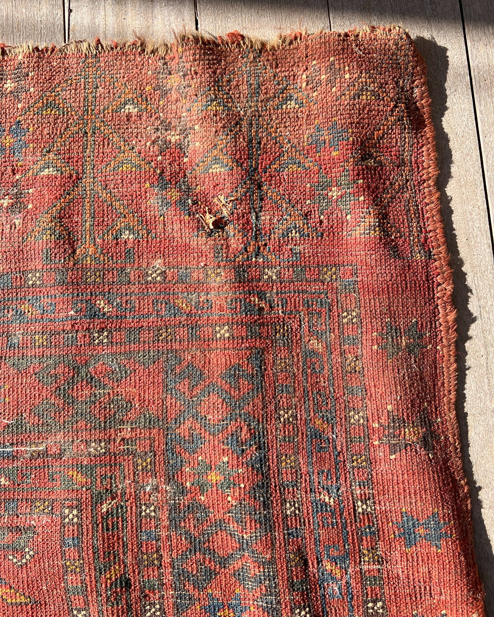 This is a beautiful antique rug, a real oldie, though it shows some wear around the edges.