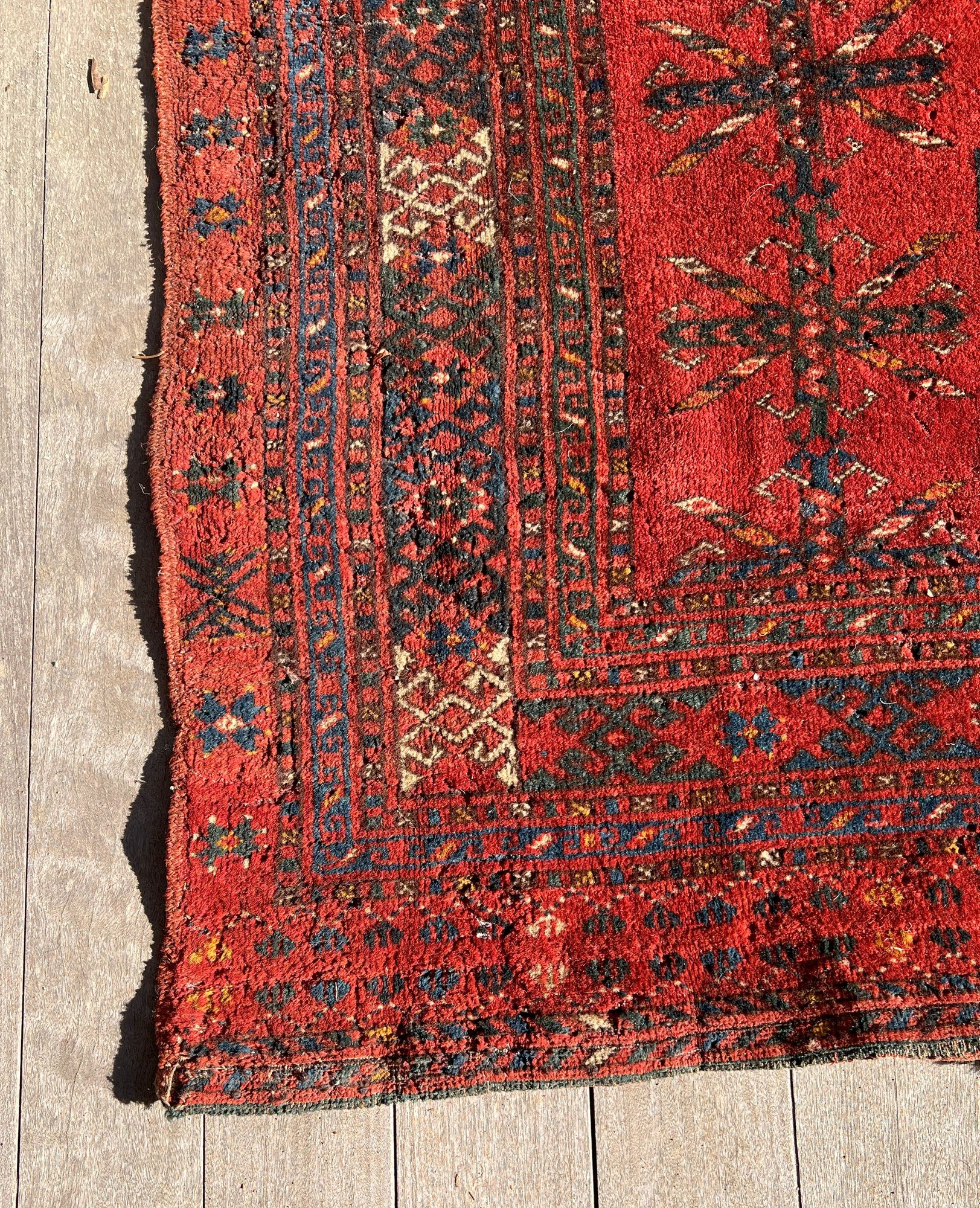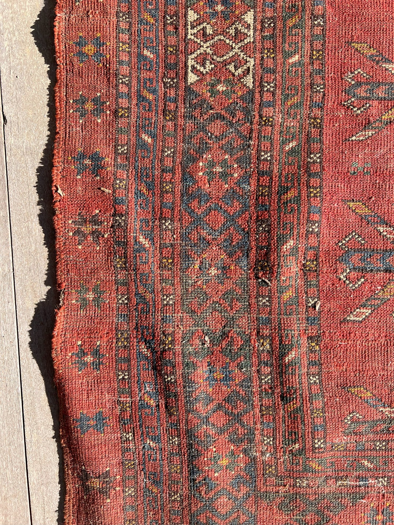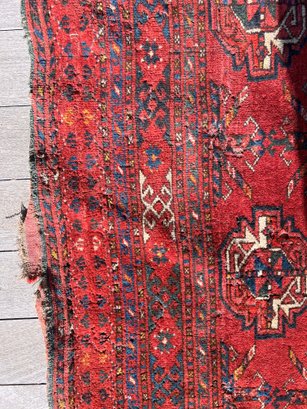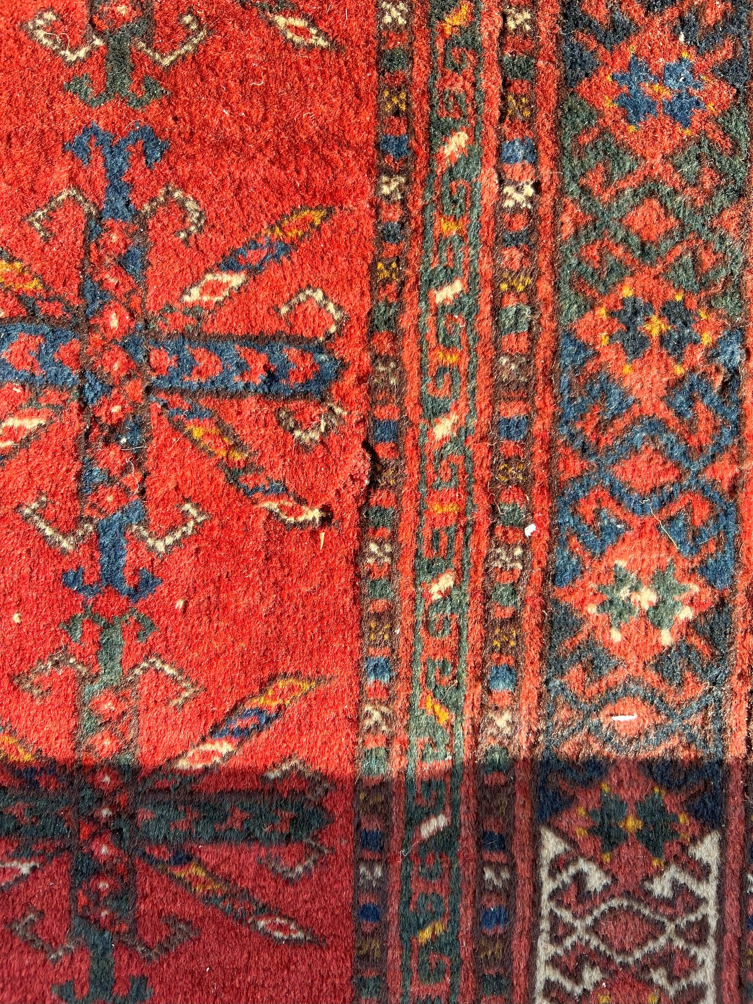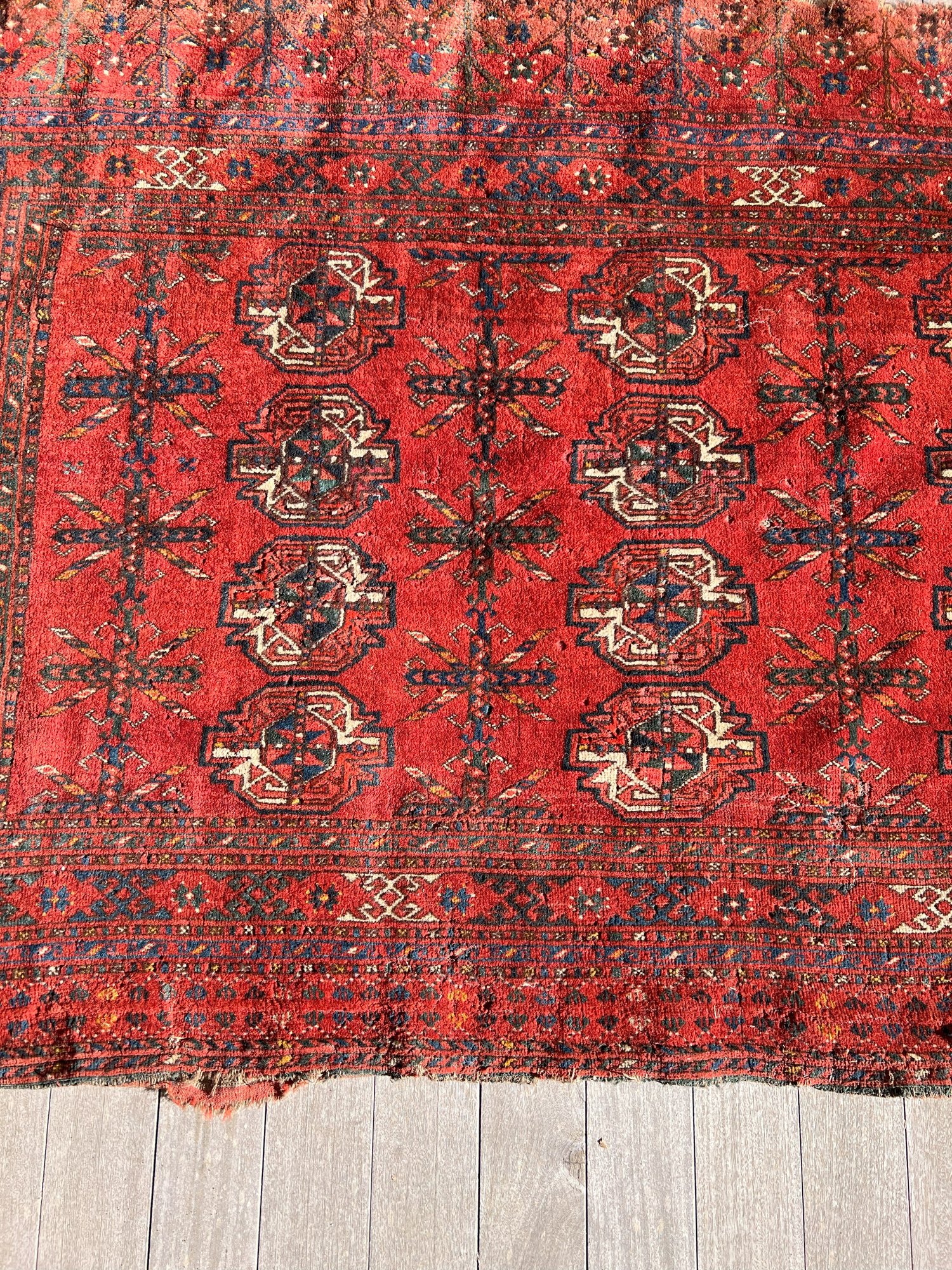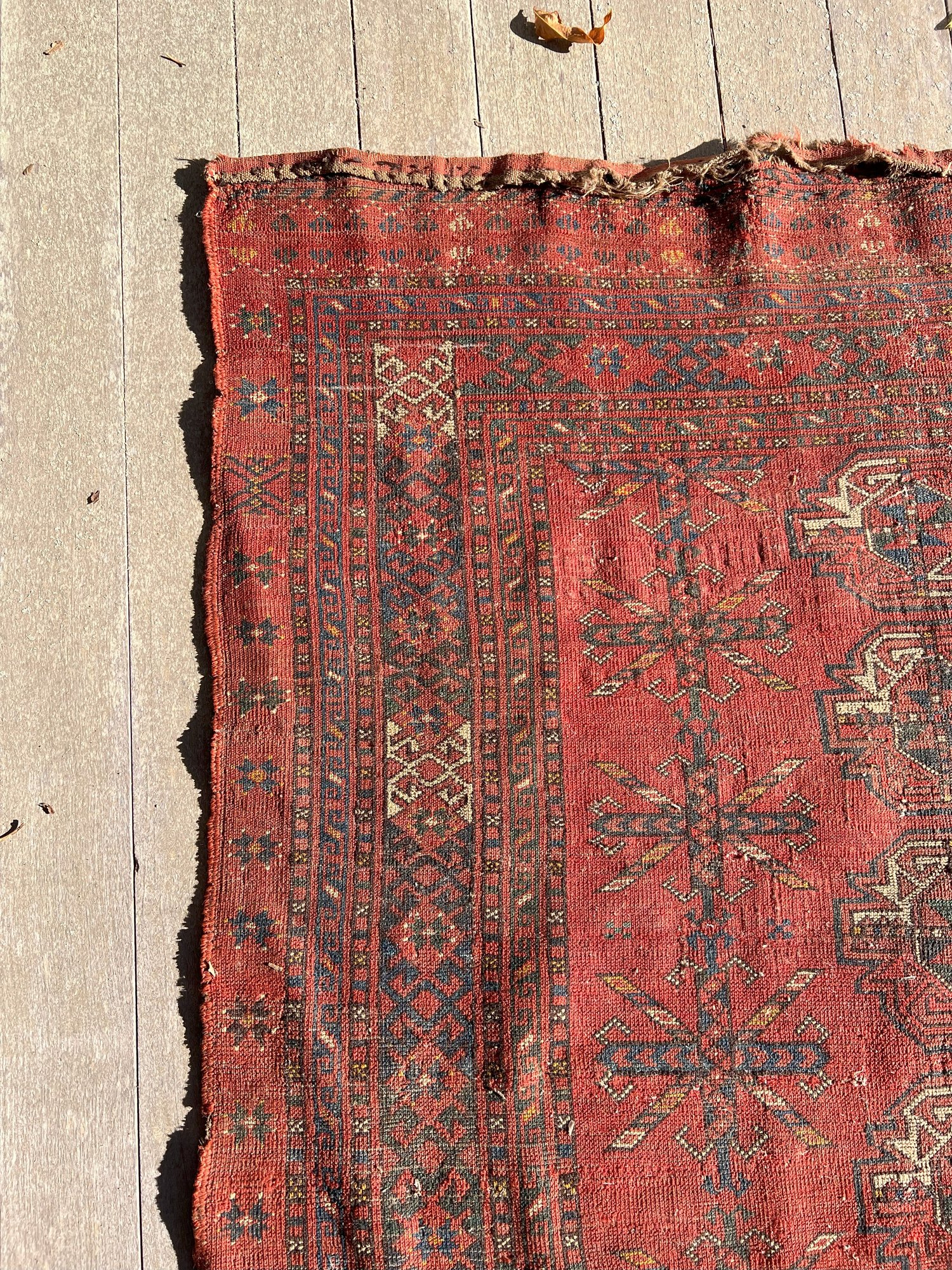 This is a beautiful antique rug, a real oldie, though it shows some wear around the edges.