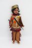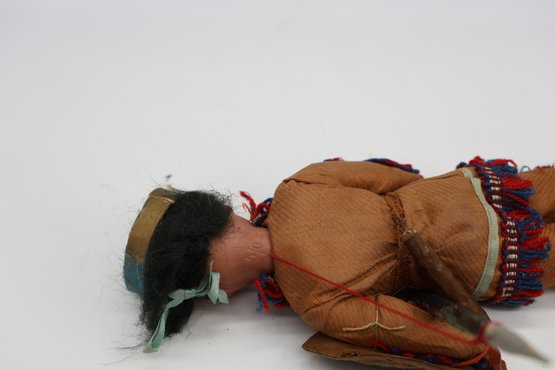Dressed in original clothing, the doll features a bisque head with painted eyebrows, lashes, and lips. She has brown eyes.