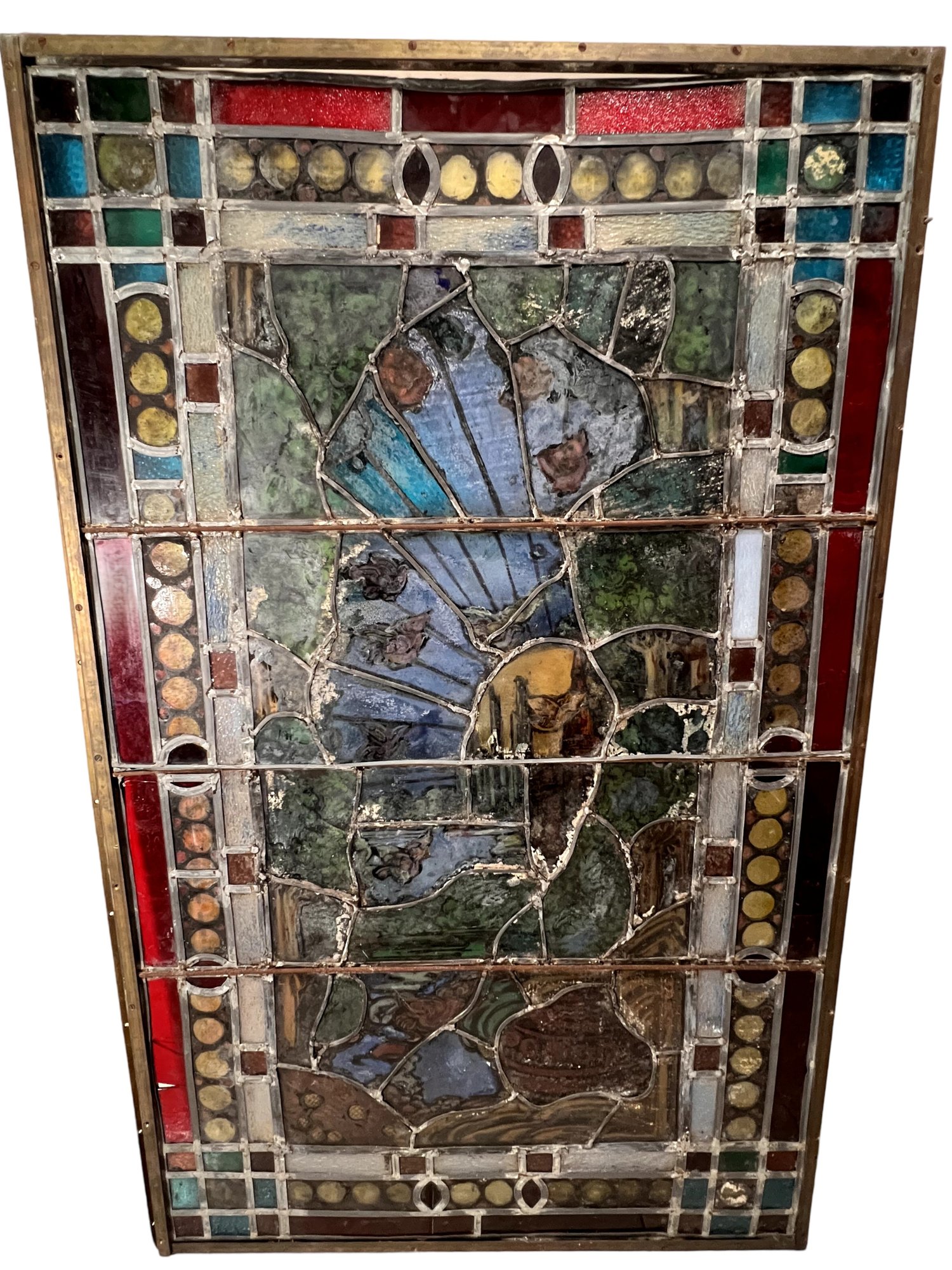 Beautifully crafted antique stained glass with flowers, trees, and birds in spectacular colors has a metal frame. Colors are brilliant! Very unique. Starting to come out out of the top of the frame , needs some help with that, see photo.