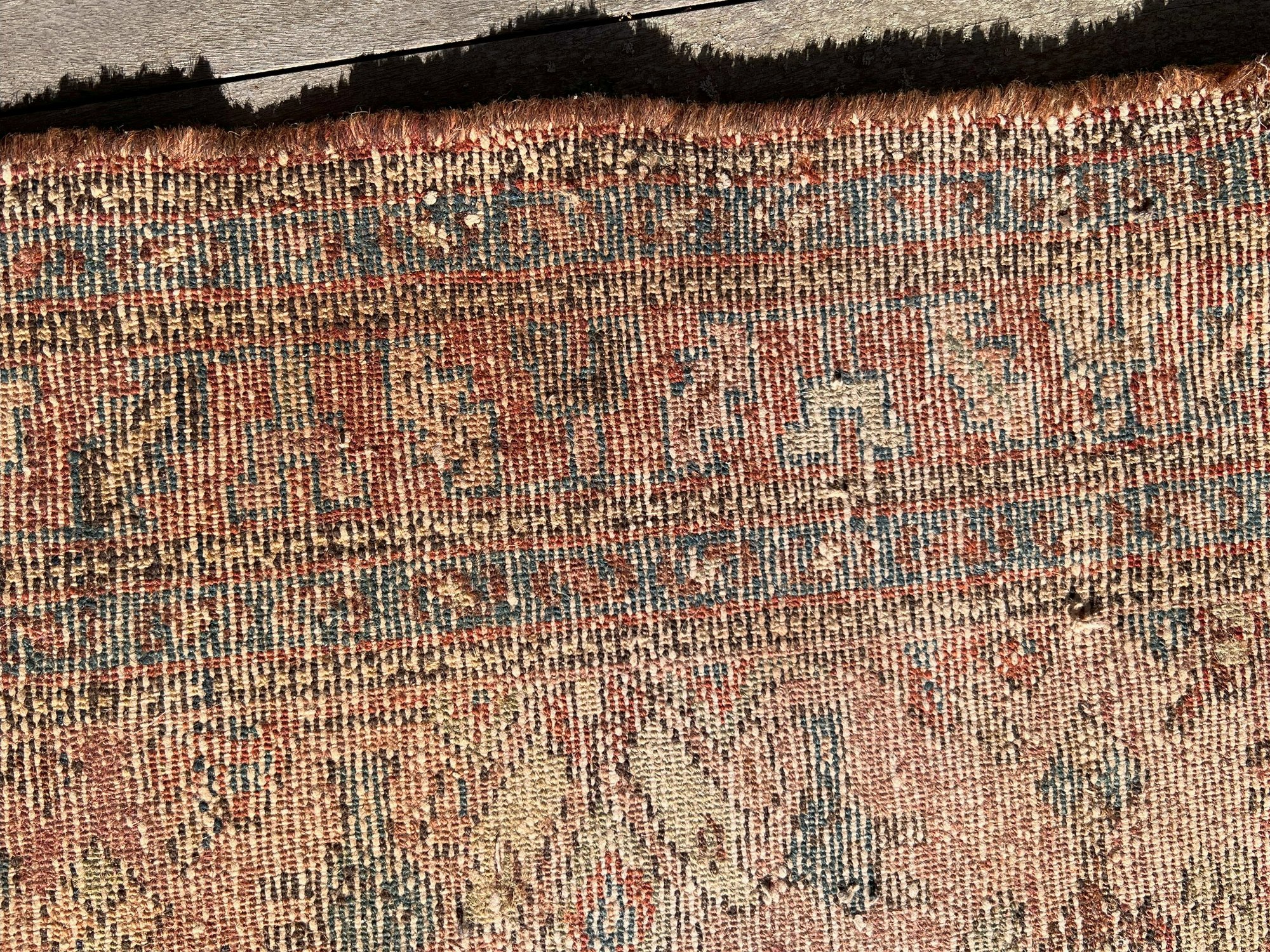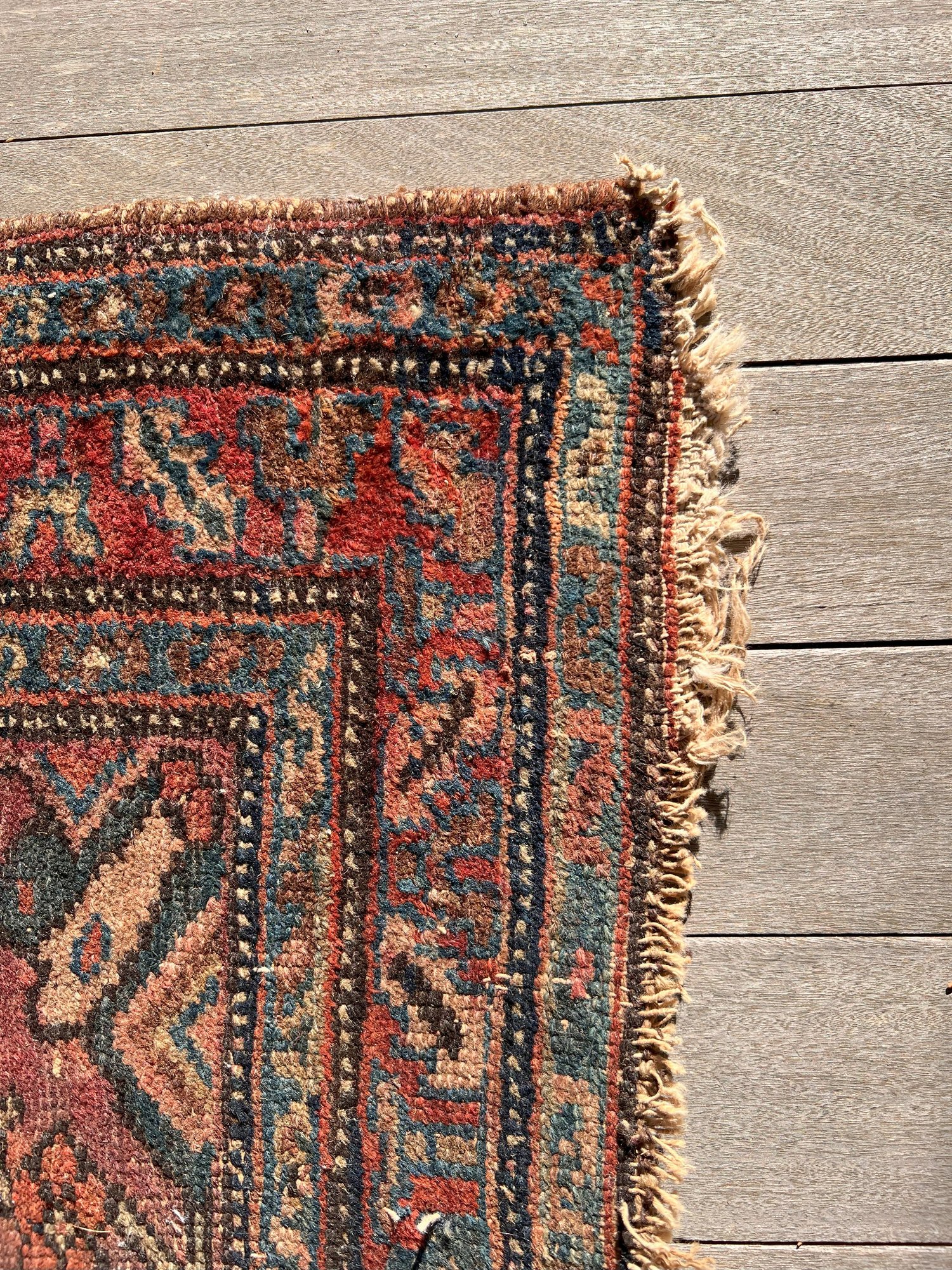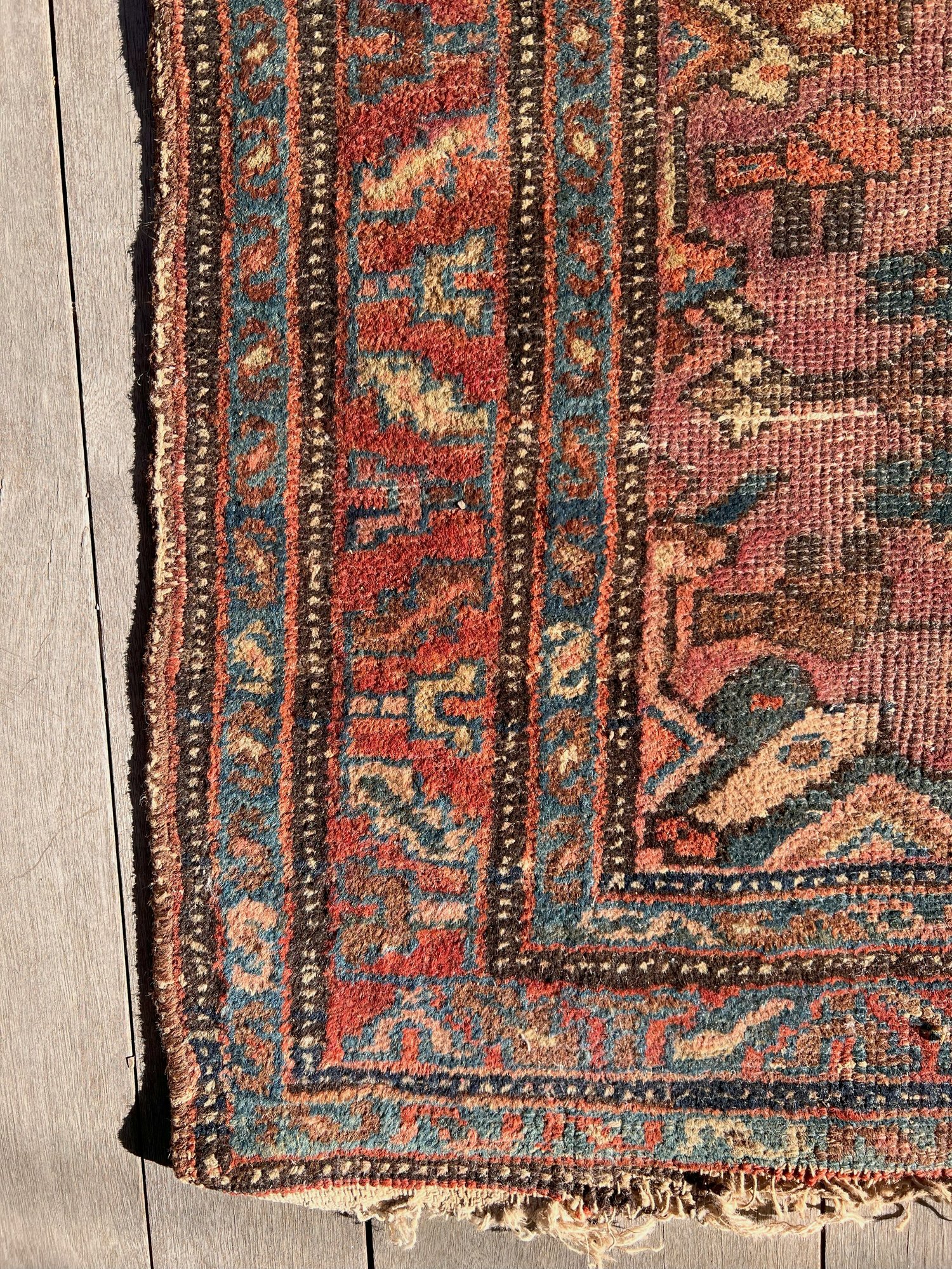 A great old antique handmade rug has some wear and fraying on the edges. Despite its issues, this rug is undeniably fantastic.