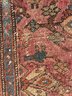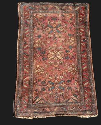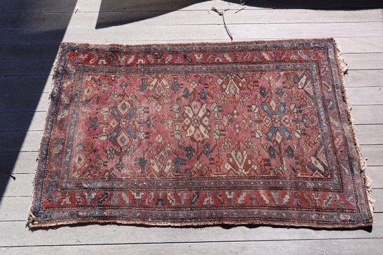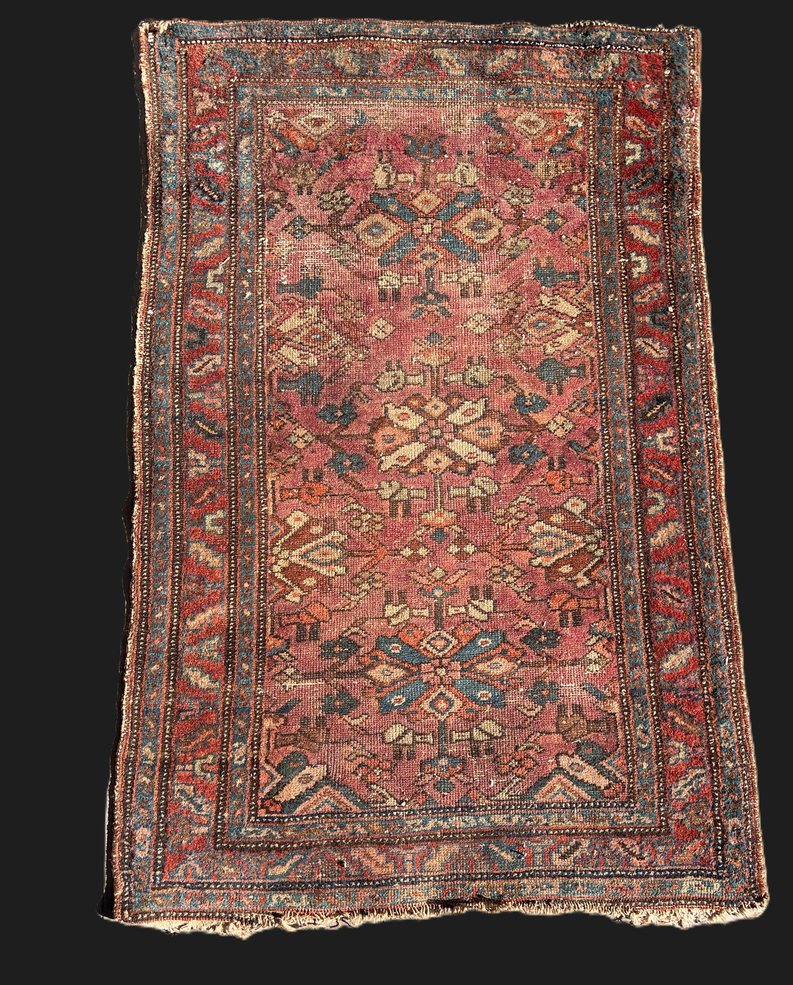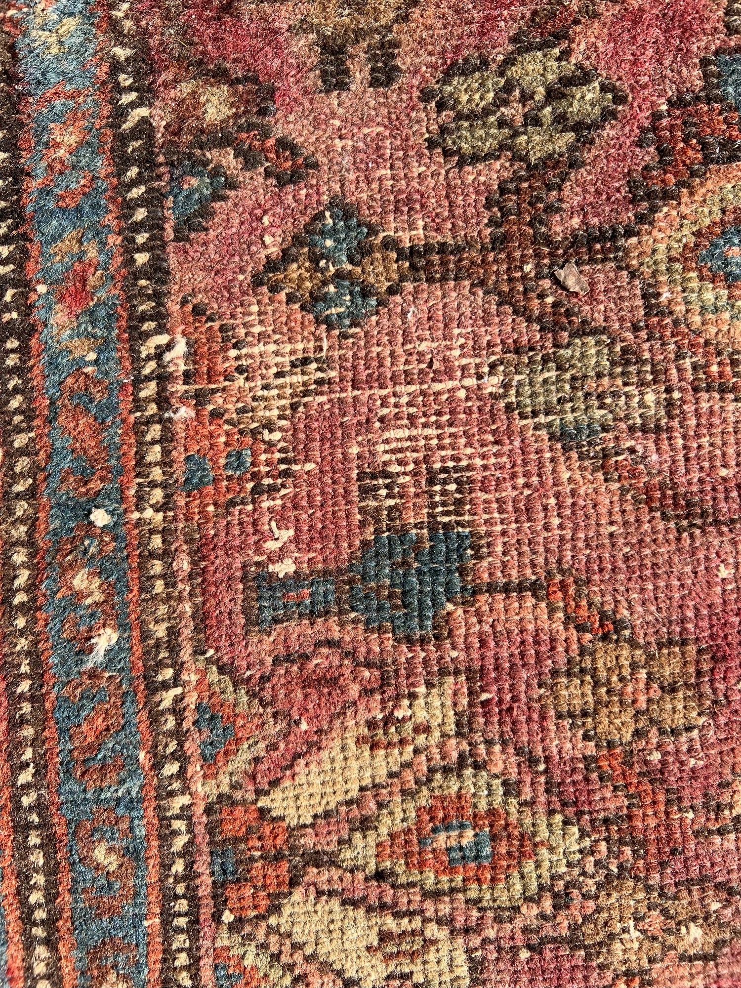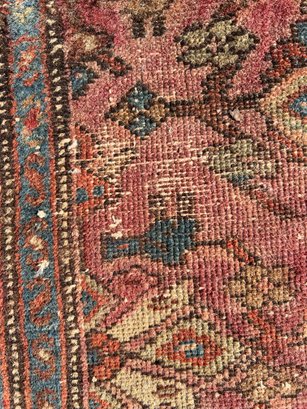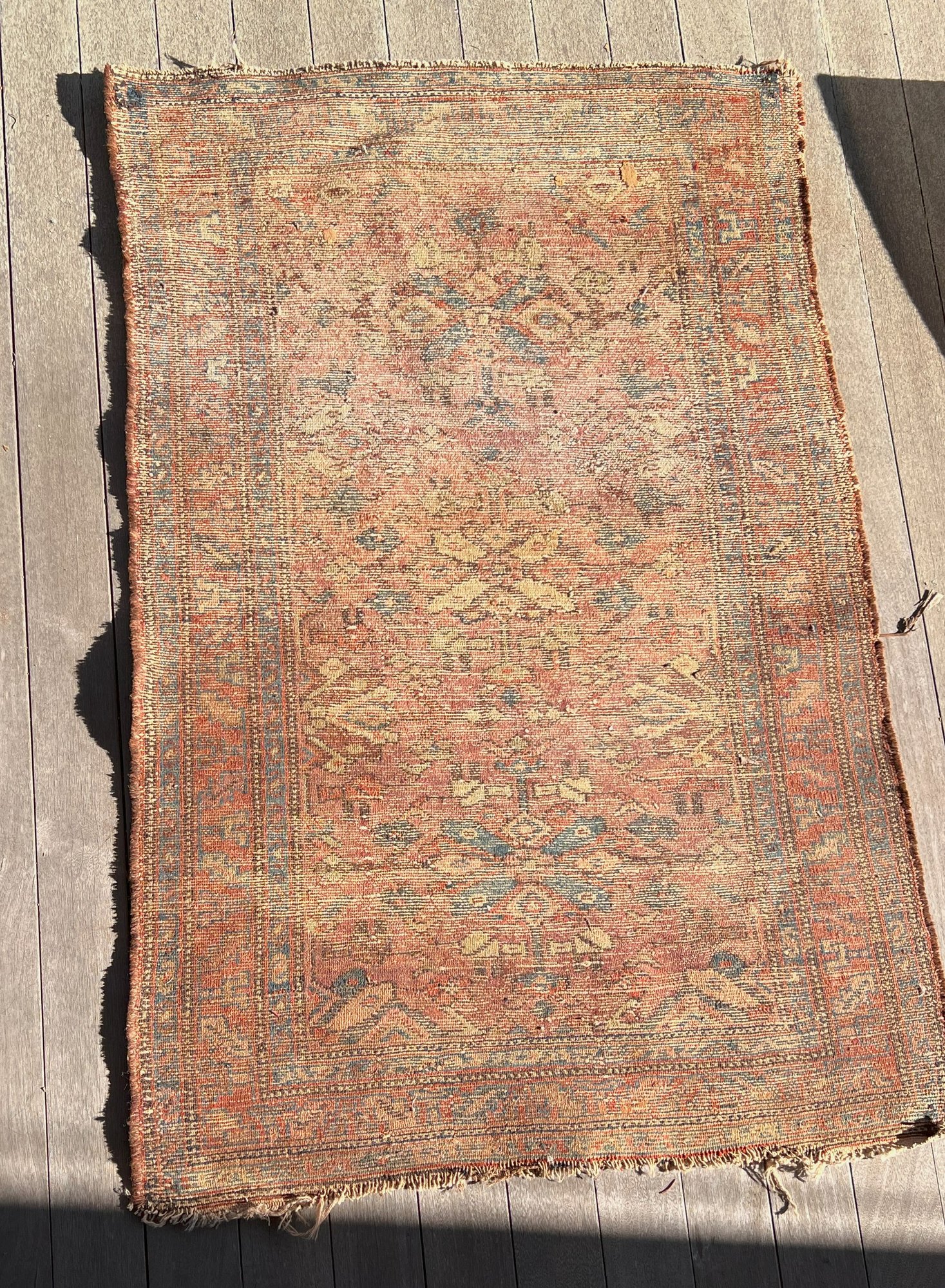 A great old antique handmade rug has some wear and fraying on the edges. Despite its issues, this rug is undeniably fantastic.