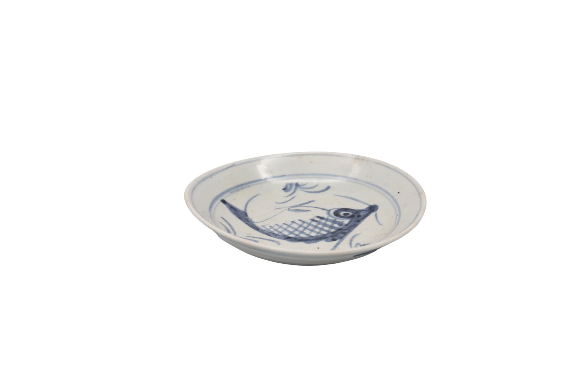 1- Antique underglaze blue carp dish with no marking but underside has three groups of grasses and rings around the rim . Chip on bottom rim otherwise nice condition - 5.5"D