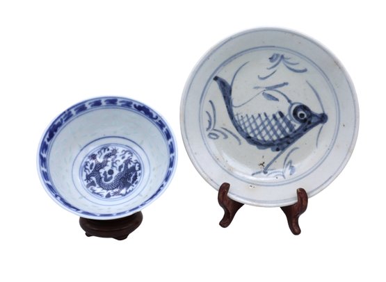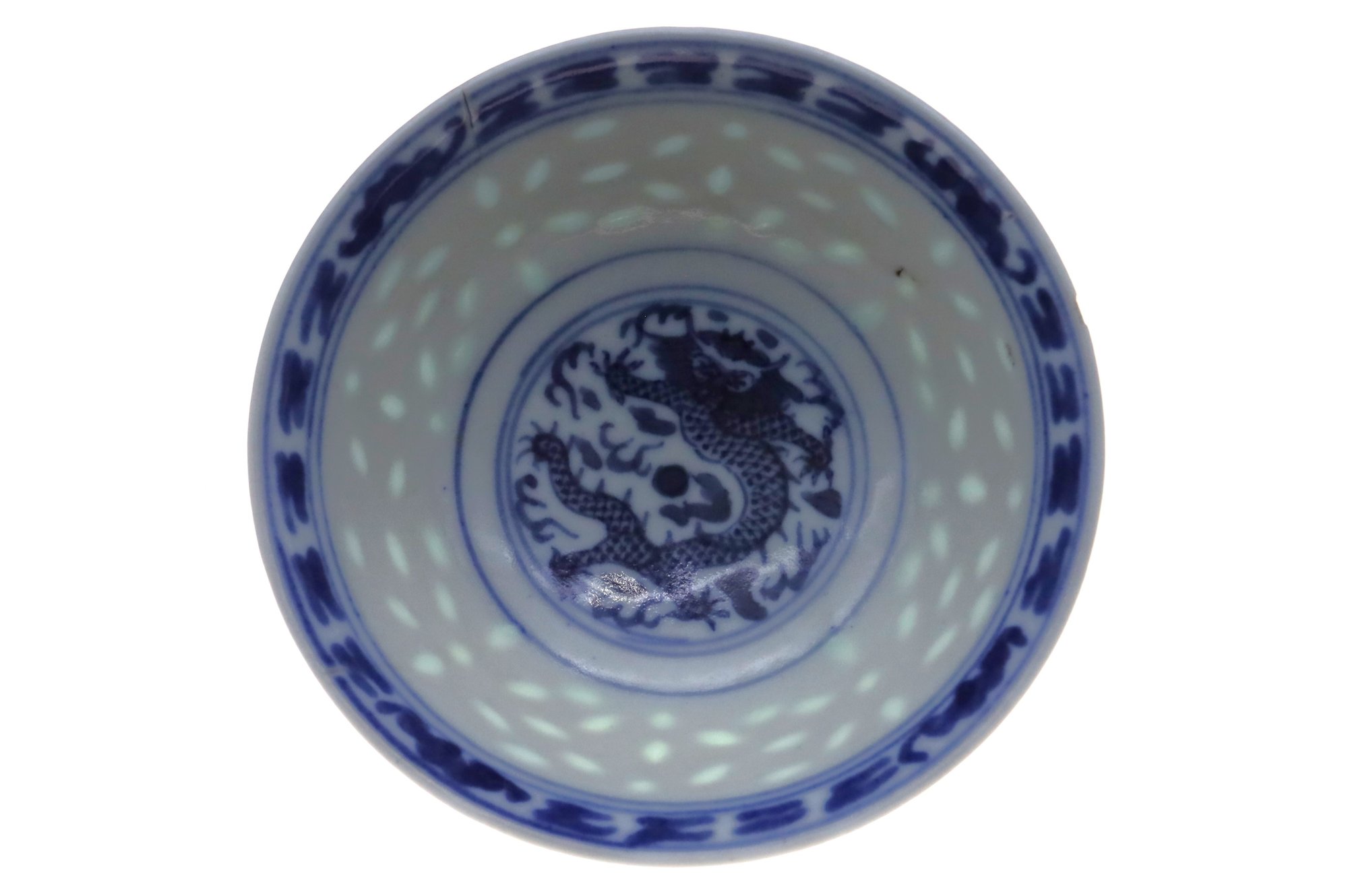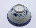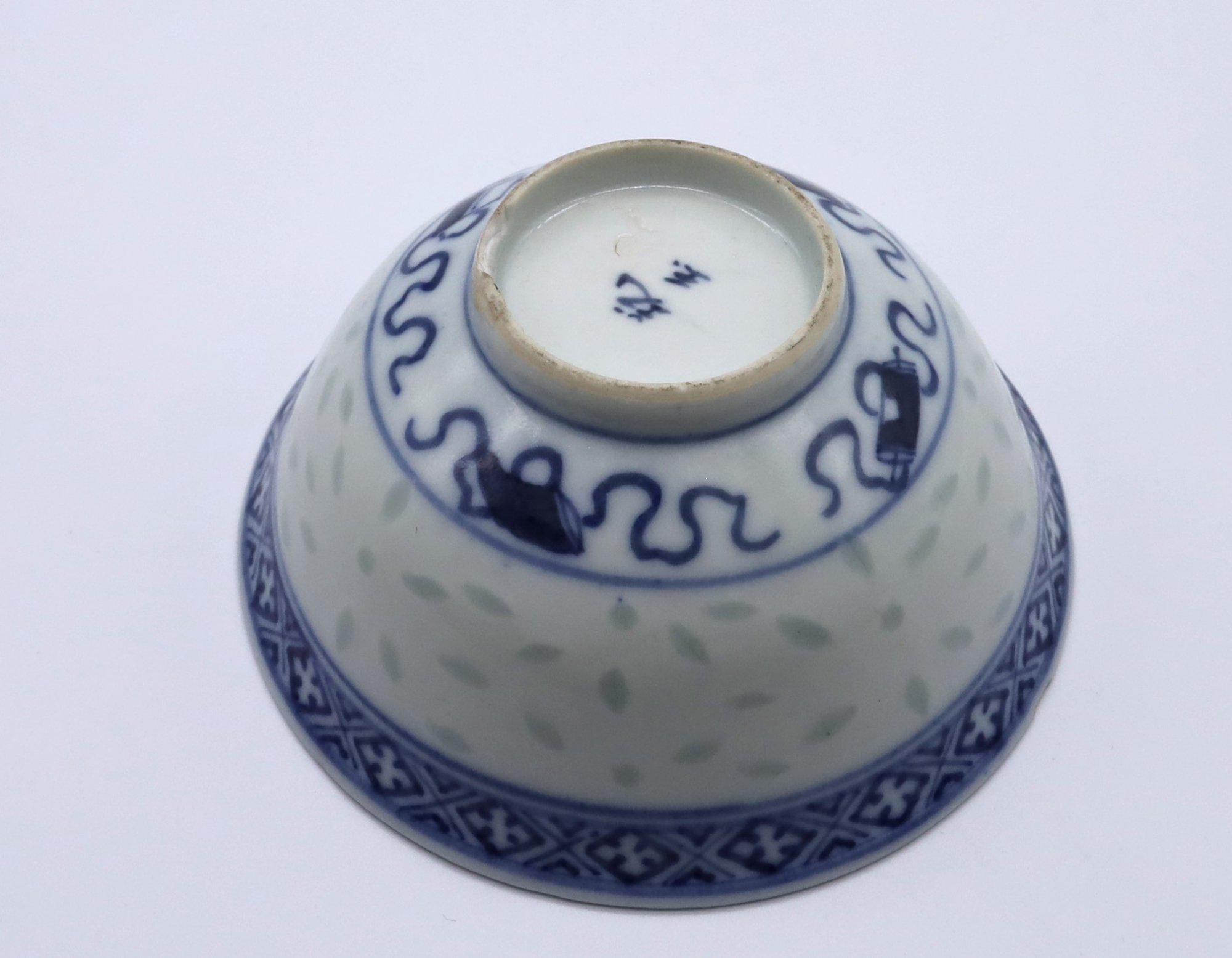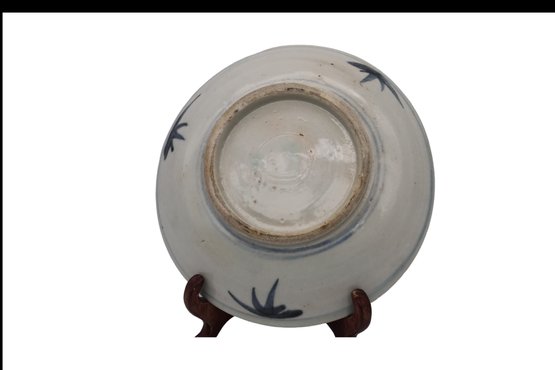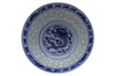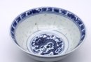 1- antique rice bowl with blue and white porcelain dragon. Base has markings underglaze. fleabite on rim. 4.25"D x 3"H with stand.