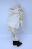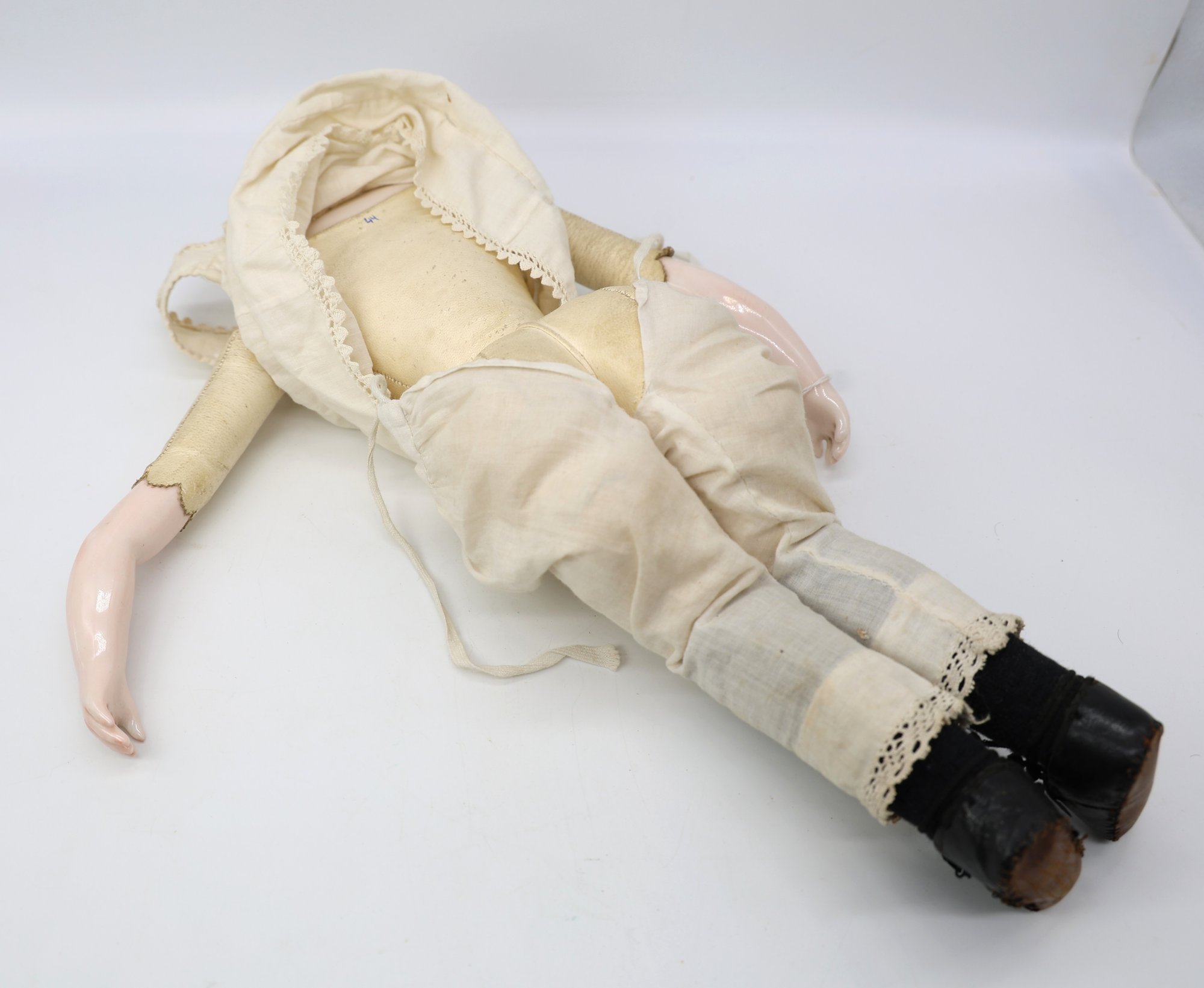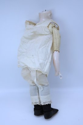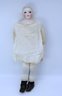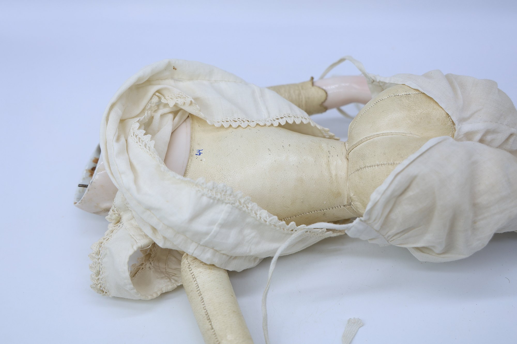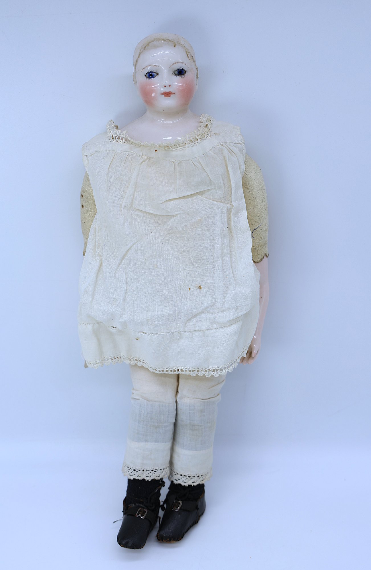 Porcelain face, arms and hands with painted lips, eyebrows and lashes. Blue glass eyes - white leather torso and black leather booties. No hair