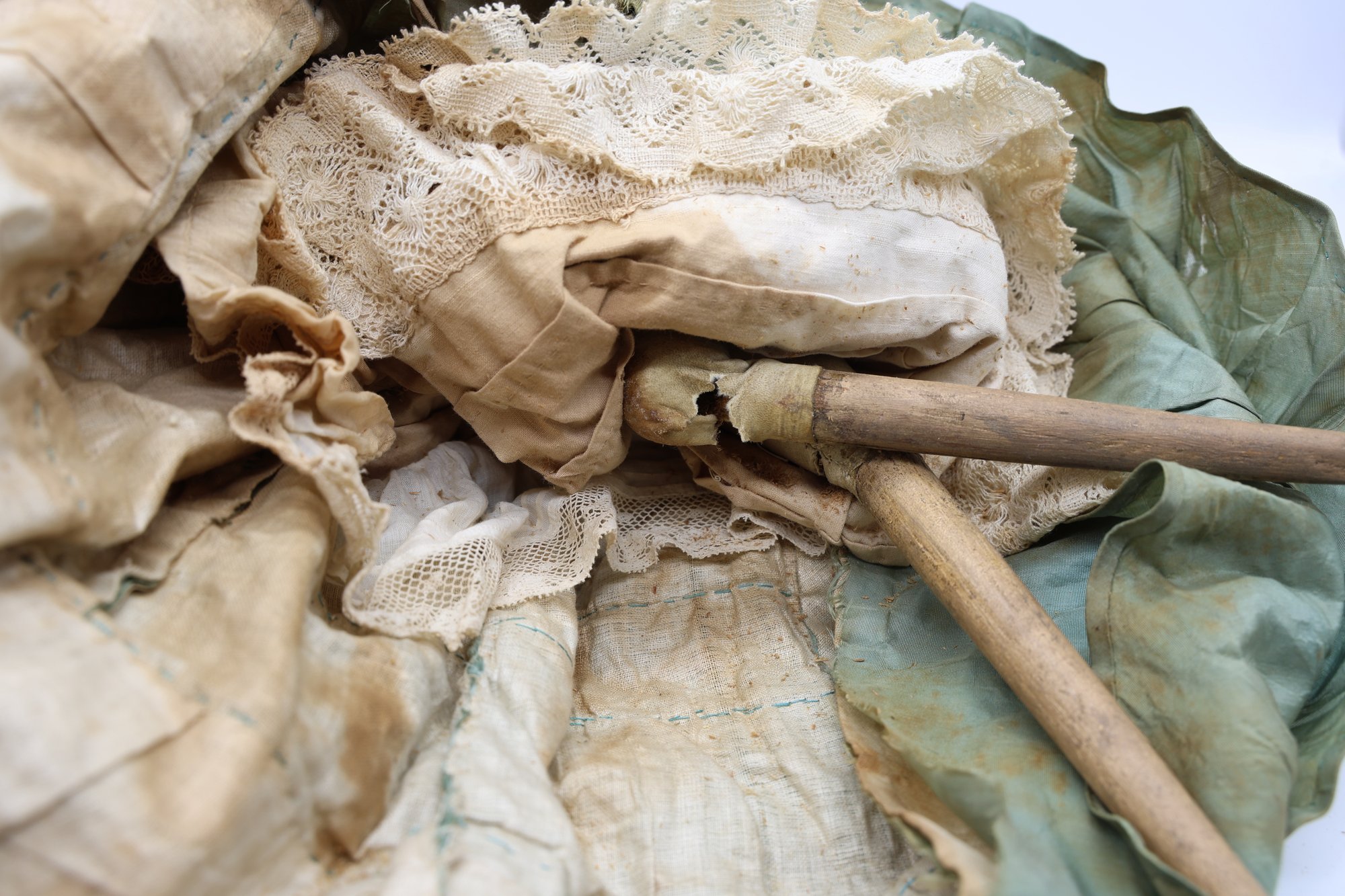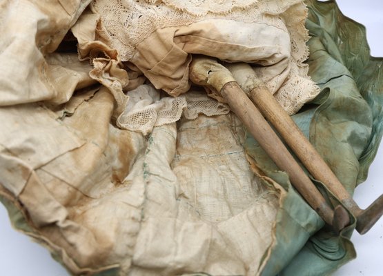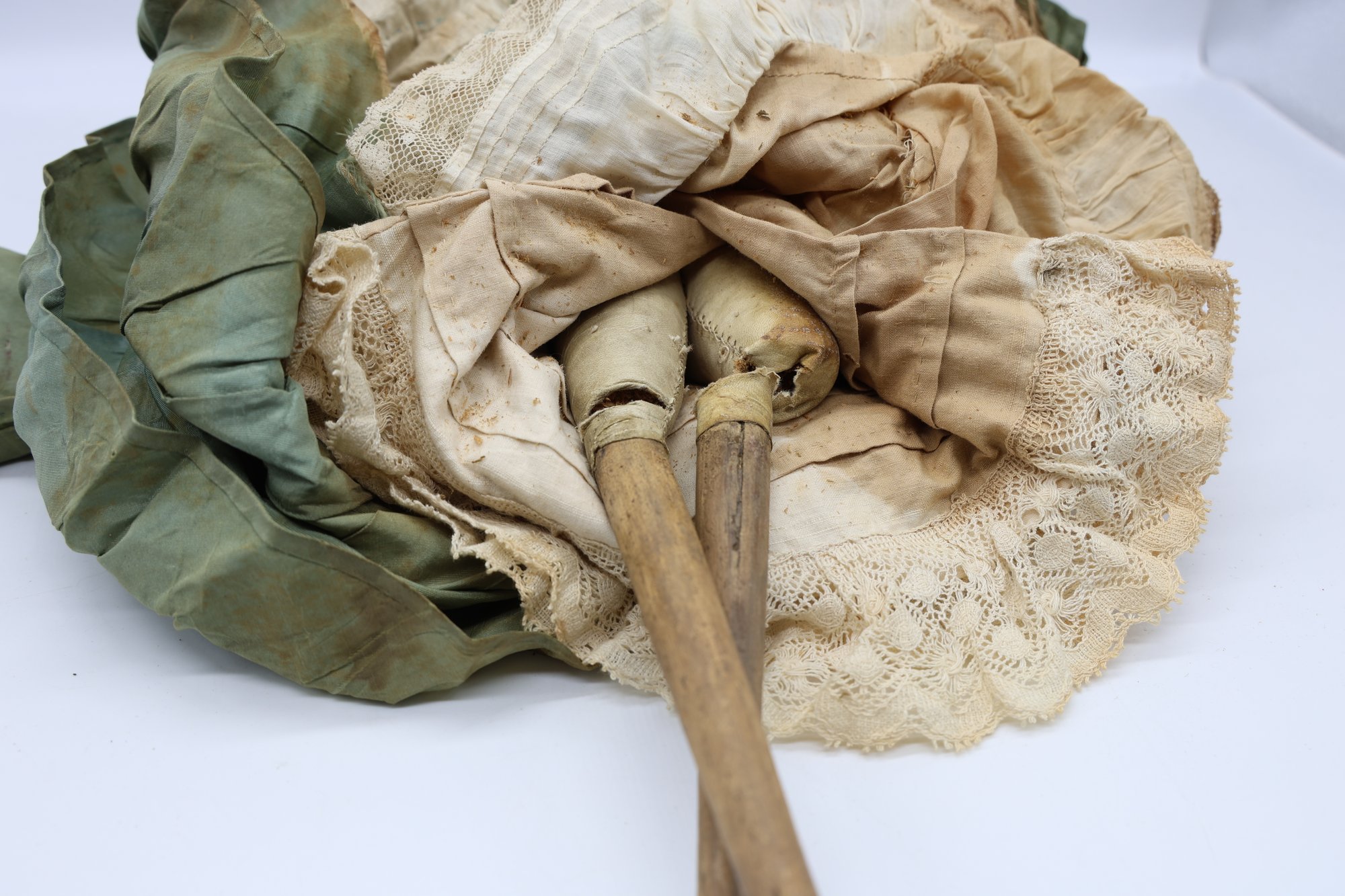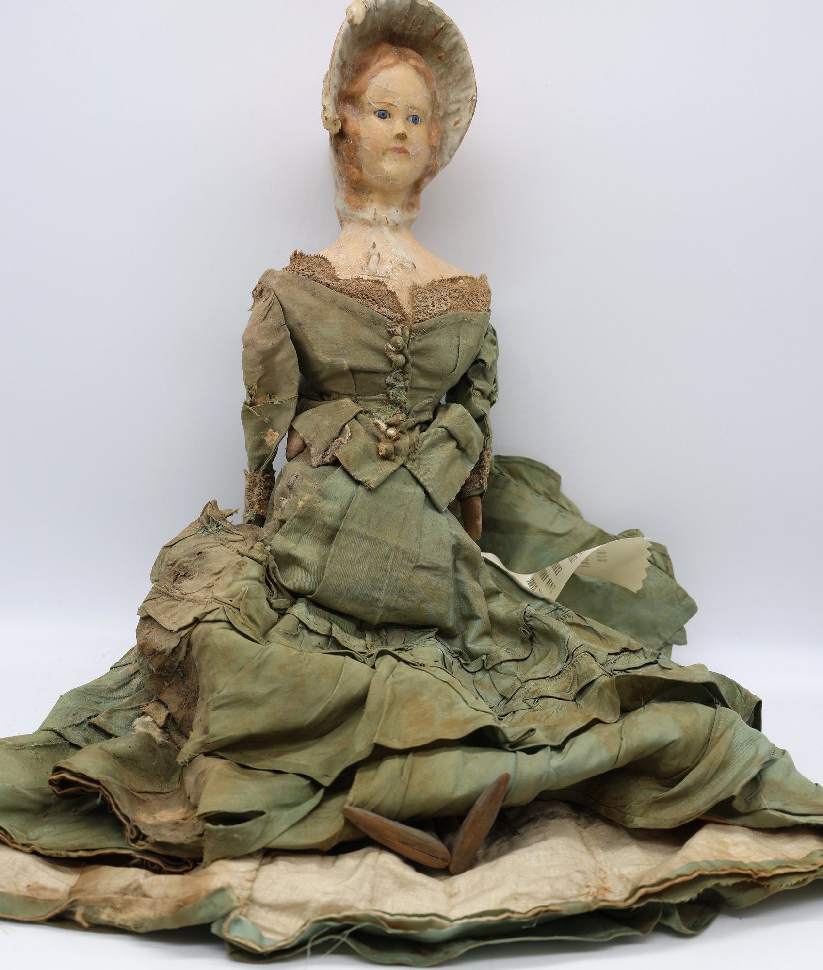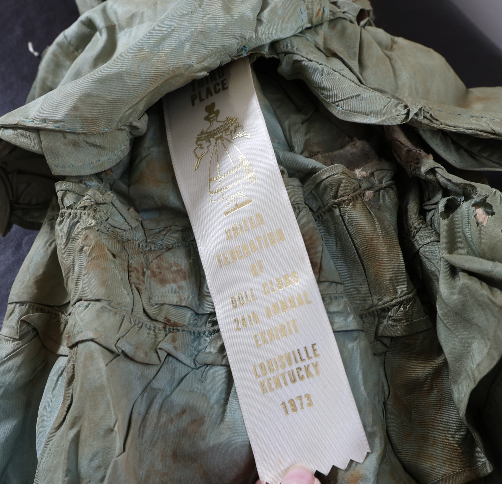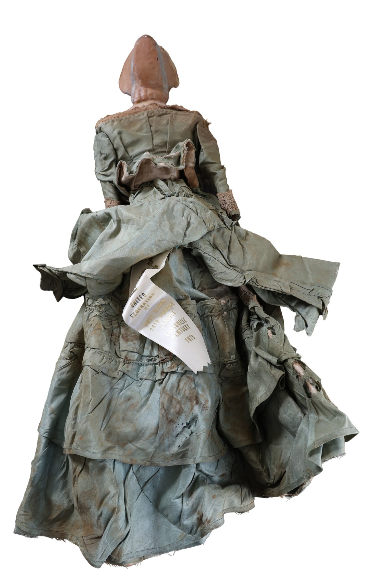 1973 Limited Federation of doll club exhibit Kentucky . Wax head, wooden arms and legs, leather body. Needs mending and clothing need of restoration.