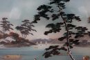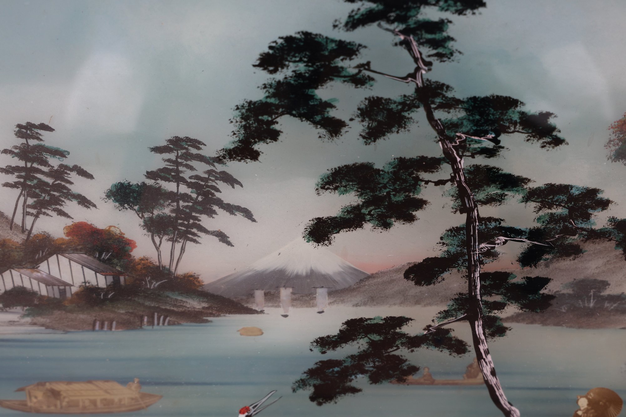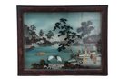 This art form, known as verre églomisé, involves painting an image on the back of a glass pane so it can be viewed from the front. The painting depicts a traditional Japanese landscape scene with two prominent cranes in the foreground, figures of people—possibly geishas or other historical figures—on the right side, traditional architecture and houses, a body of water with small boats, a prominent dark tree, and stylized distant mountains or hills resembling Mount Fuji in some related artworks. The piece originates from East Asia, likely Japan, and exemplifies reverse paintings made for the Western market, particularly during the 18th-19th centuries. It is framed in an original dark, possibly lacquered, wooden frame with some decorative elements.