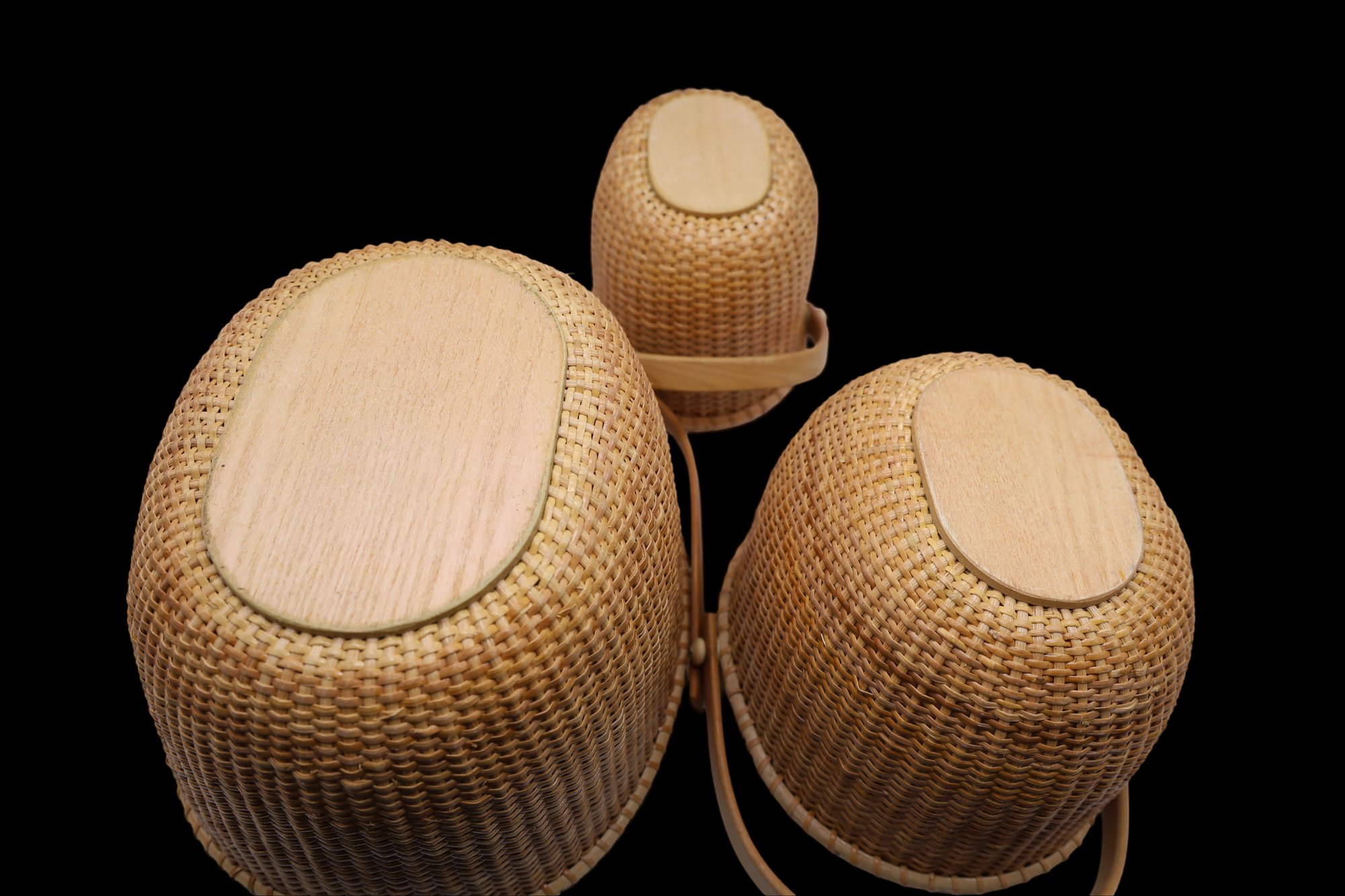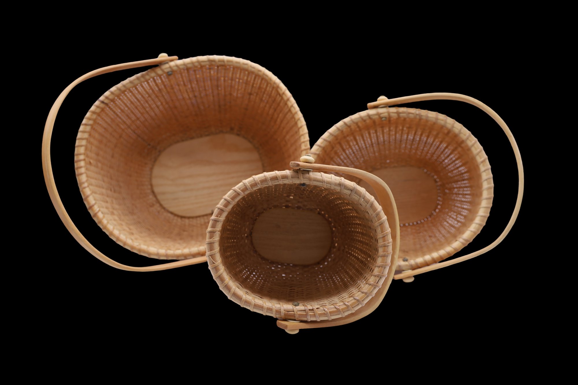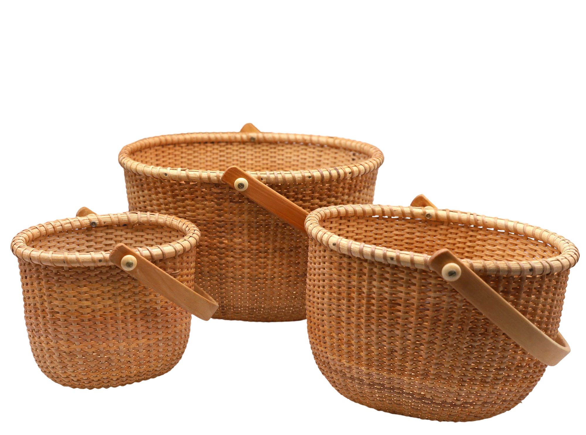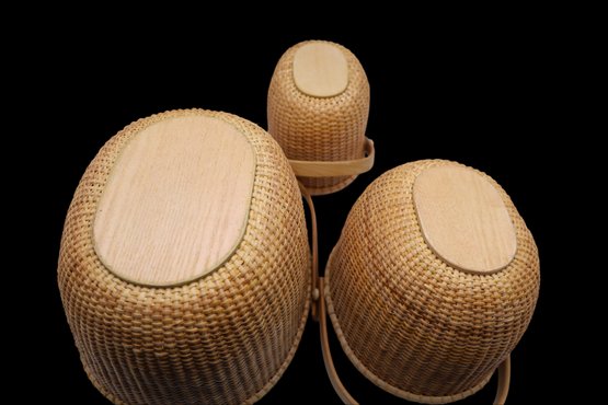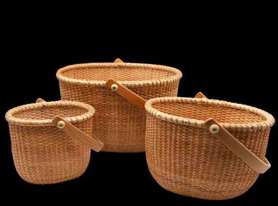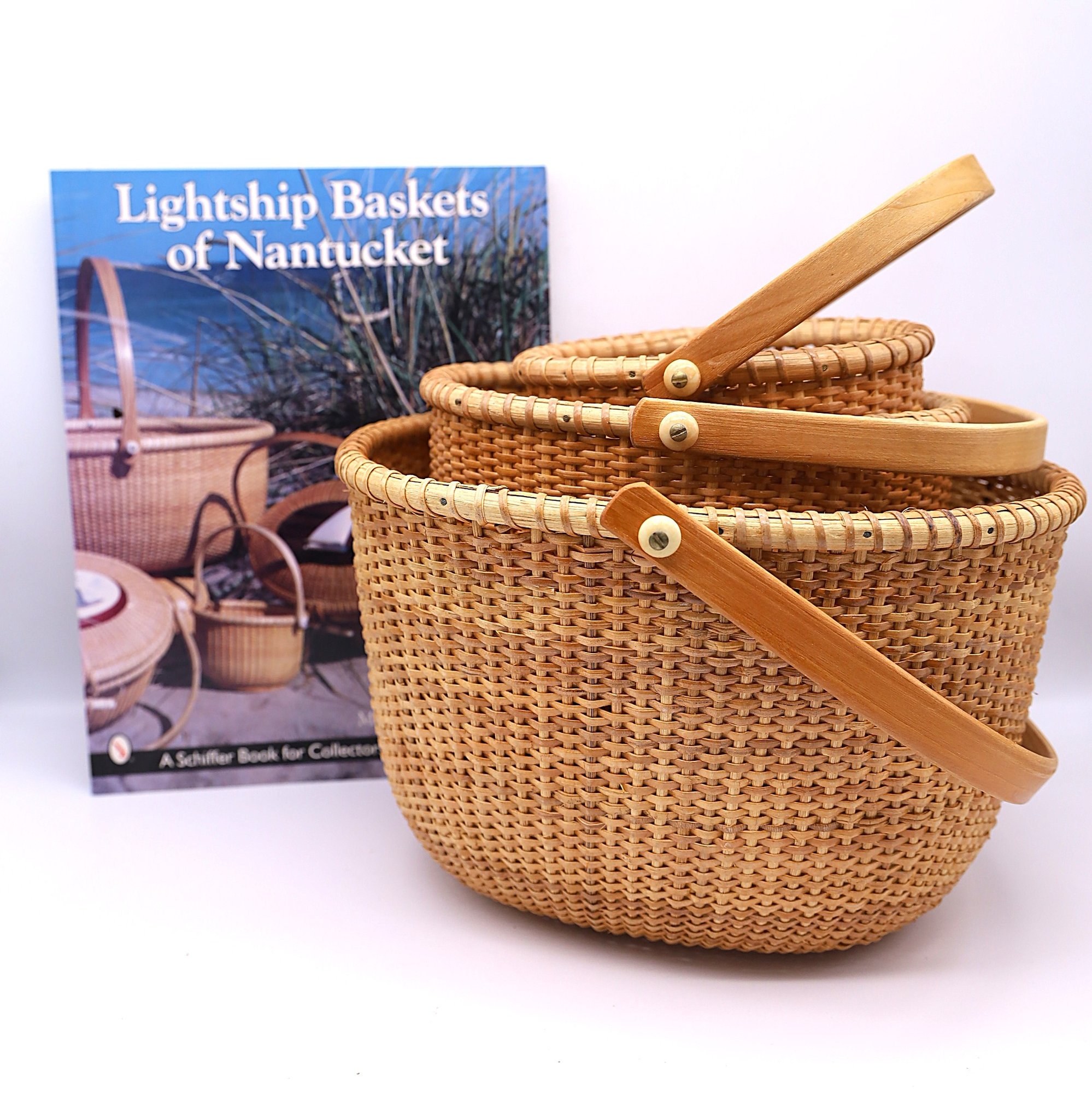 Oval shape with wooden handles. Includes the book, "Lightship Baskets of Nantucket." Dimensions: 10.5" x 9", 8" x 7", 6" x 5".