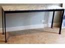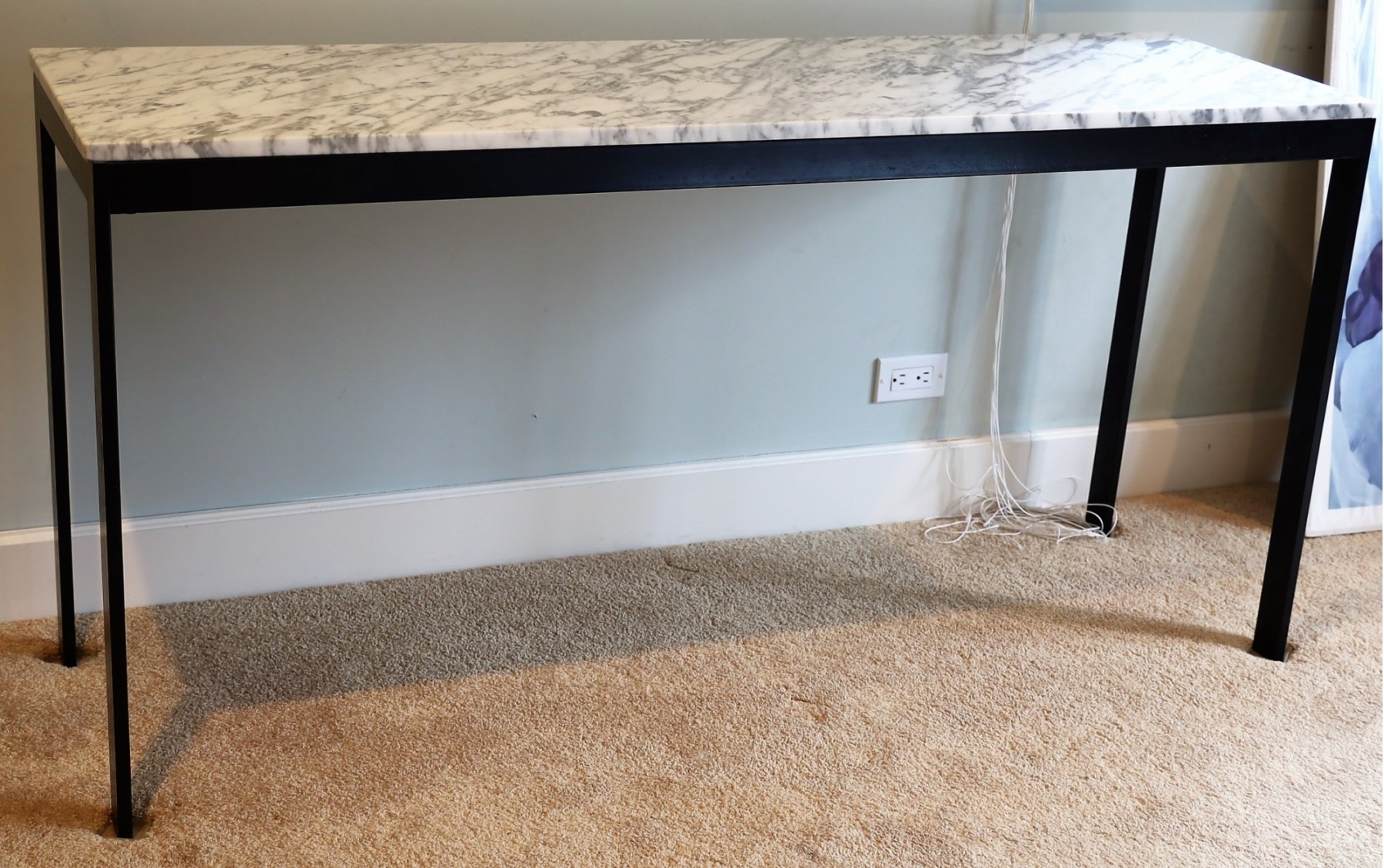 Parsons style white & gray marble top table with a dark steel base. In good condition.