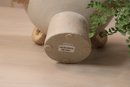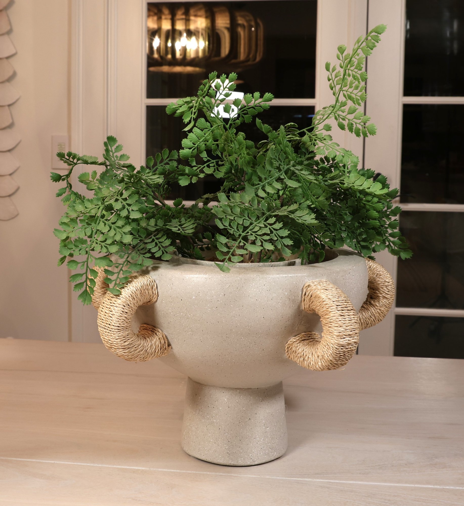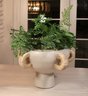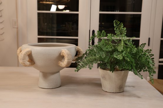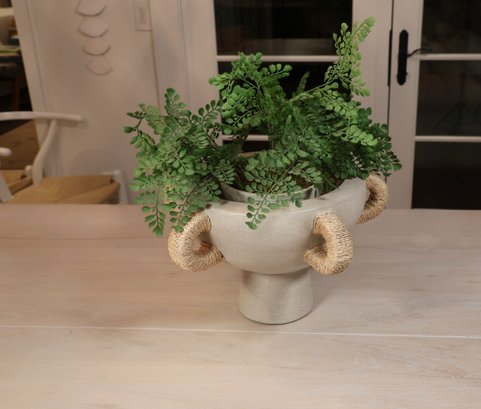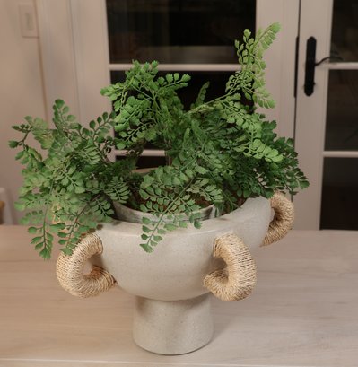 Natural materials in this Clyde centerpiece to create a kylix shaped piece with five abaca wrapped handles. This is done in terracotta can be in indoors or outdoors.