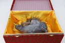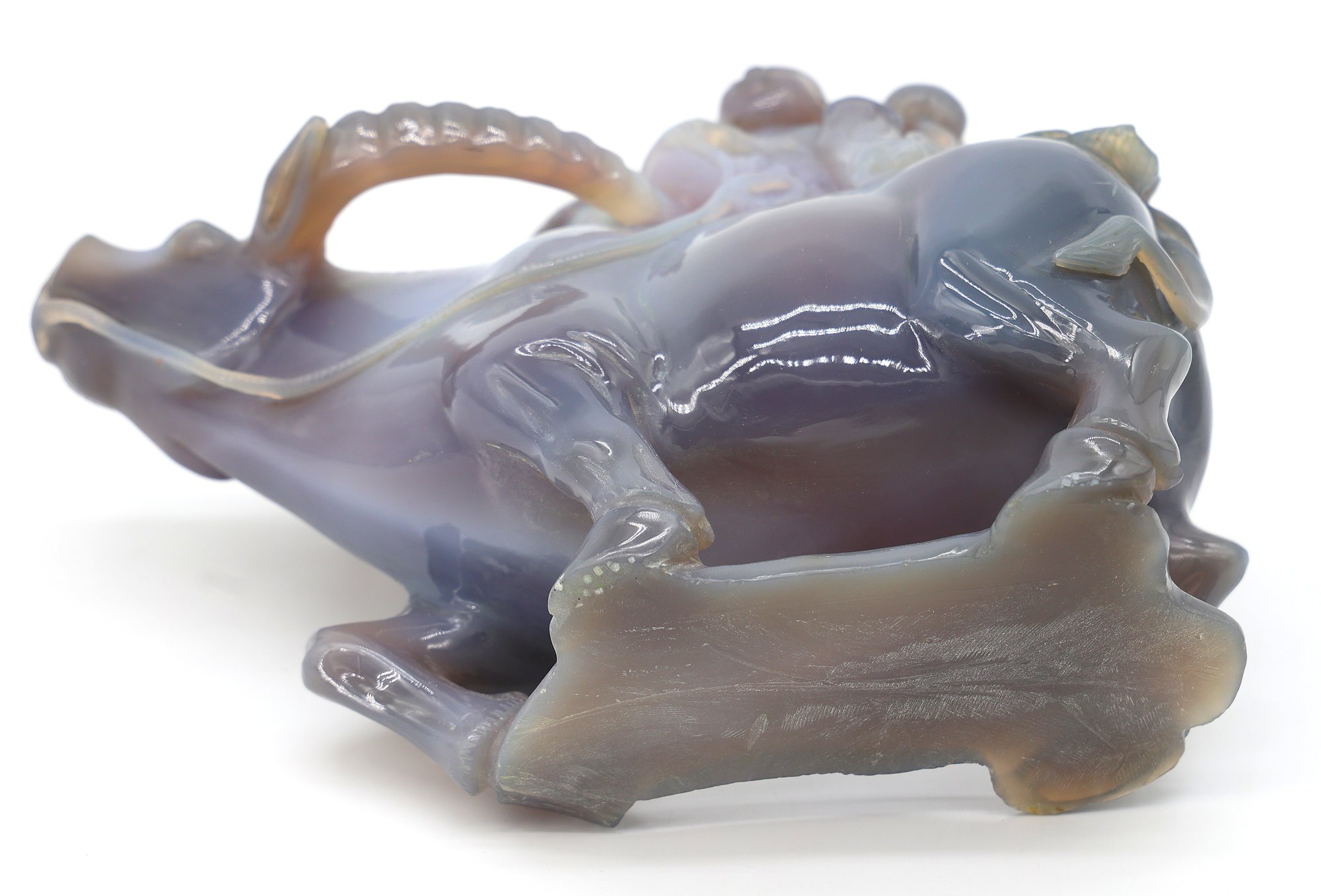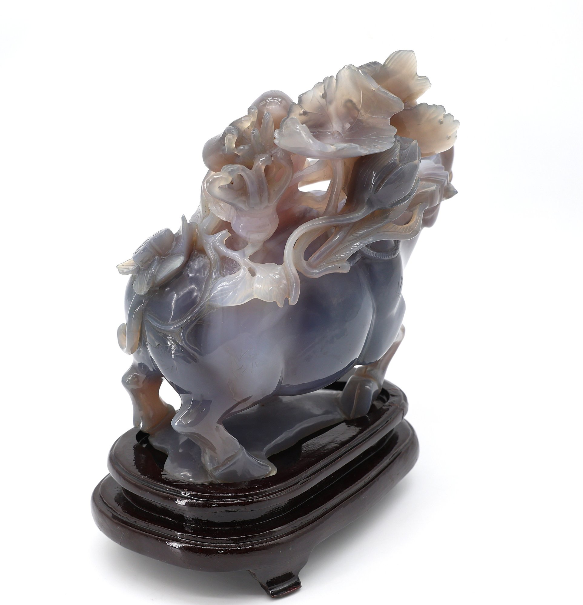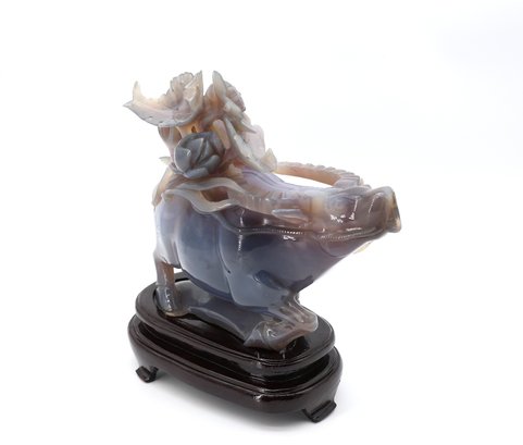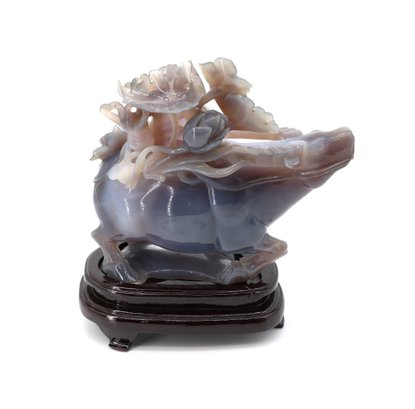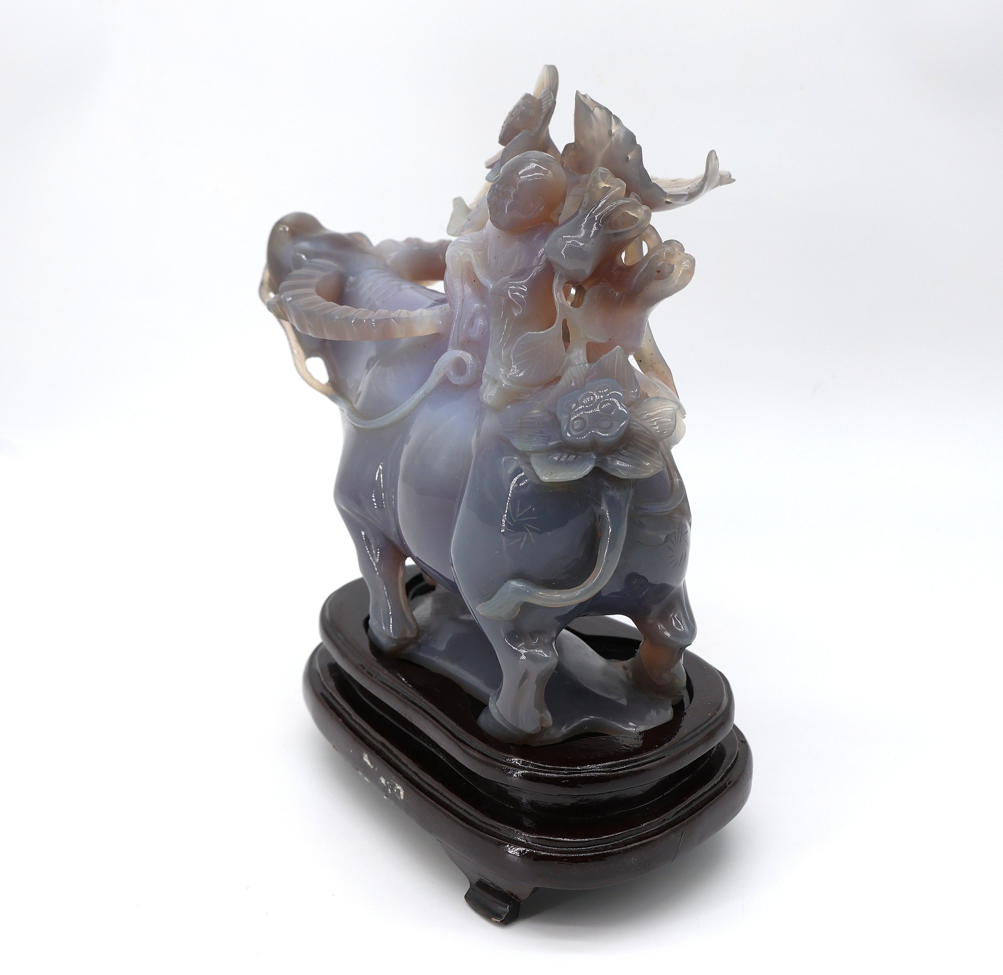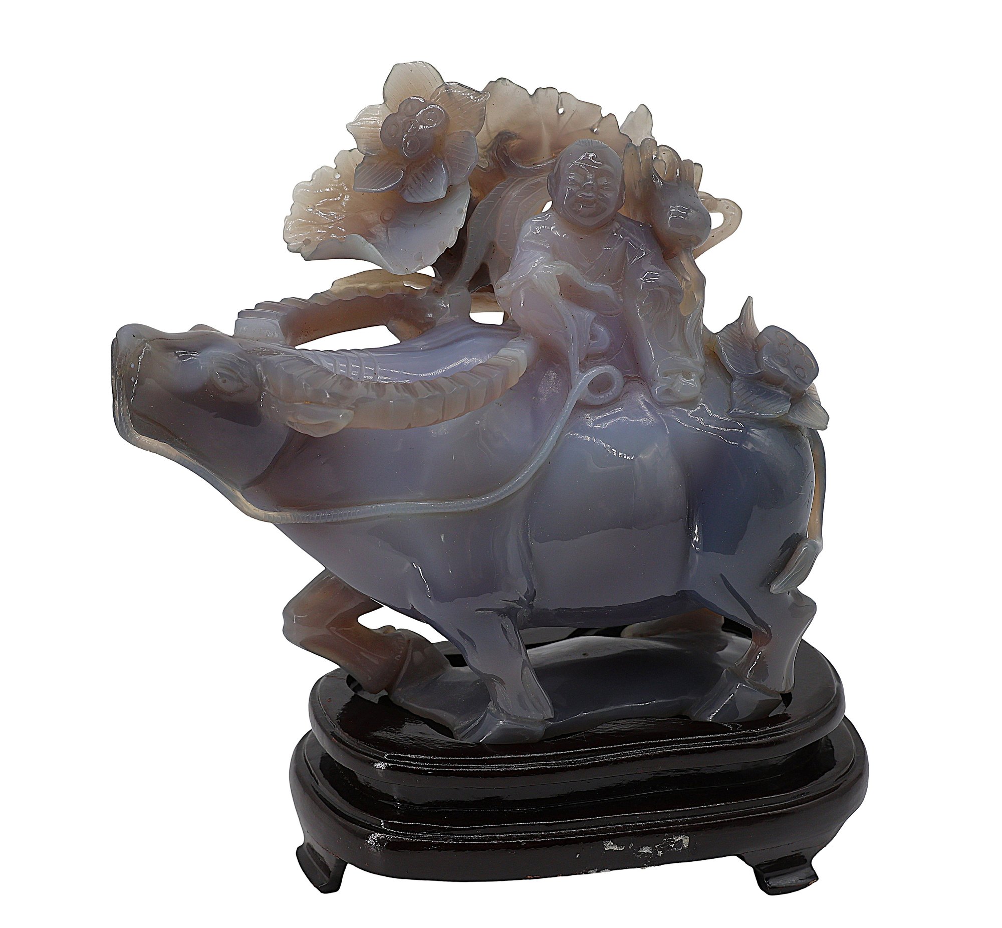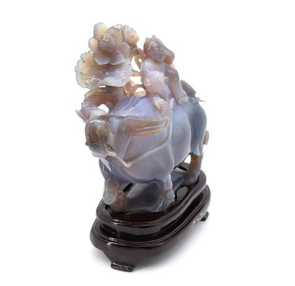 Depicting a figure, possibly a Tongzi boy or Quan Yin, riding a water buffalo, mounted on a wooden base.9.5"W x 8.5"H -height is not included in the measurement