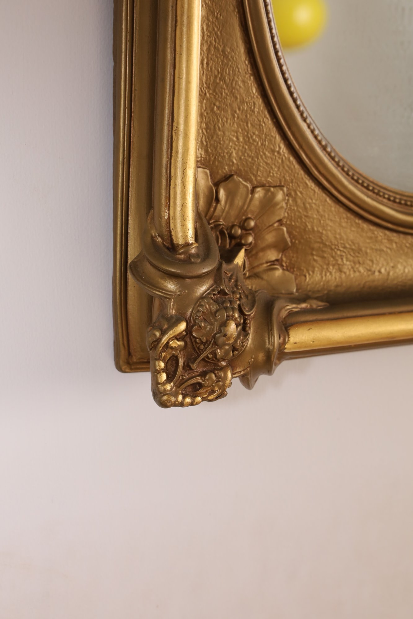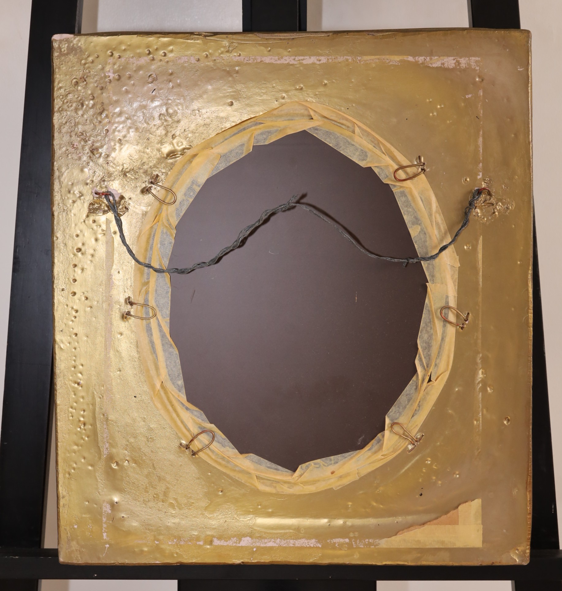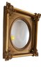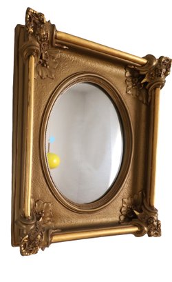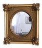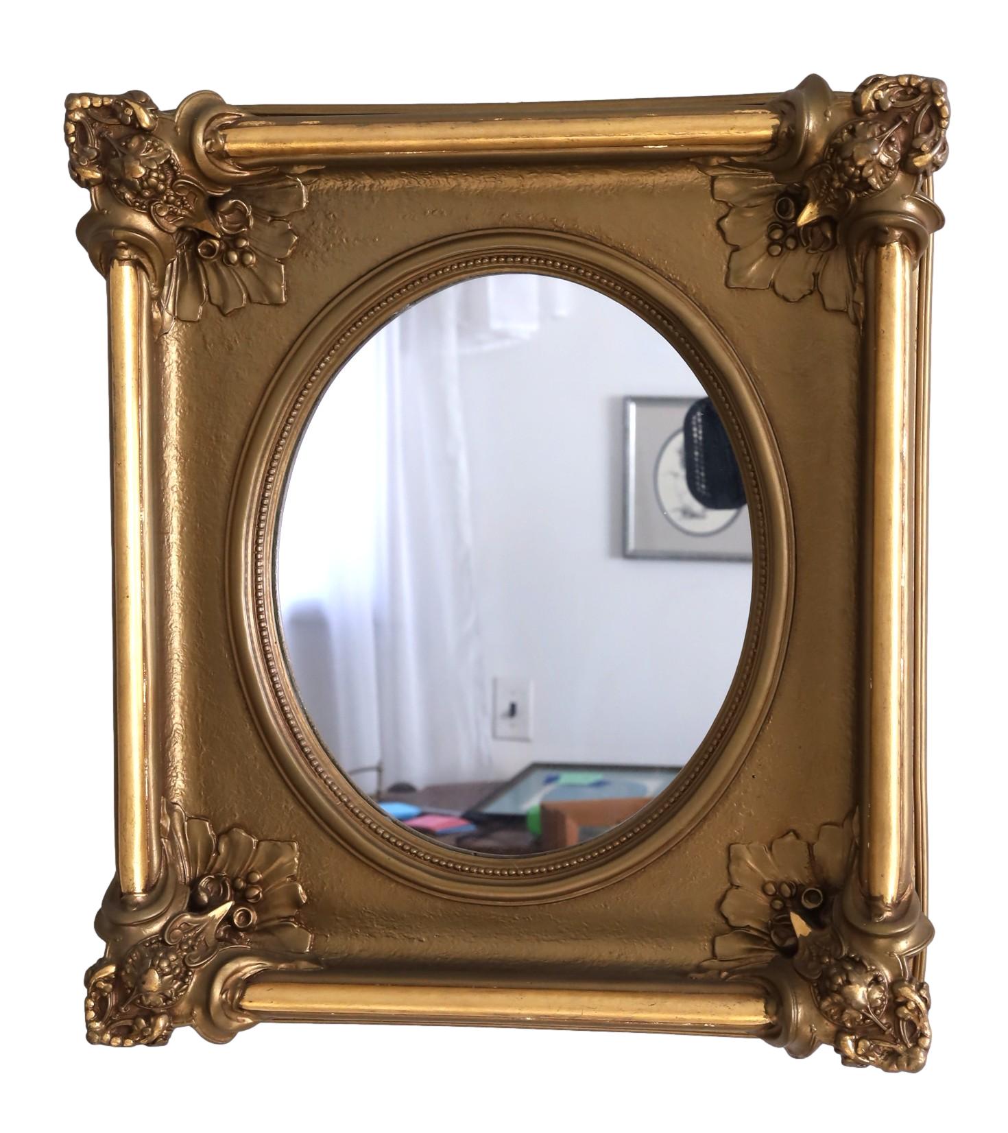 This mirror has a substantial weight. The frame is mainly square, enclosing an oval mirror. It displays detailed, raised decorations that evoke Rococo or Baroque styles. Each frame corner is adorned with decorative pieces featuring leaf patterns, scrollwork, fruits, and floral designs. Crafted from plaster, it boasts a gilded finish. - 16"W x 18.5"H x 2.75"D
