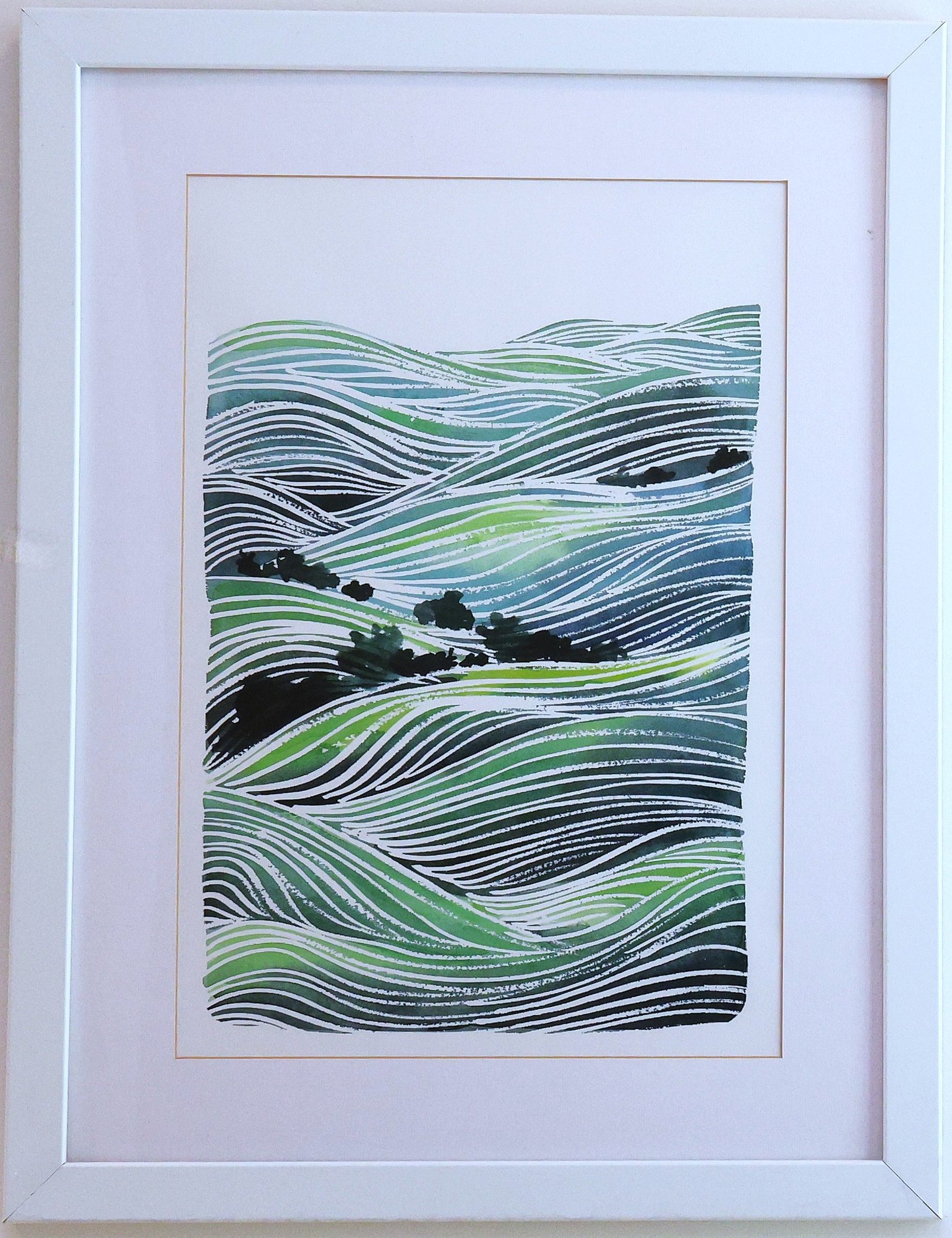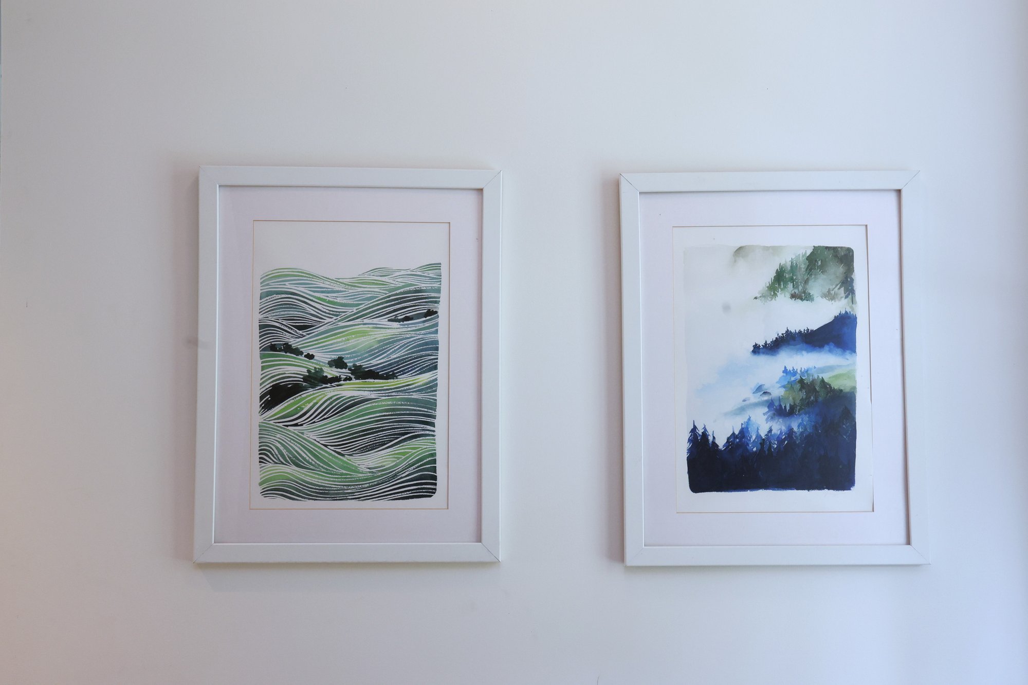 Nature inspired art prints. One by watercoulorist Yao Cheng and pencil signed lower right. Both have matching white frames.