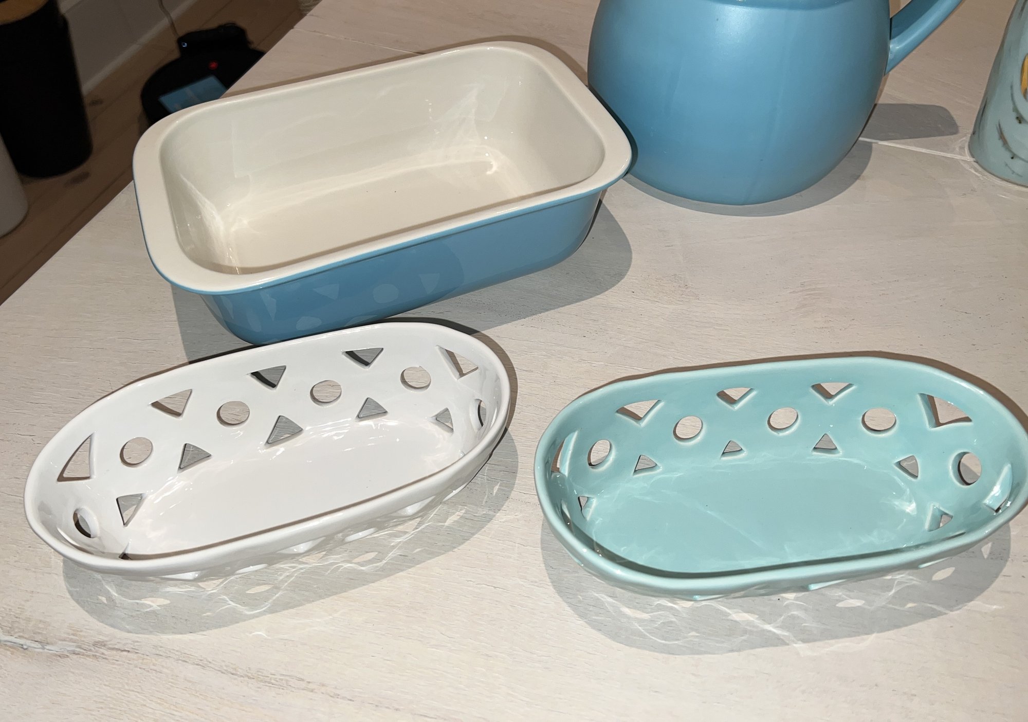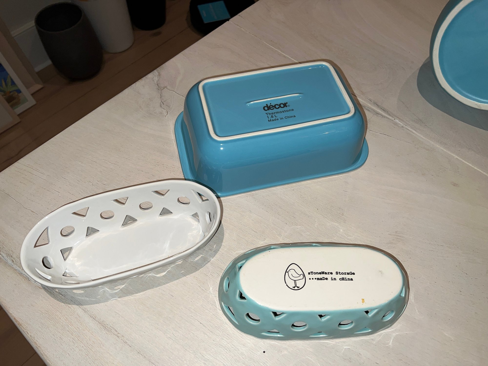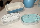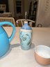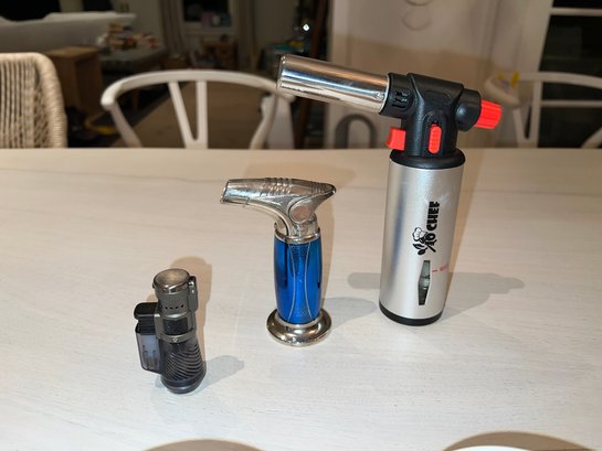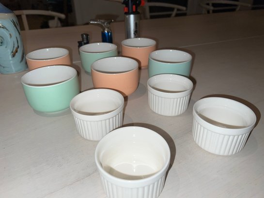 8"L decor baking dish. 8"L stoneware storage, canvas home pitcher 8"H, Tpuzz oil container, 4 white creme brulee containers, 6 colored creme brulee containers, 3 butane lighters (2 working and 1 Jo chef needs to be re-filled)