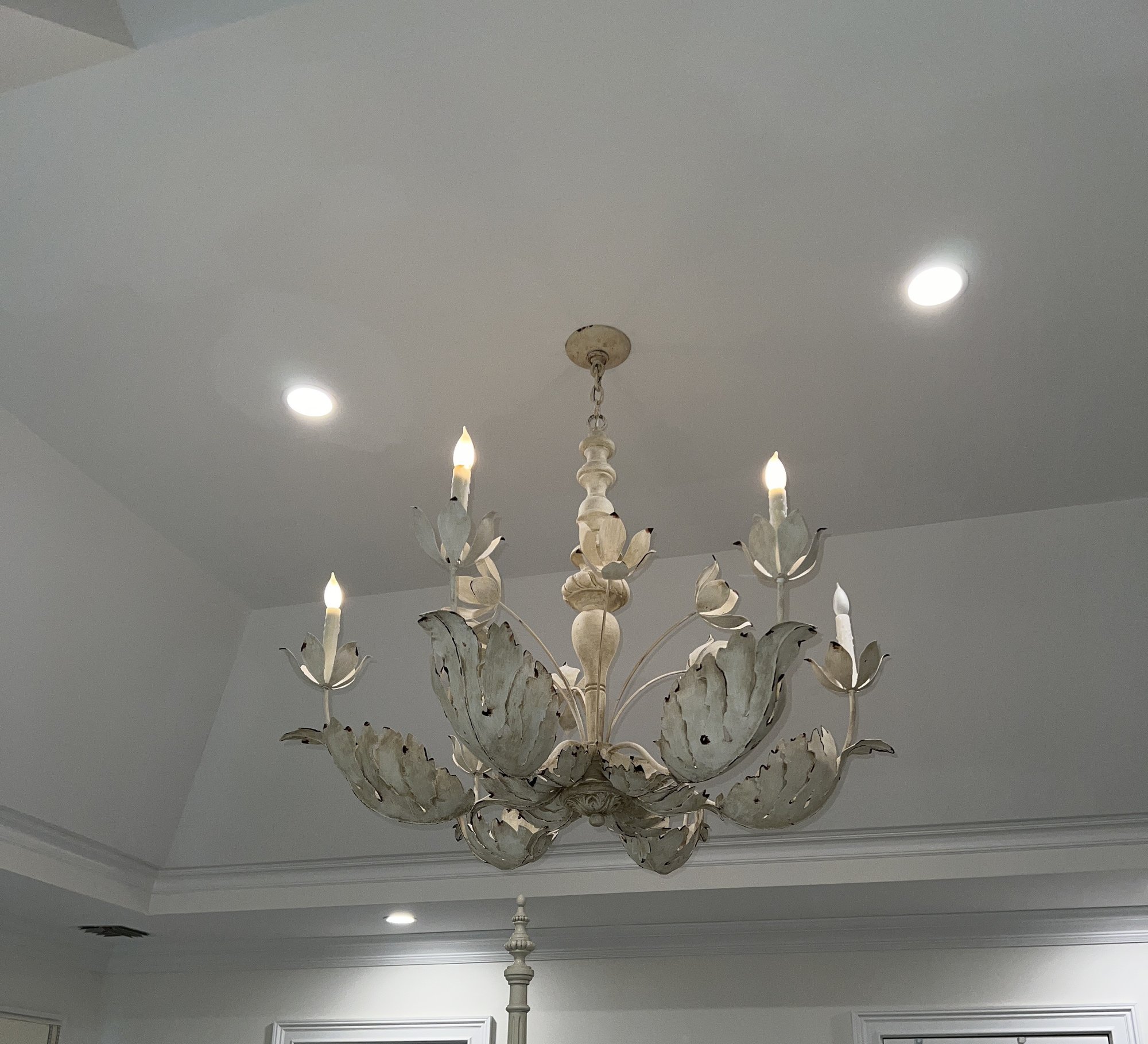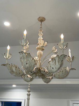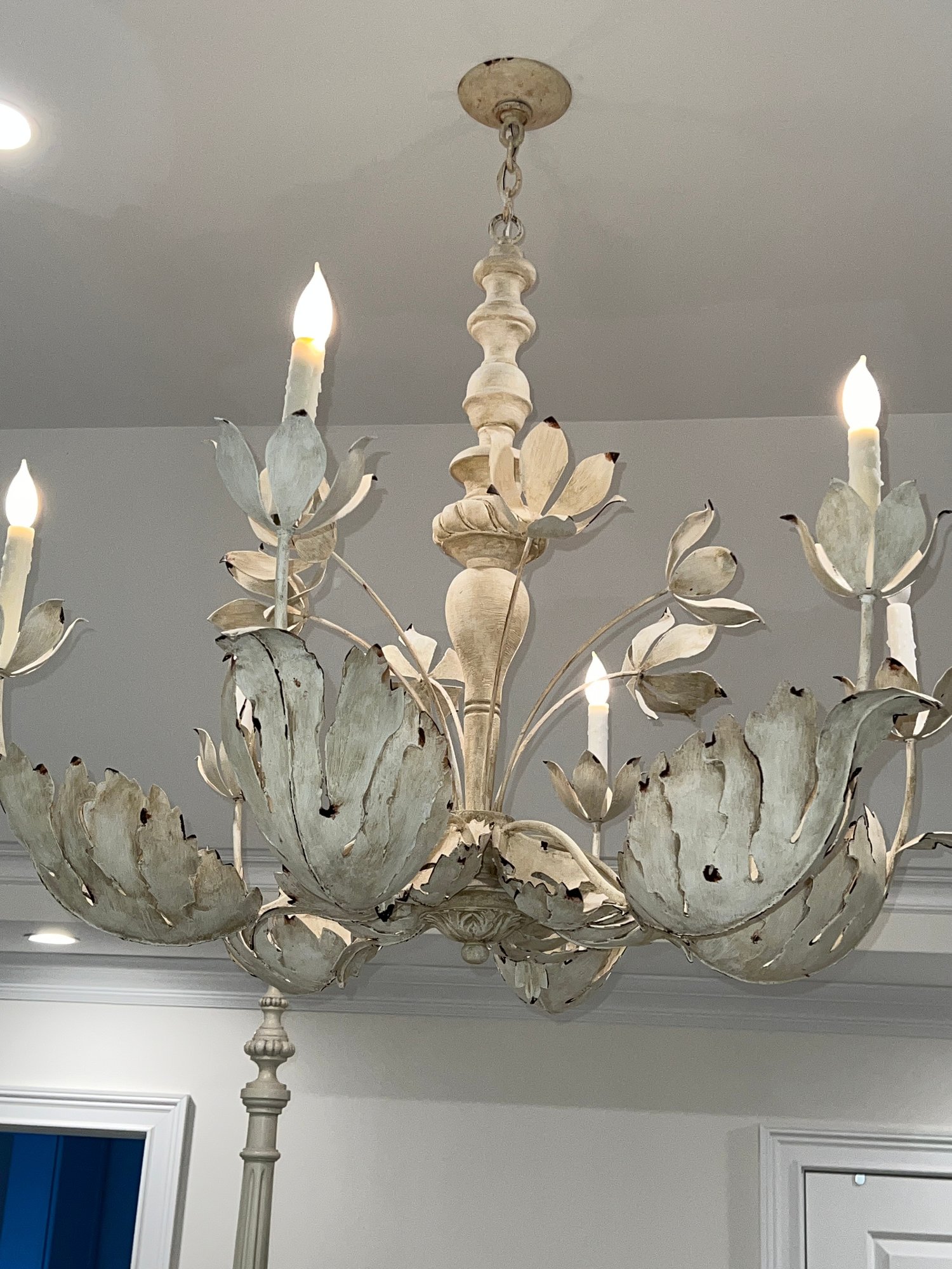 beautiful, distressed metal and composition with 6 light chandelier. Working when tested. The fixture will be taken down for pick up.