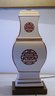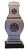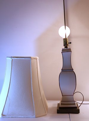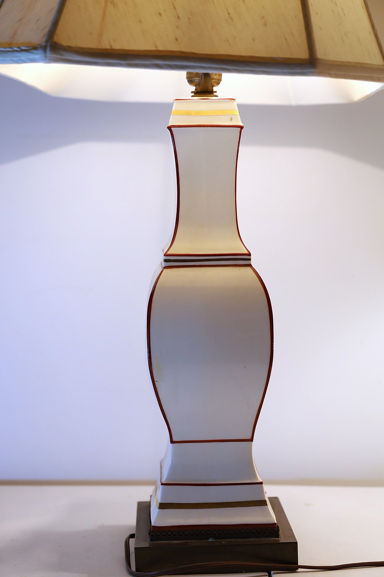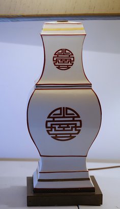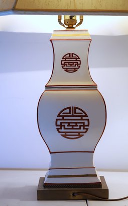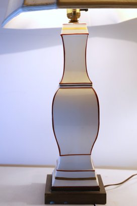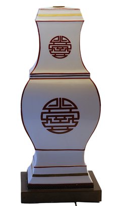 This classic table lamp boasts a cream, vase-shaped base adorned with a repeating, stylized blood-red and gold motif. It works when tested. The shade has some stains—see photos. 34"H