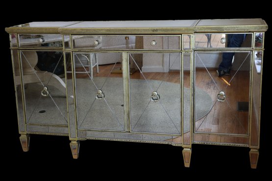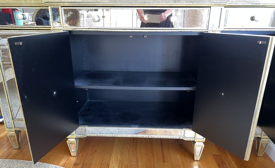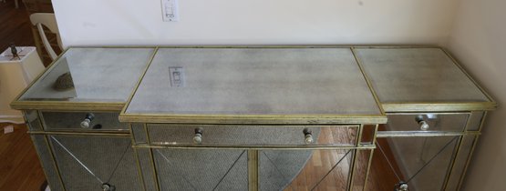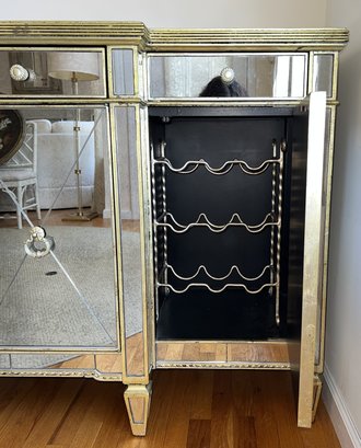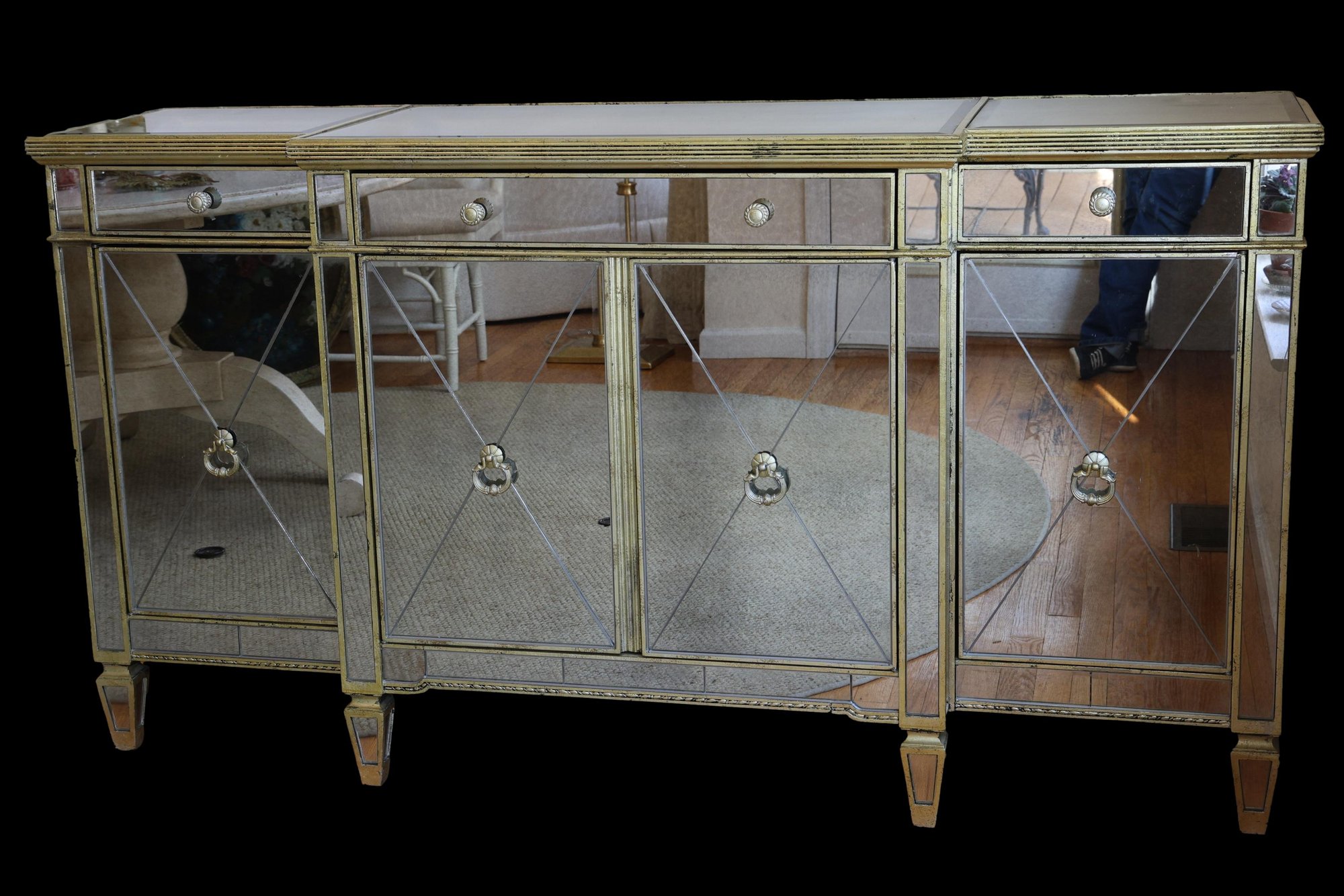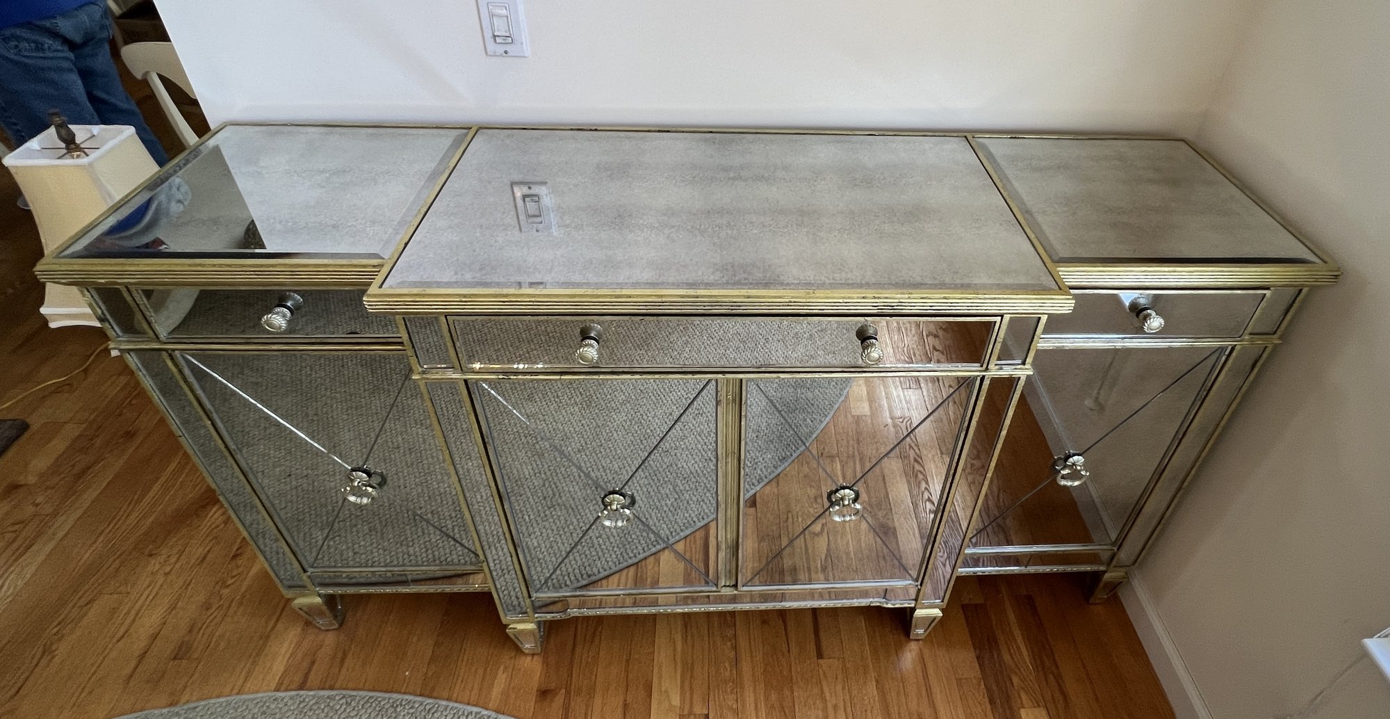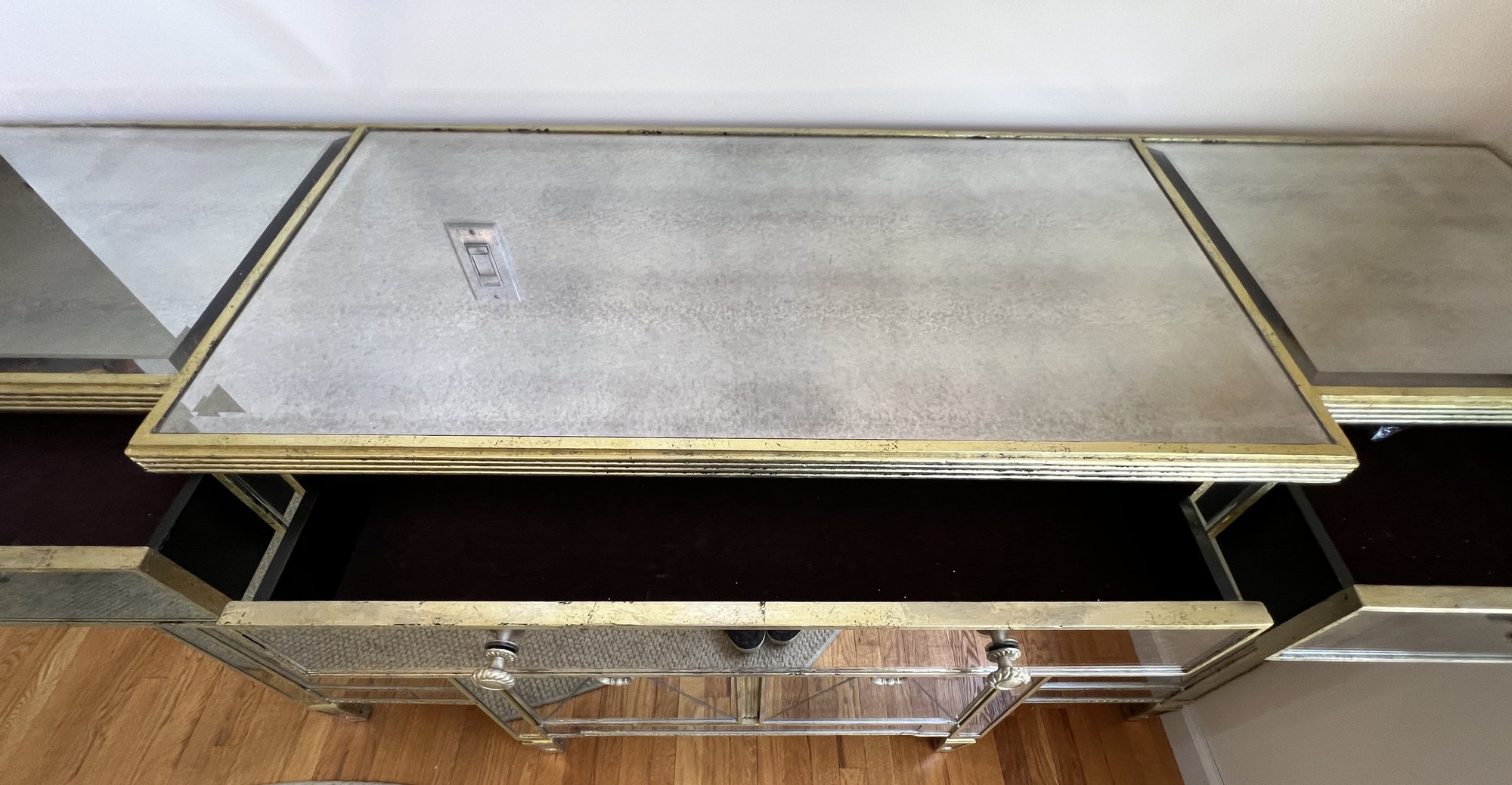 This stunning buffet features distressed gold gilt trim and showcases three drawers, including a long, center, felt-lined drawer and four doors that open to reveal shelves. One side cabinet contains a gold-painted, scrolled metal wine rack. Dimensions: 38.5"H x 69.75" W x 20.5"D. It is solid and sturdy.