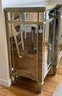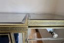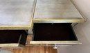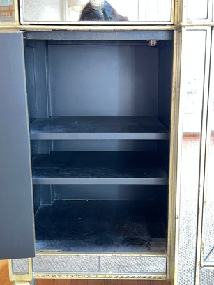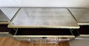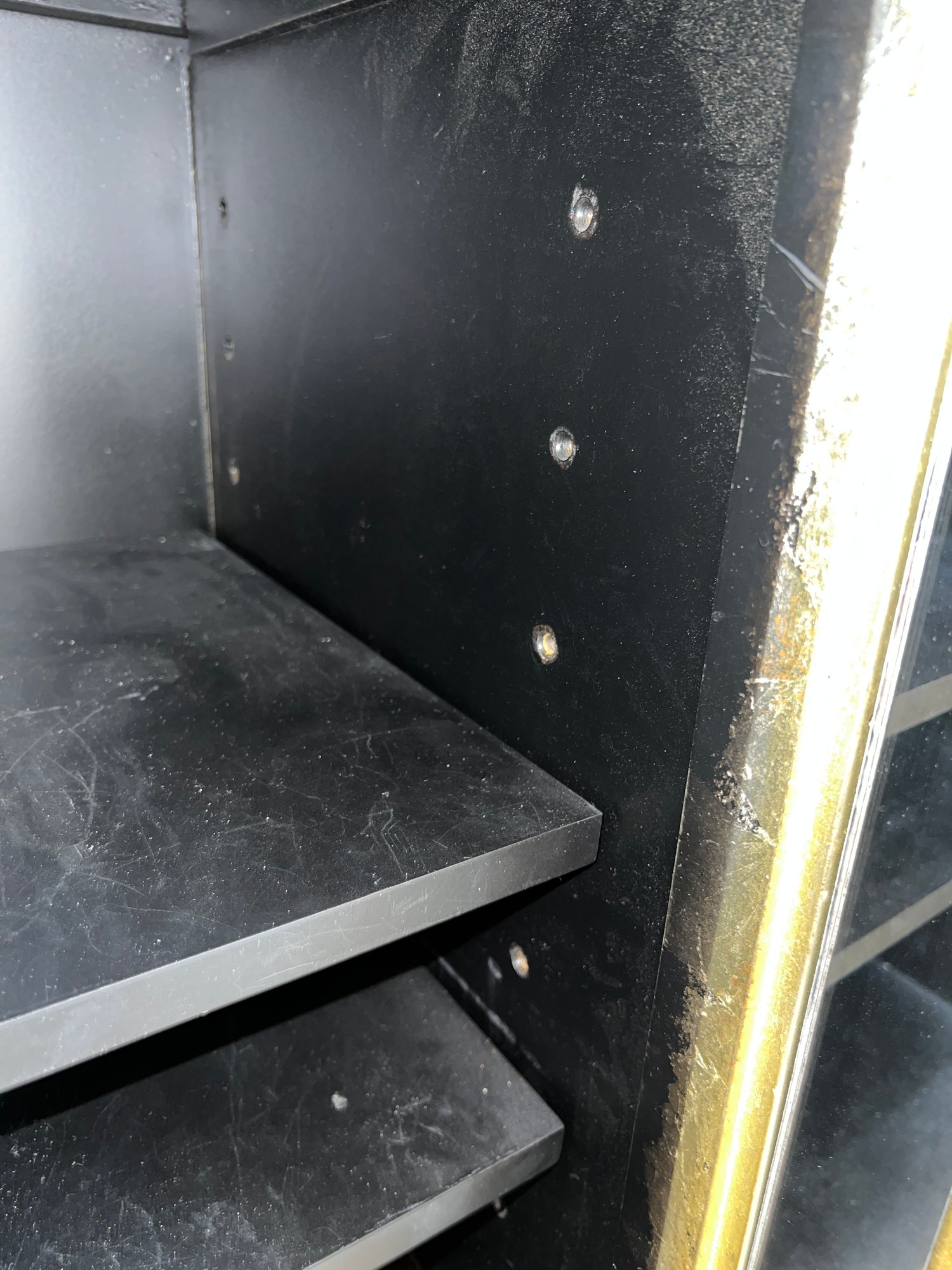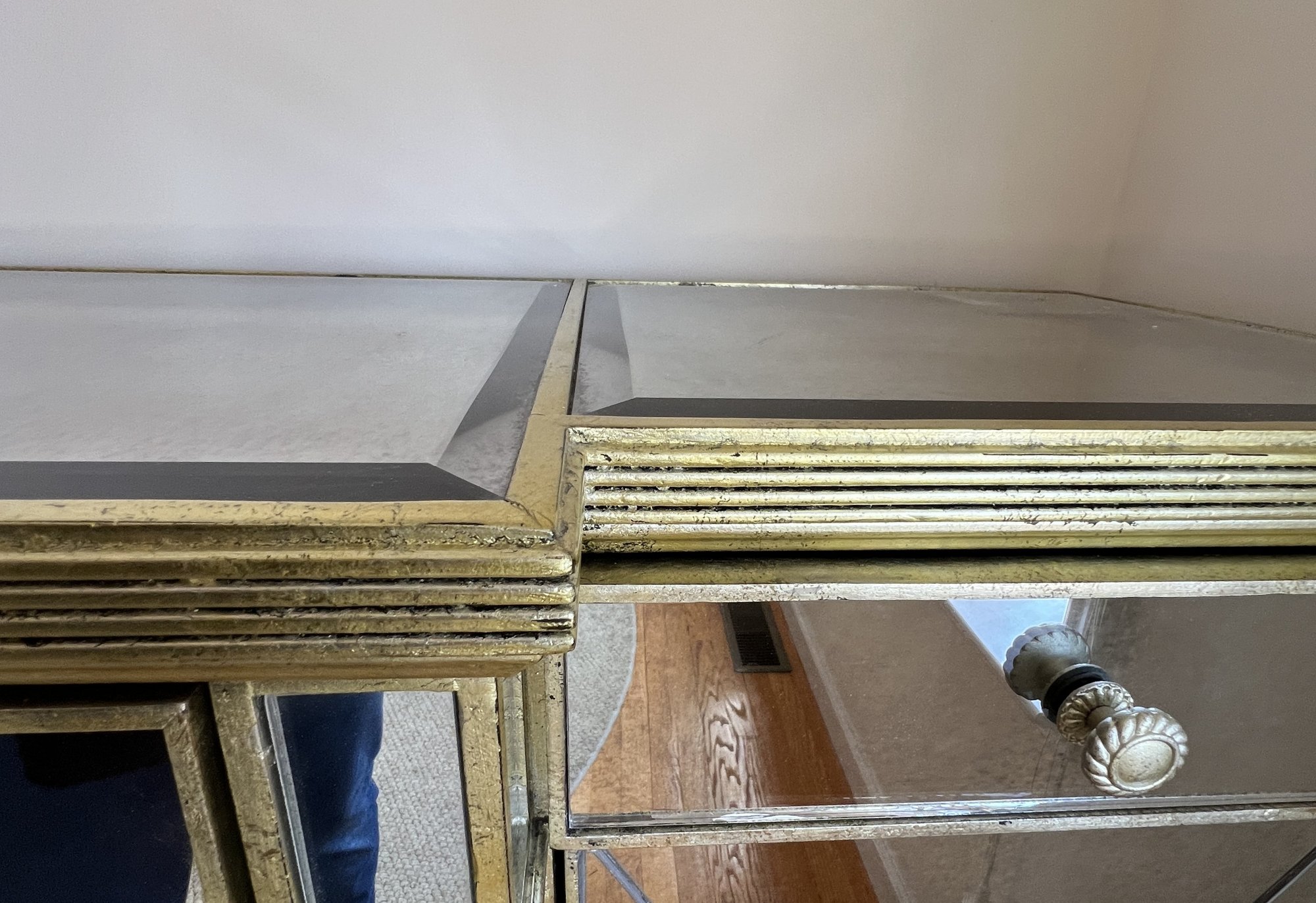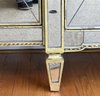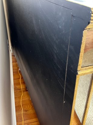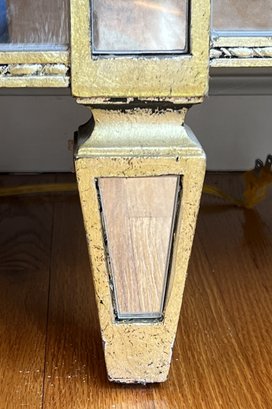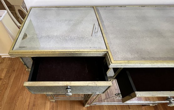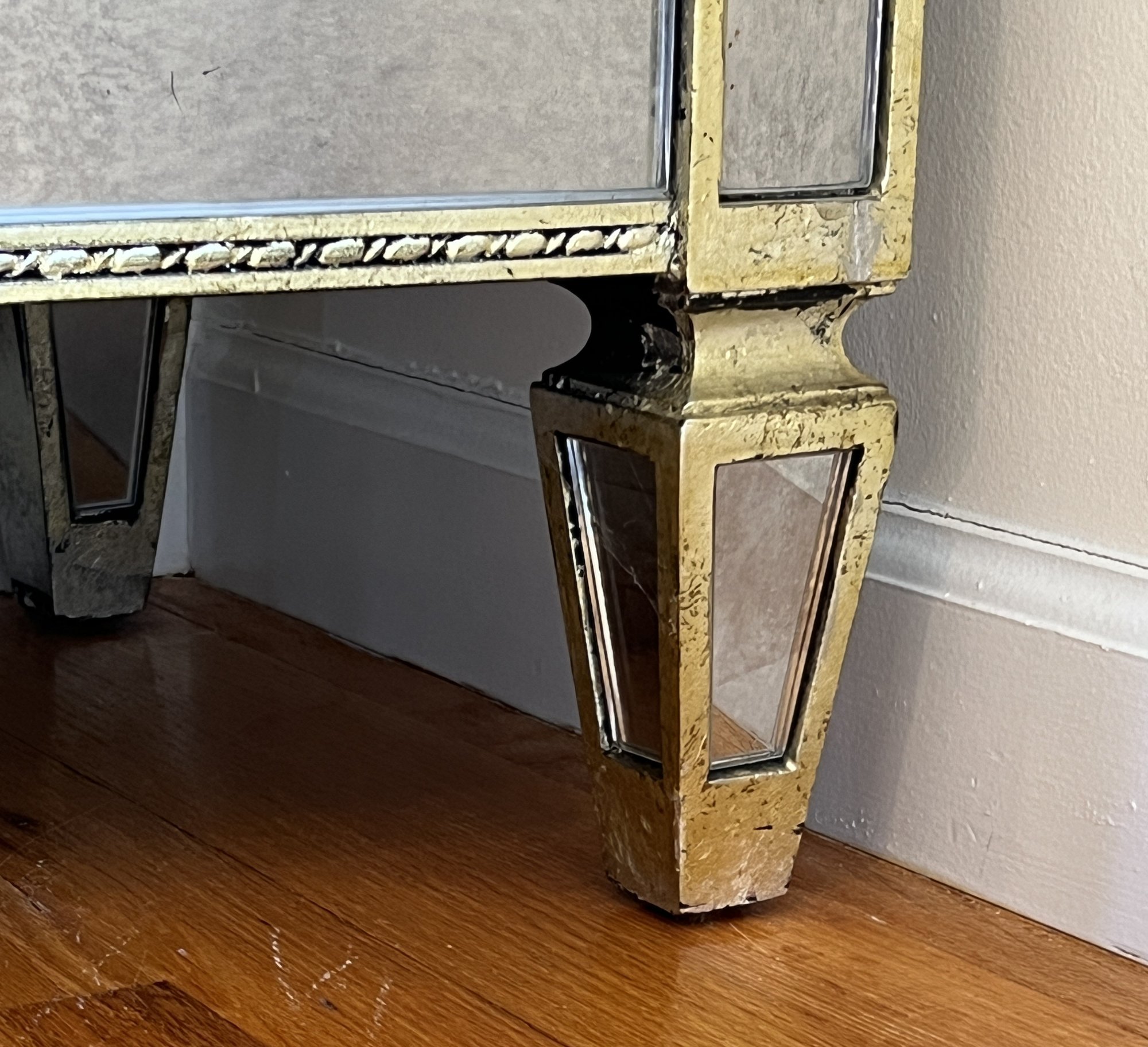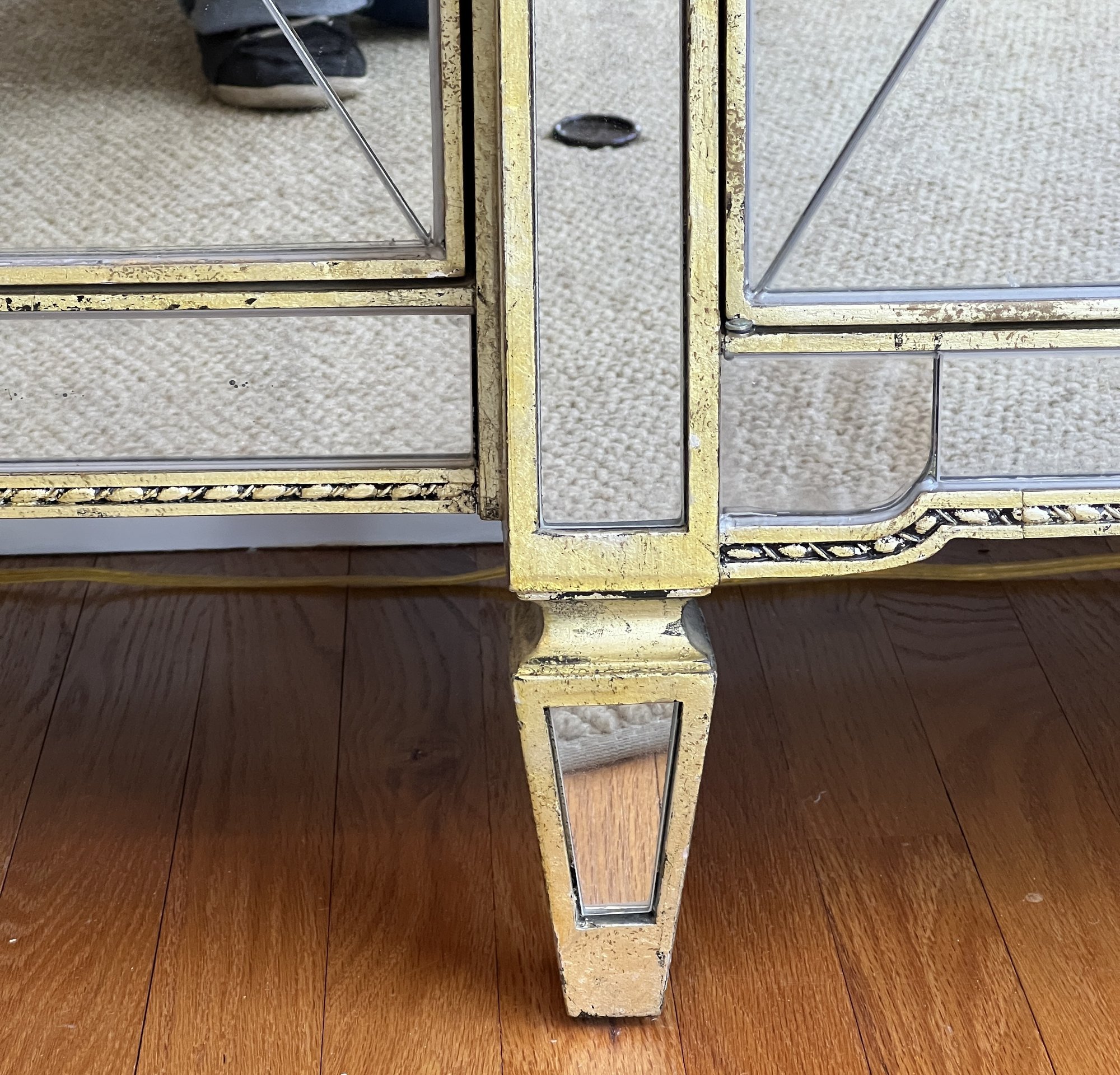 This stunning buffet features distressed gold gilt trim and showcases three drawers, including a long, center, felt-lined drawer and four doors that open to reveal shelves. One side cabinet contains a gold-painted, scrolled metal wine rack. Dimensions: 38.5"H x 69.75" W x 20.5"D. It is solid and sturdy.