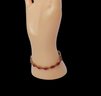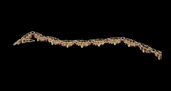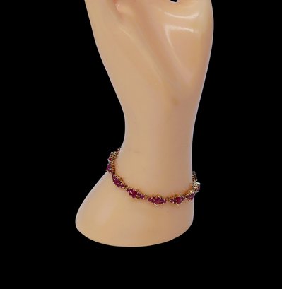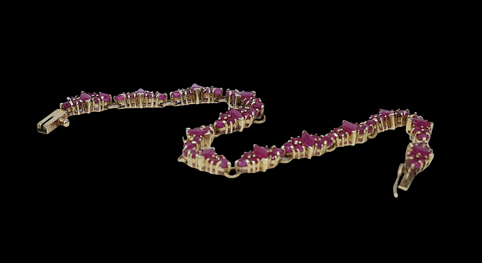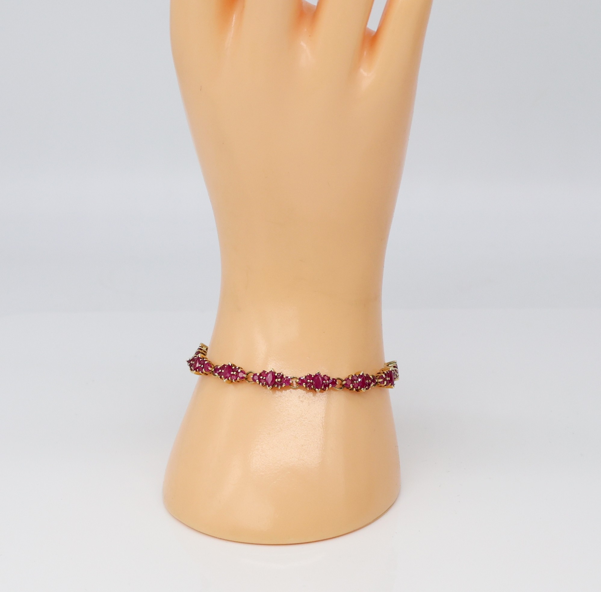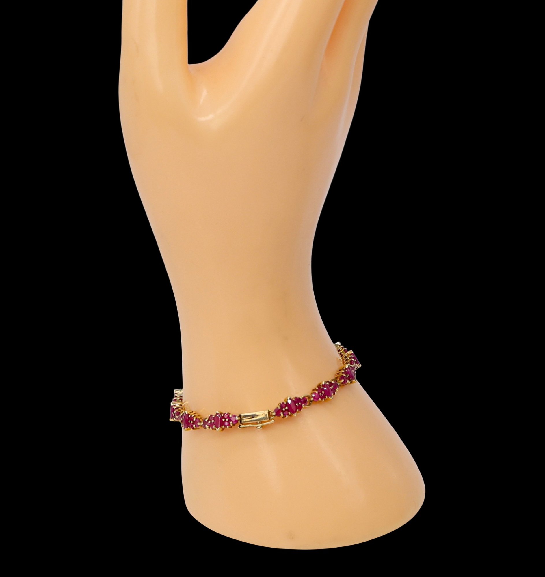 Made of 14kt yellow gold, the bracelet showcases clusters of marquise-cut rubies arranged in a repeating pattern along its length. It measures 7 inches long